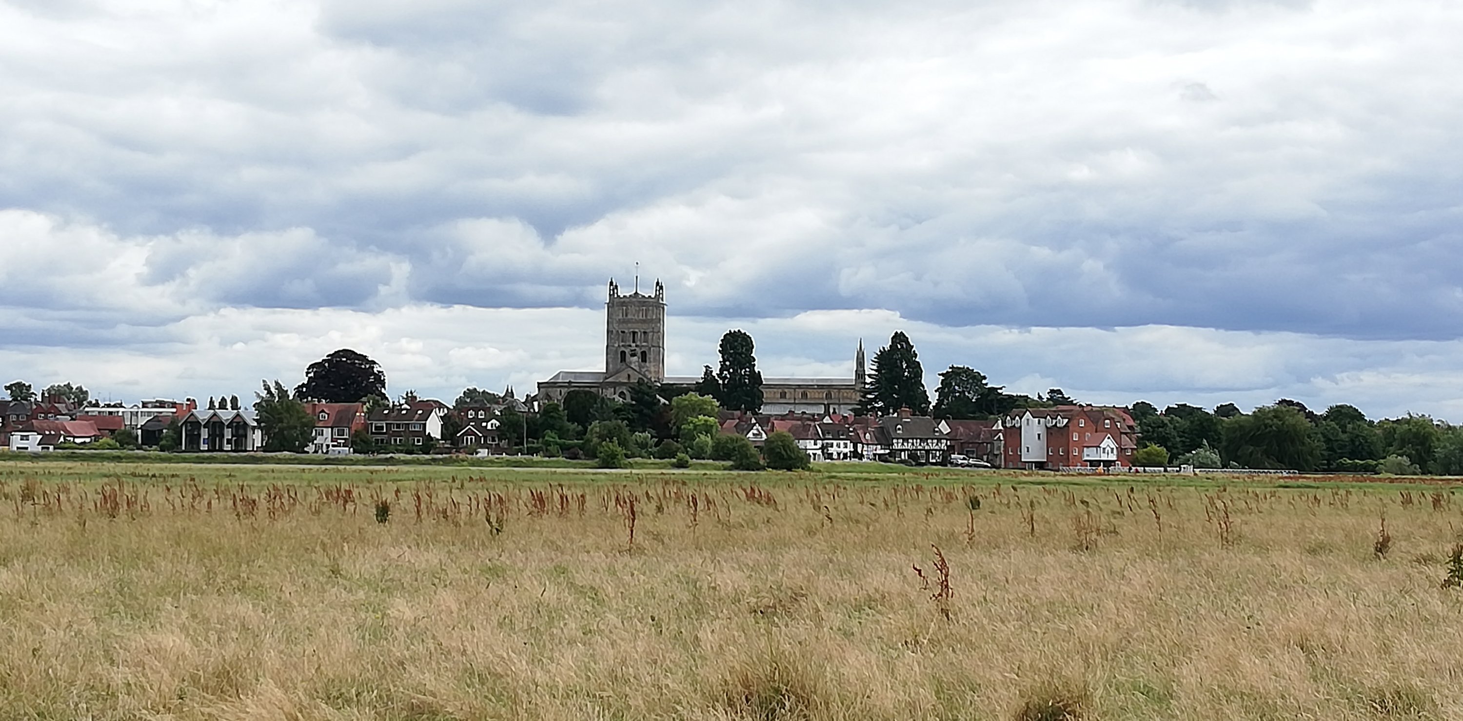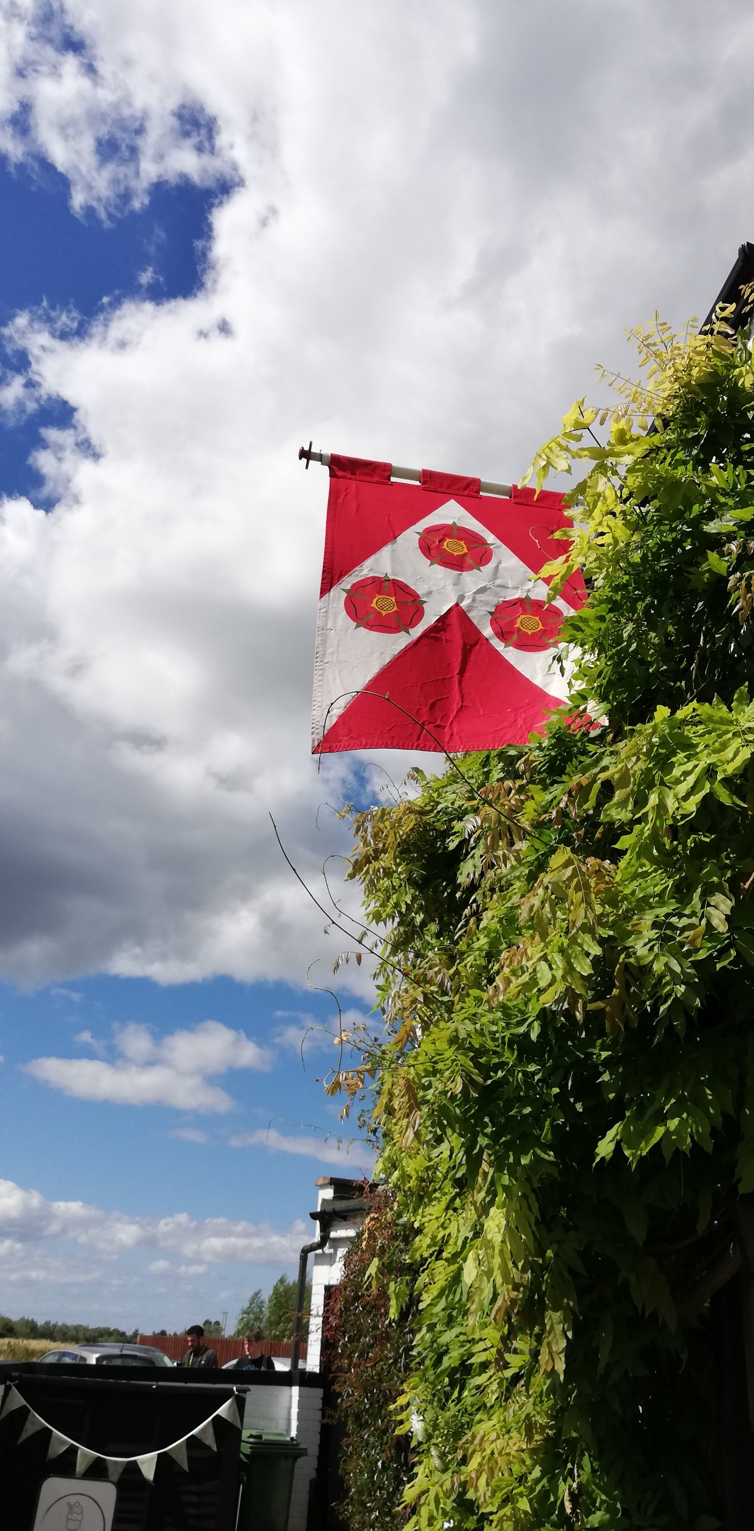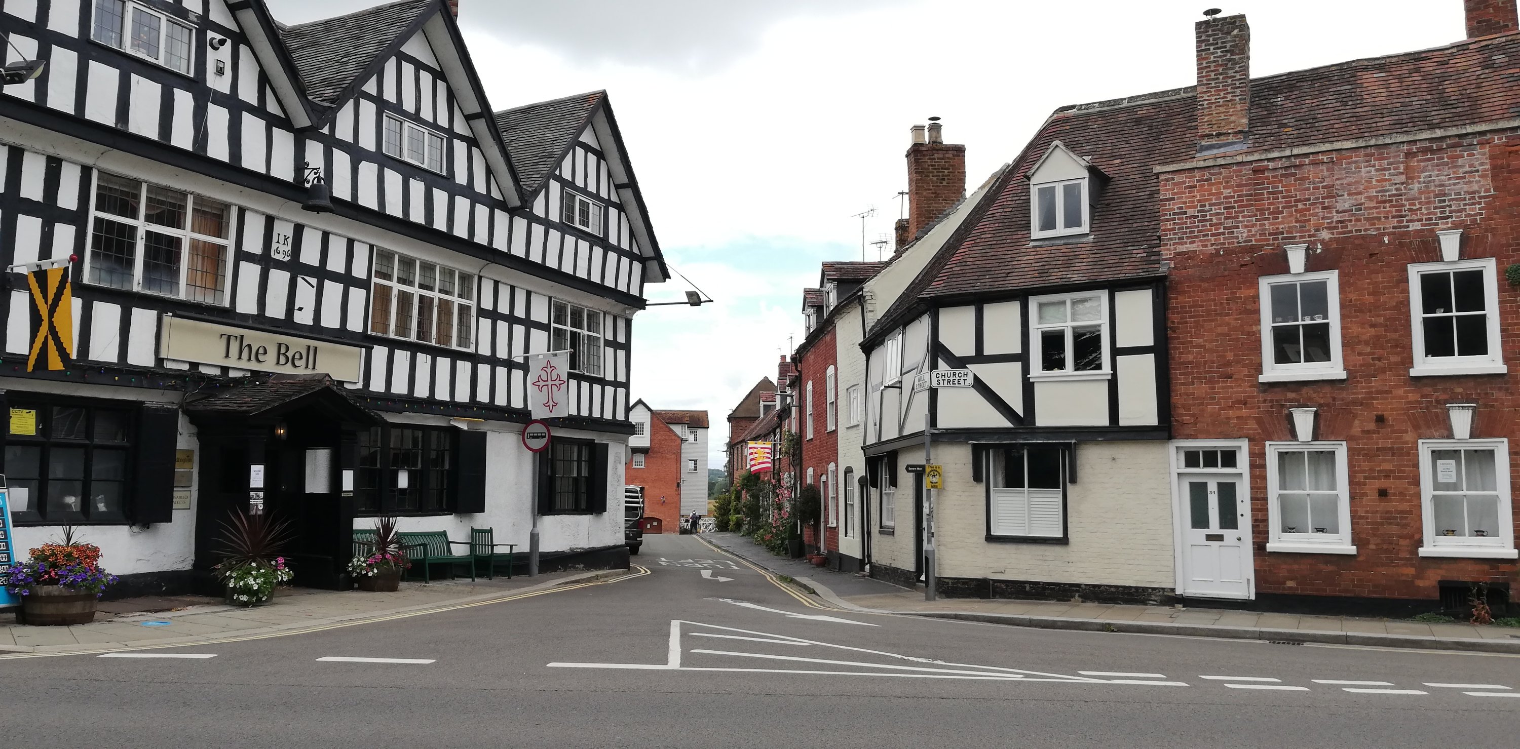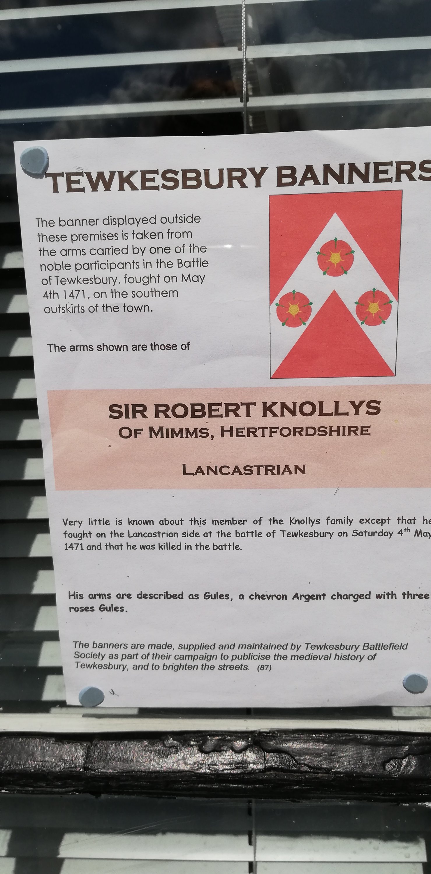 After a short wander around the high street which is much busier today, we treat ourselves to a rustic sausage roll which we take back to the van and enjoy for lunch. Hanging above the shops and houses are colourful banners that represent the participants in the Battle of Tewkesbury in 1471. We spot only one with red roses, obviously belonging to a Lancastrian on the losing side 🙃.