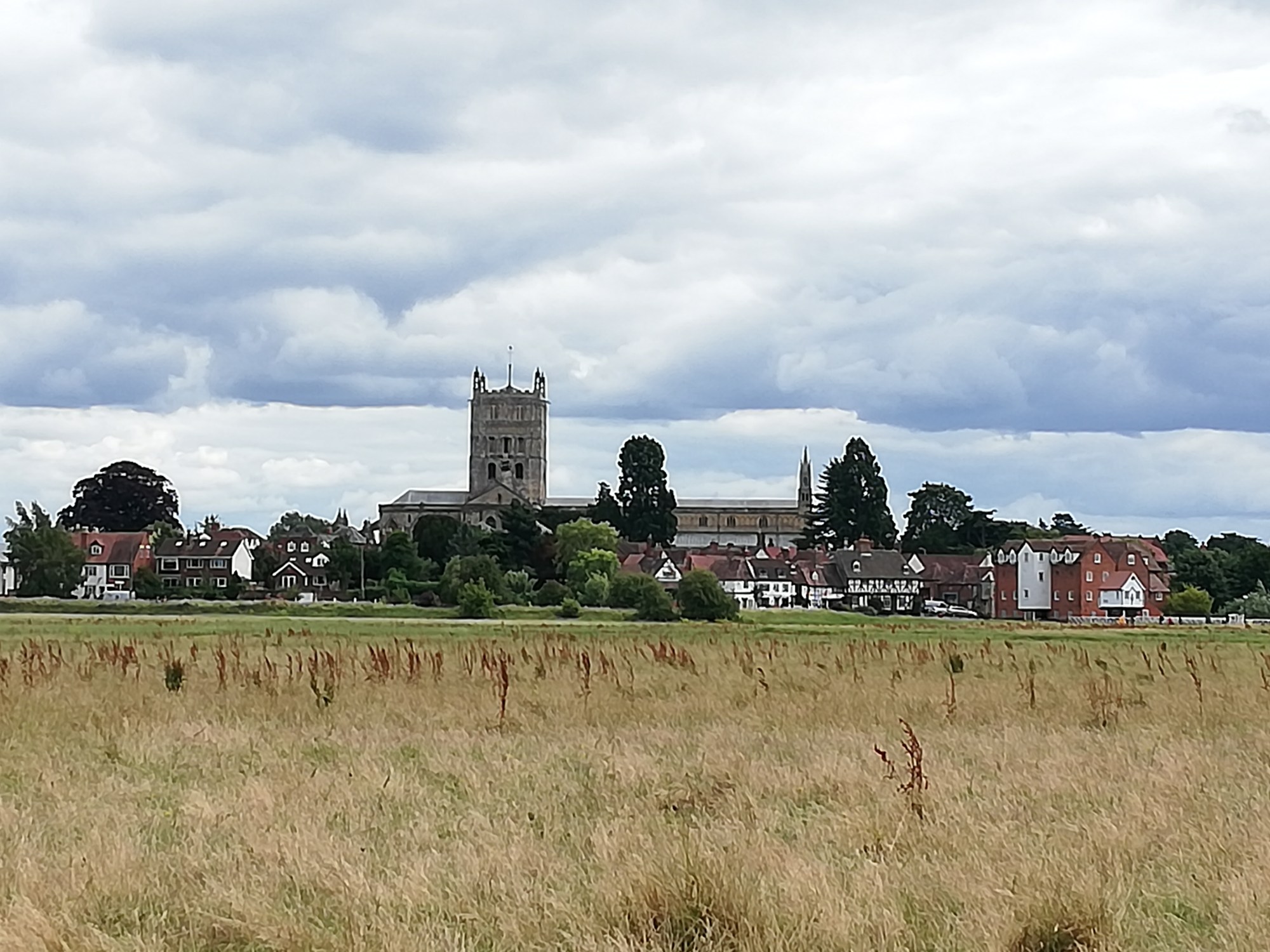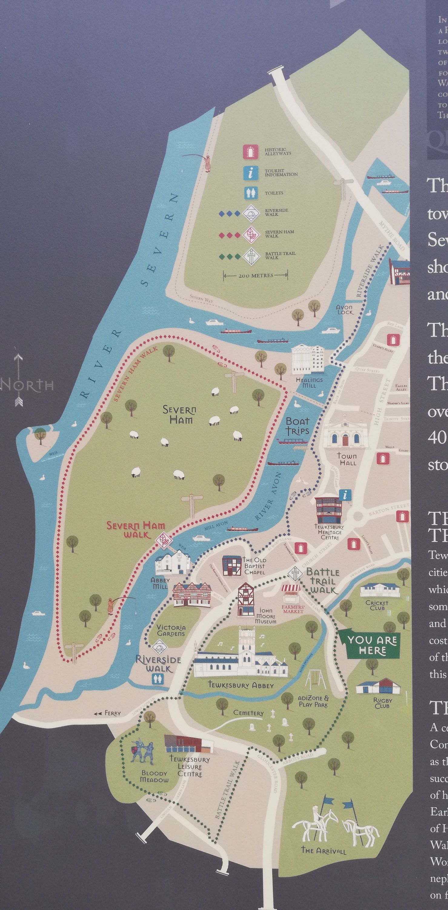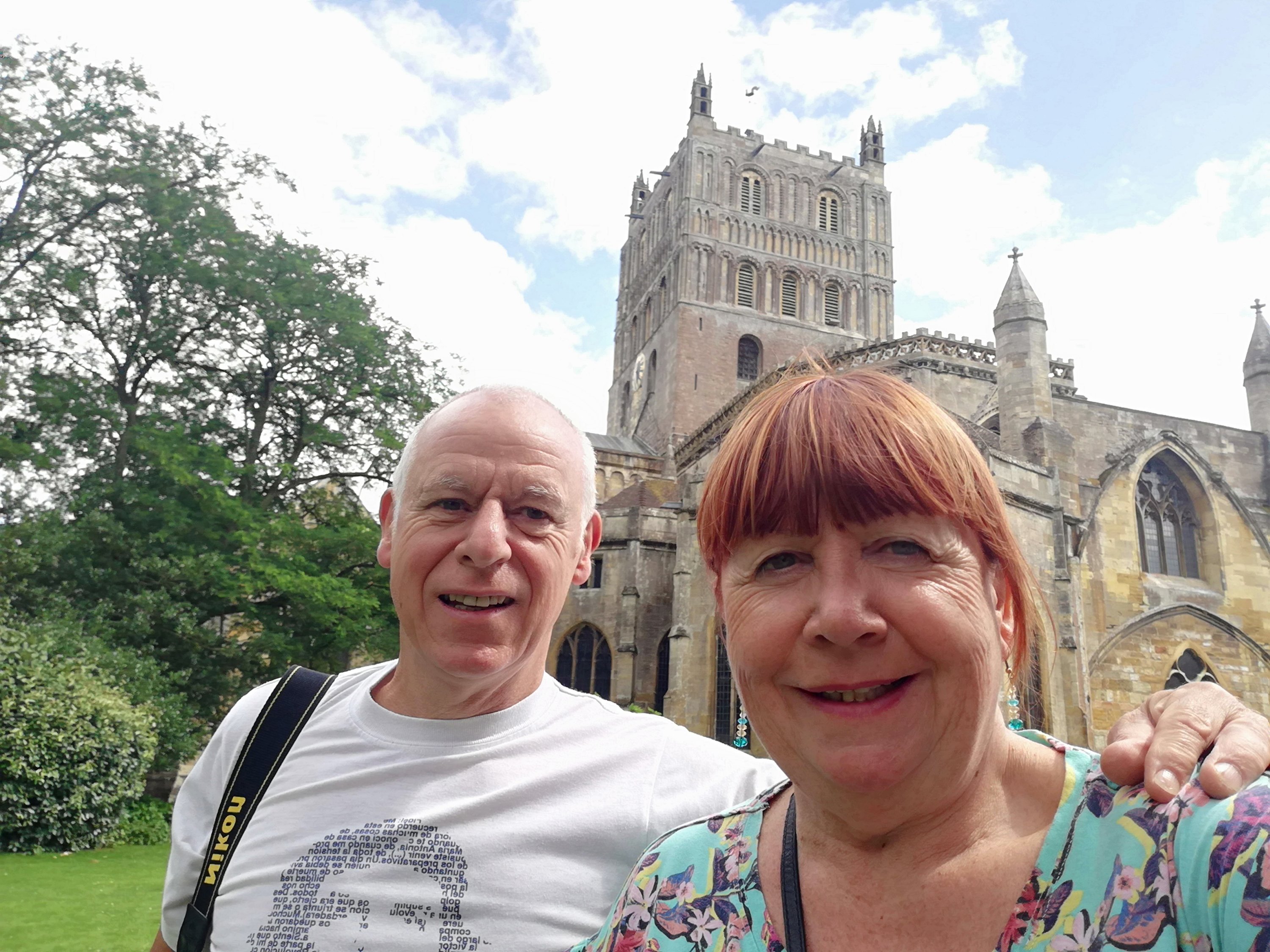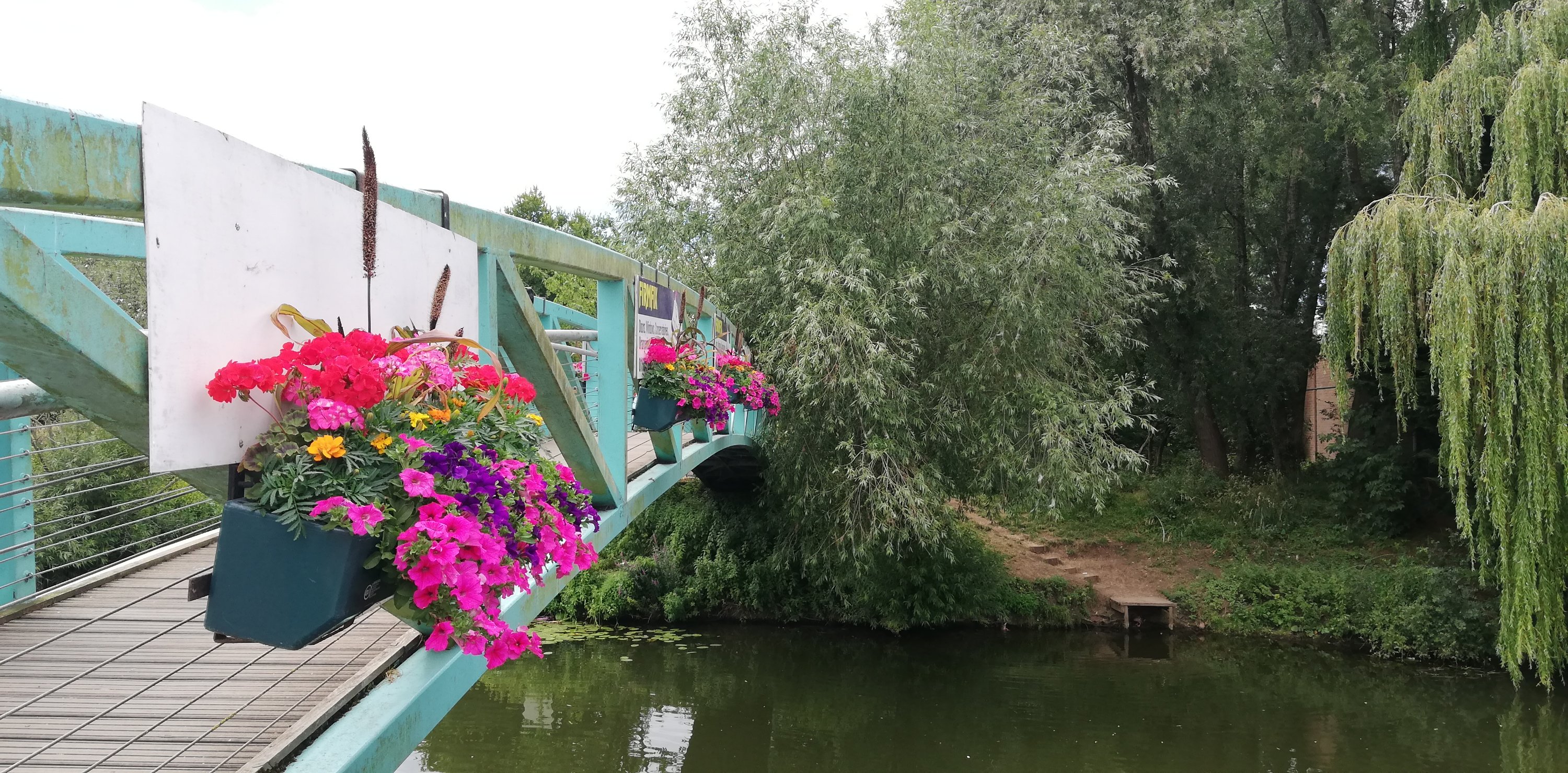 After a short wander around the high street which is much busier today, we treat ourselves to a rustic sausage roll which we take back to the van and enjoy for lunch. Hanging above the shops and houses are colourful banners that represent the participants in the Battle of Tewkesbury in 1471. We spot only one with red roses, obviously belonging to a Lancastrian on the losing side 🙃.