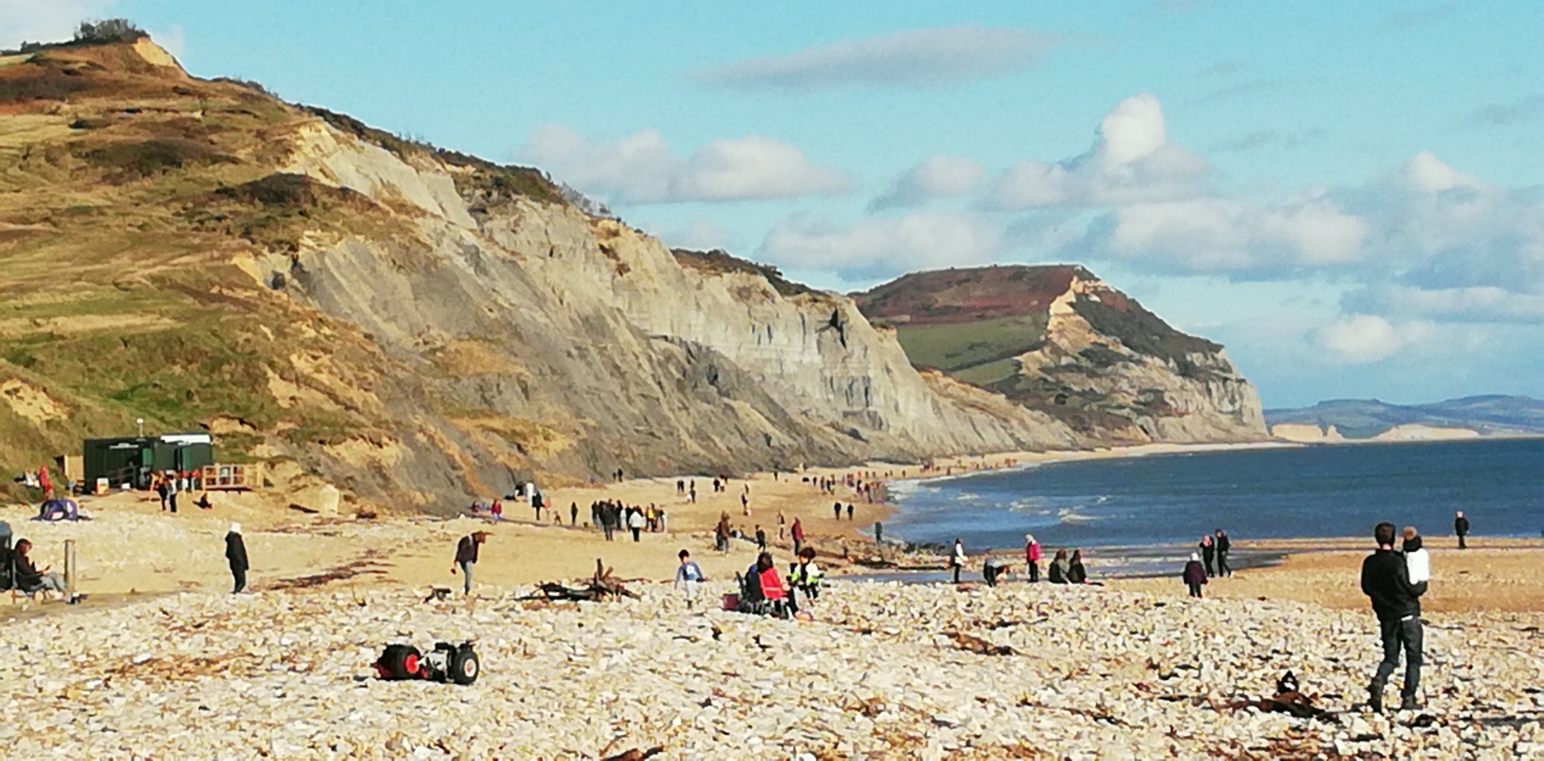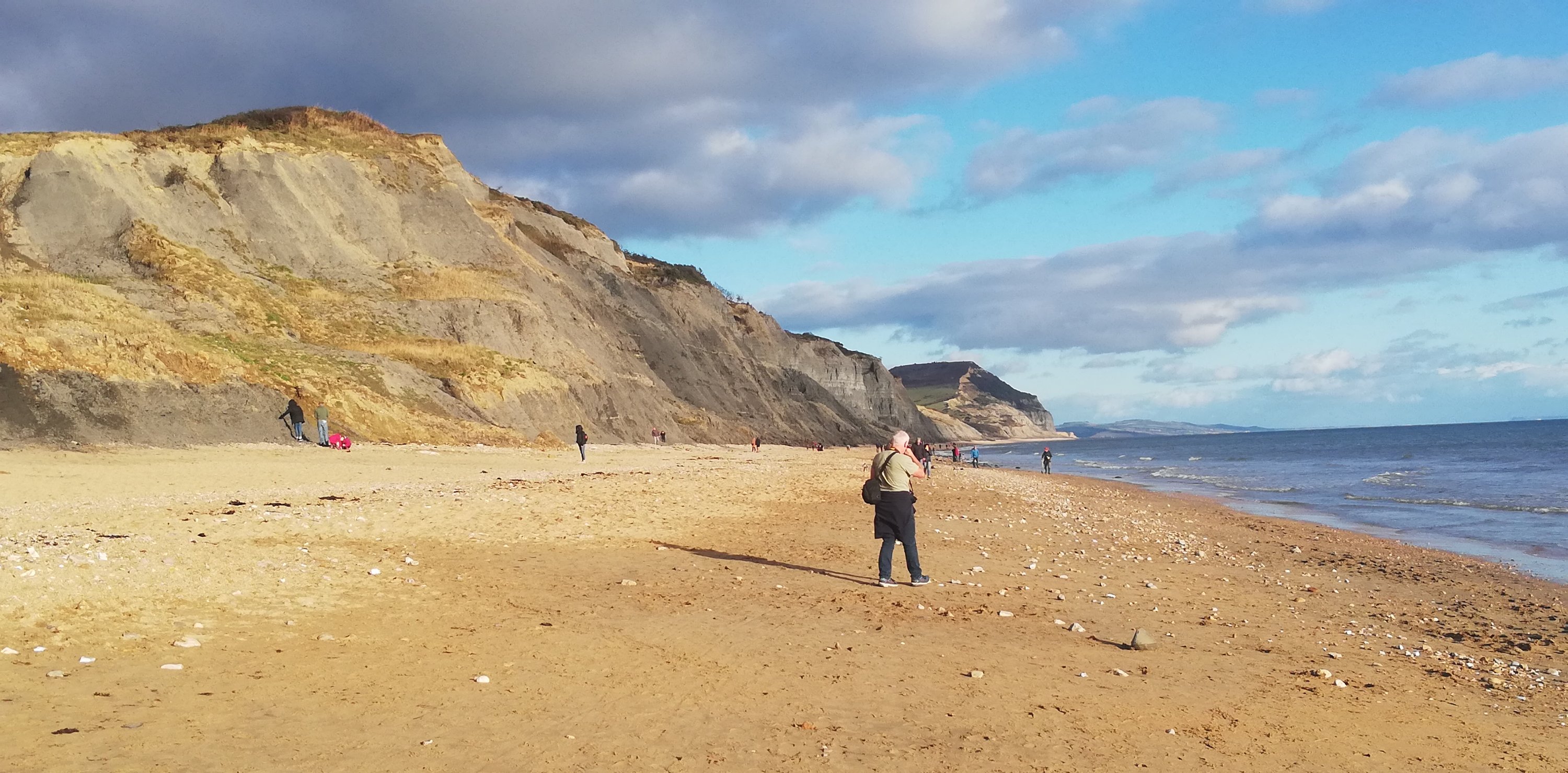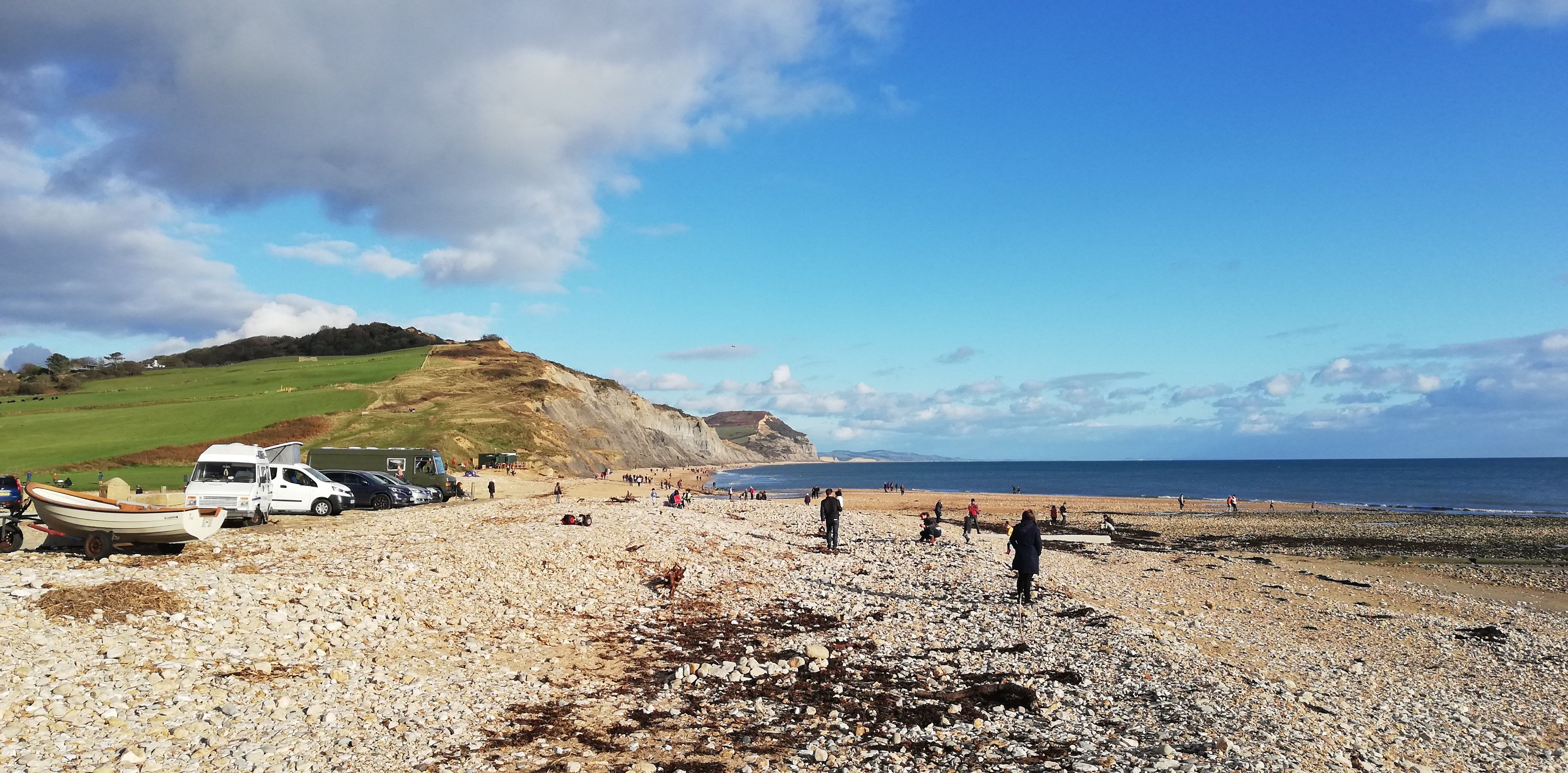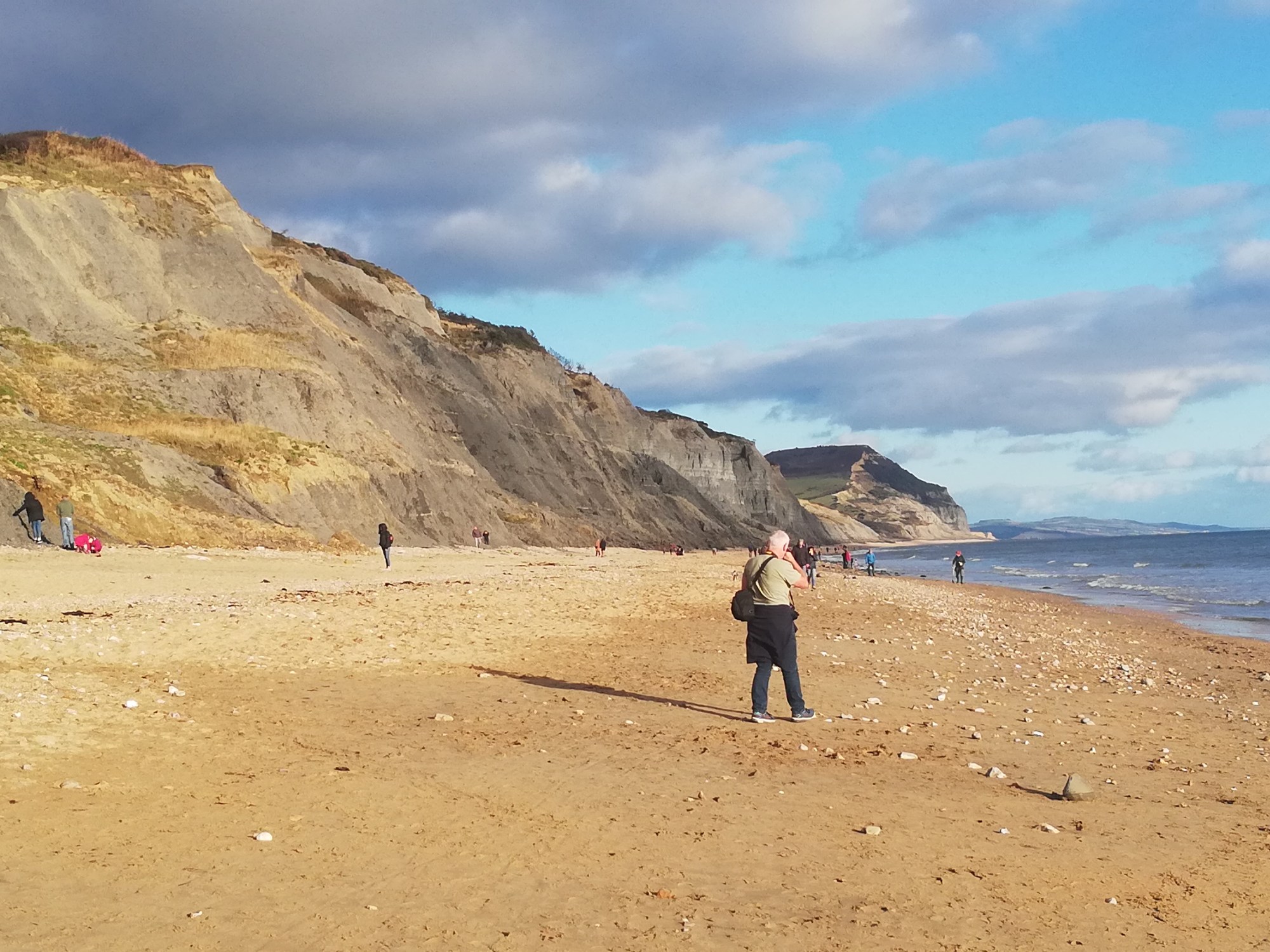 We follow the road signs to the beach which is much busier, cross the bridge over the river and wander along the sand. It’s a beautiful bay, really huge and sweeping with fantastic rock formations and lots of different layers visible. There’s what looks like shale on the ground that is so soft it breaks up just with your fingers. There are loads of people fossil hunting too. I find a stone that isn’t a fossil but has a great pattern on it. We can clearly see Golden Cap from here, the highest point on the Jurassic Coast.