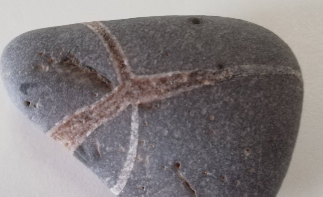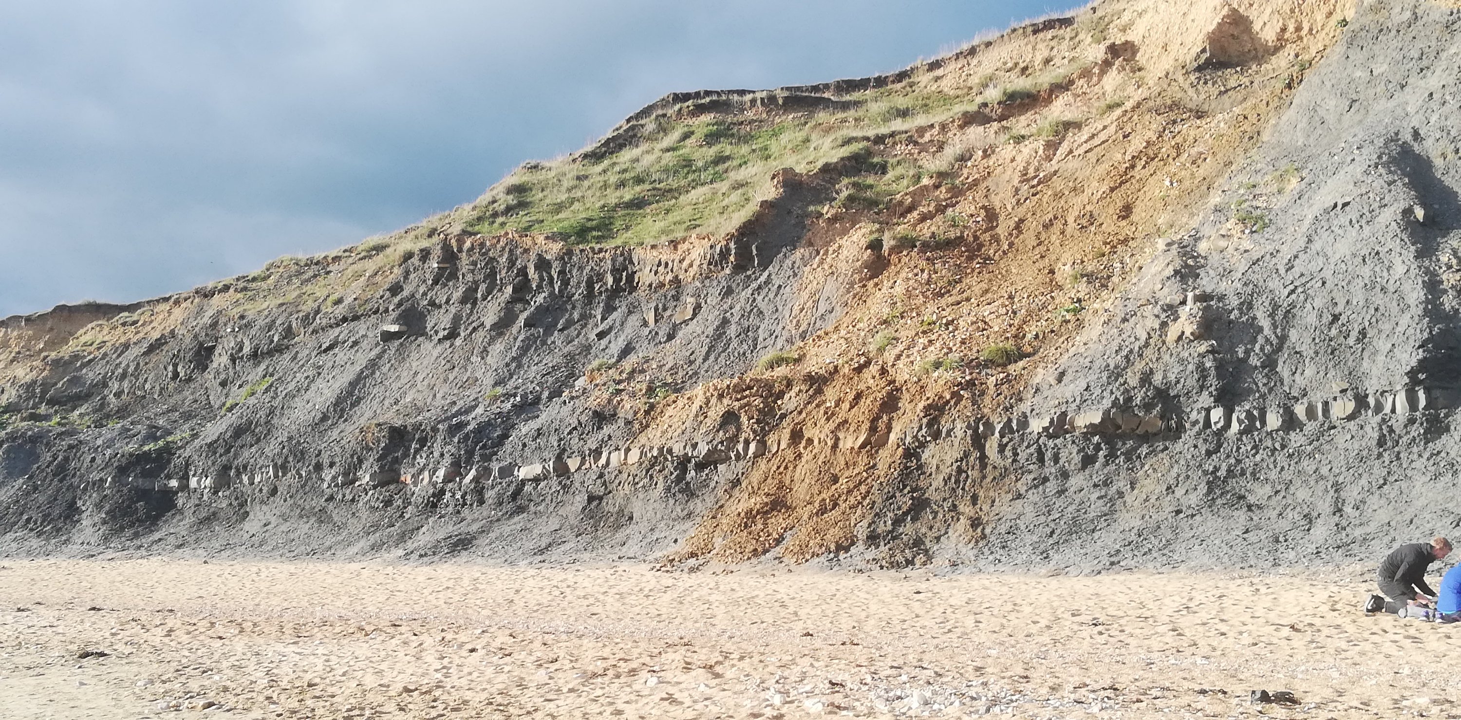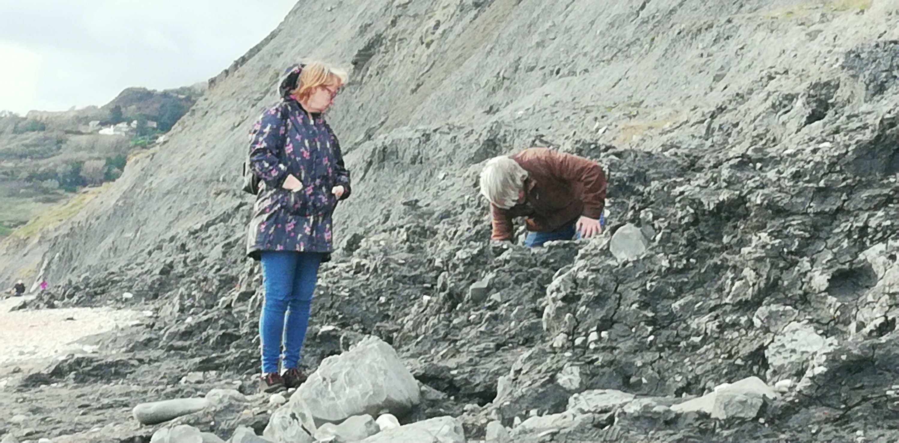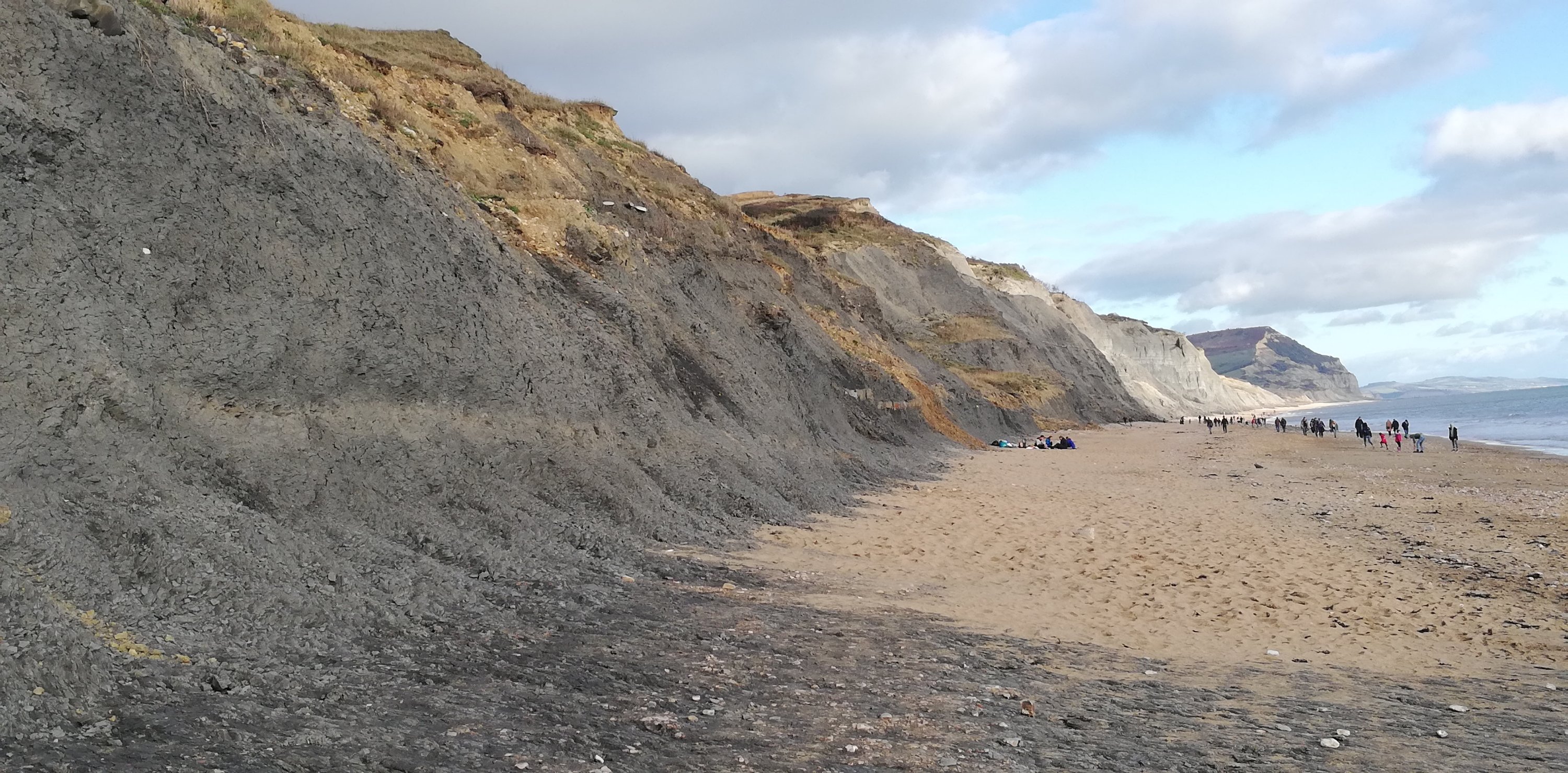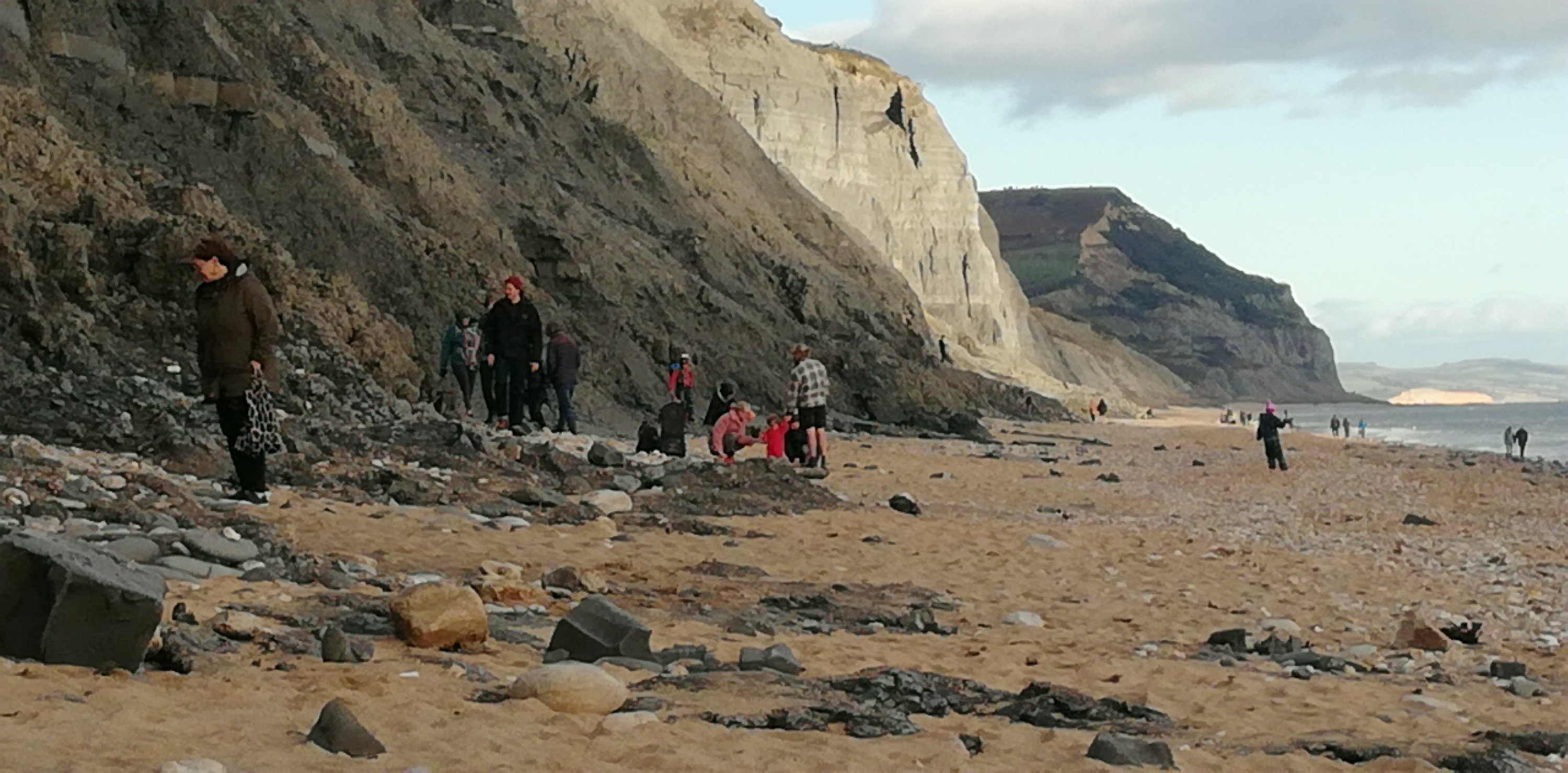 We follow the road signs to the beach which is much busier, cross the bridge over the river and wander along the sand. It’s a beautiful bay, really huge and sweeping with fantastic rock formations and lots of different layers visible. There’s what looks like shale on the ground that is so soft it breaks up just with your fingers. There are loads of people fossil hunting too. I find a stone that isn’t a fossil but has a great pattern on it. We can clearly see Golden Cap from here, the highest point on the Jurassic Coast.