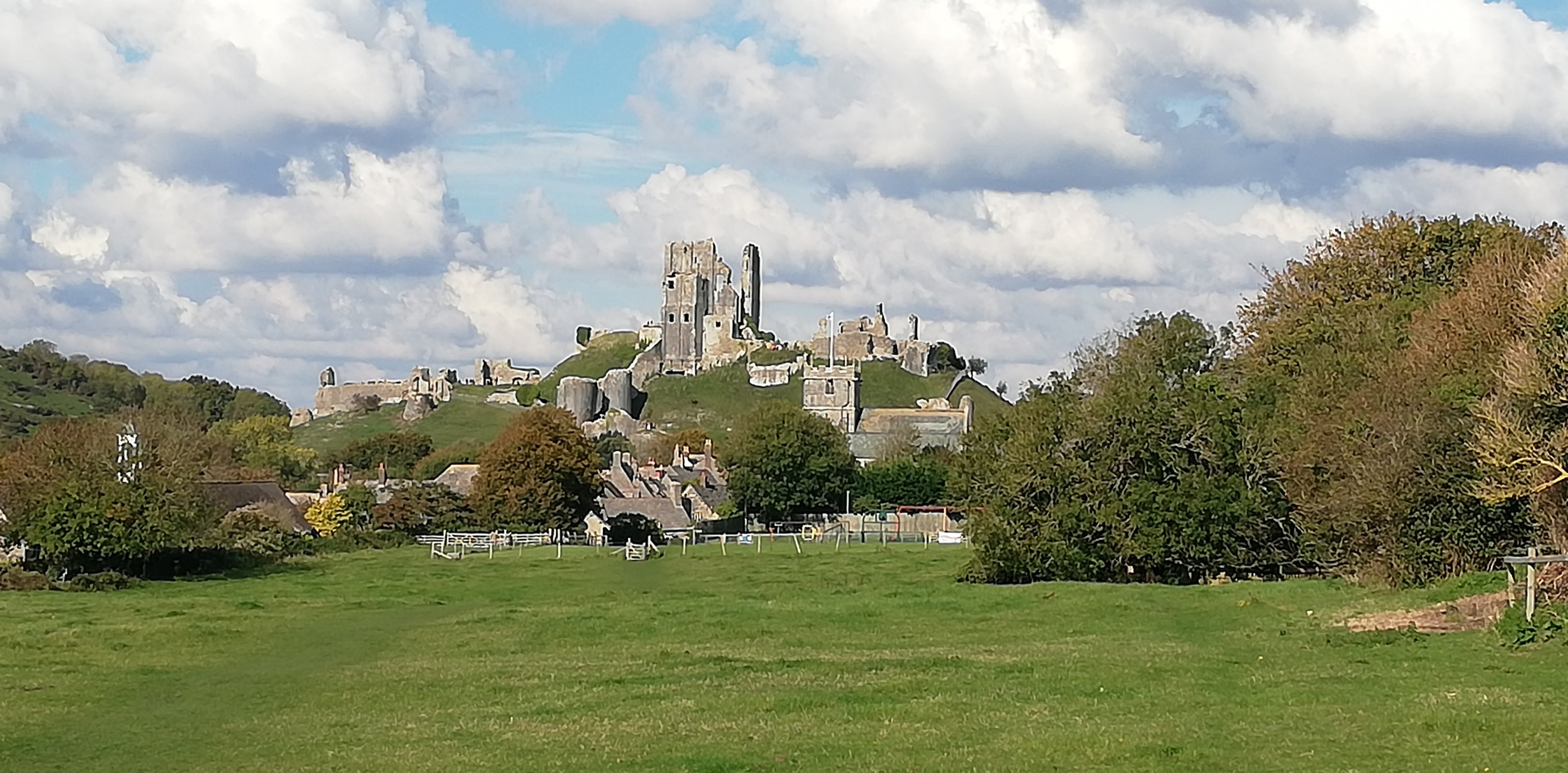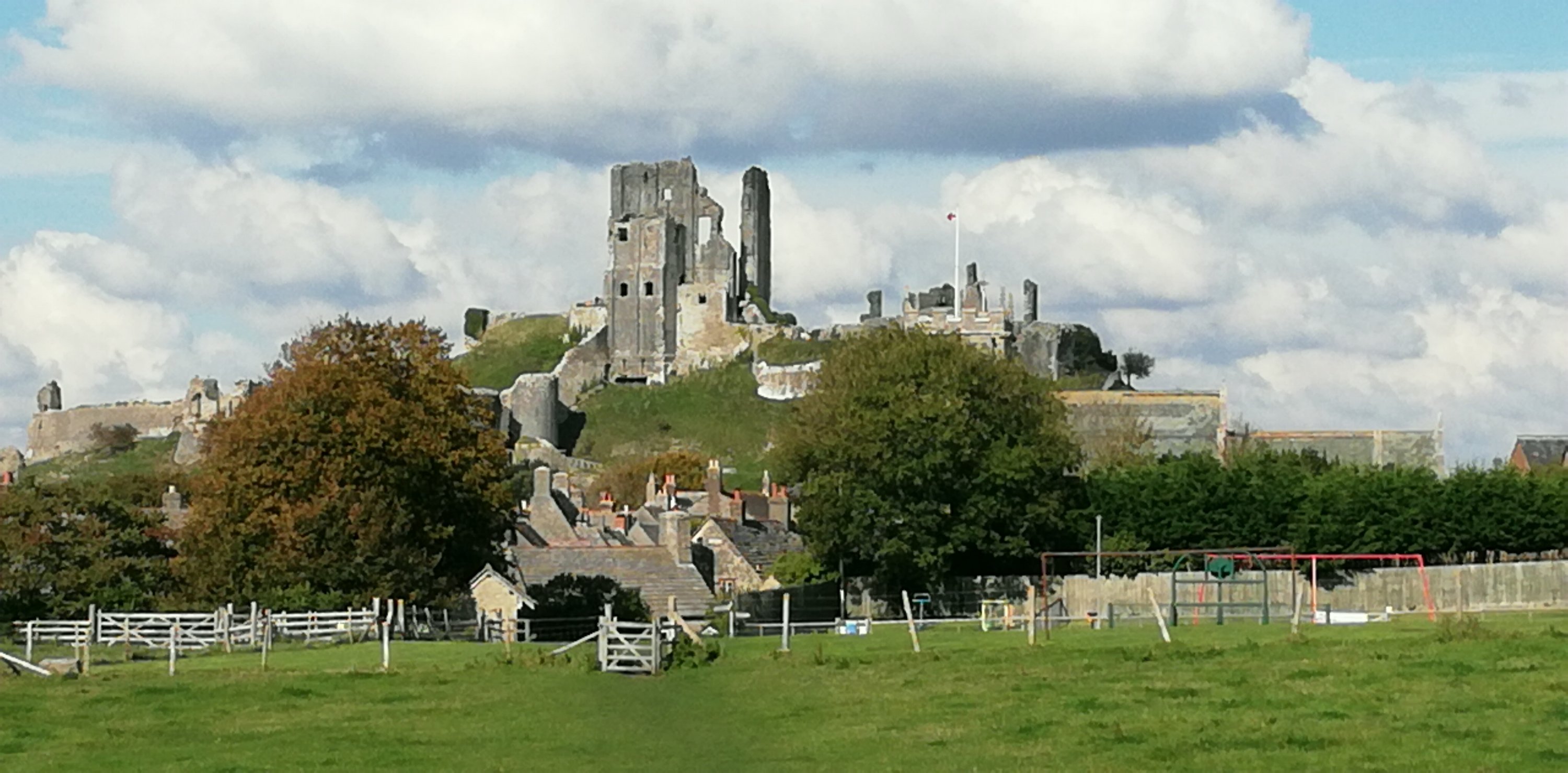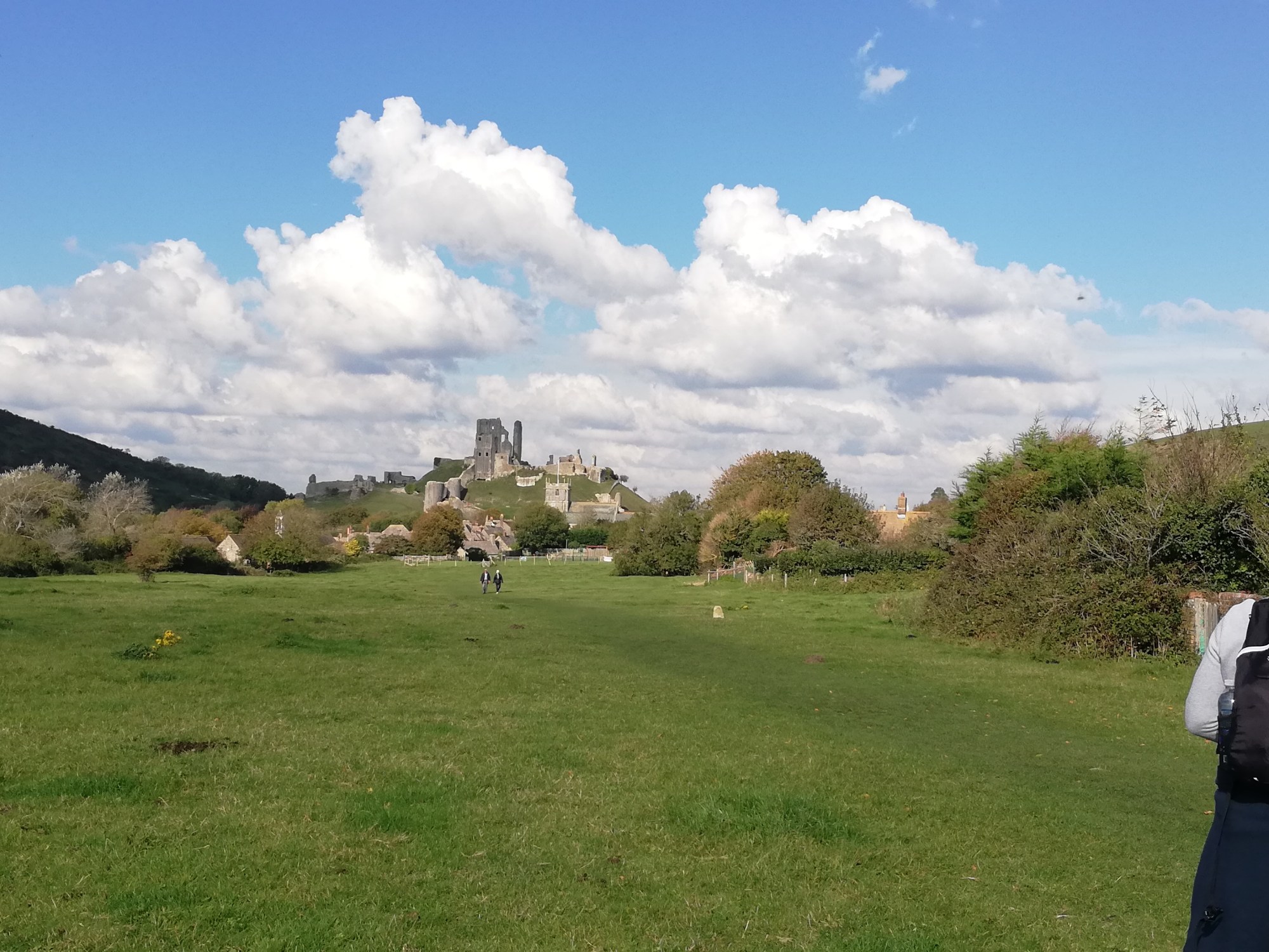 As we are pitching up a train passes us, literally behind our pitch. It’s supposed to be a steam train but today it’s an old diesel pulling old fashioned carriages. Sadly not quick enough to get a picture. After putting on our walking pants and shoes we walk to Corfe Castle. It’s a wonderful route mainly across fields and Corfe Common with only a very short section on the road.