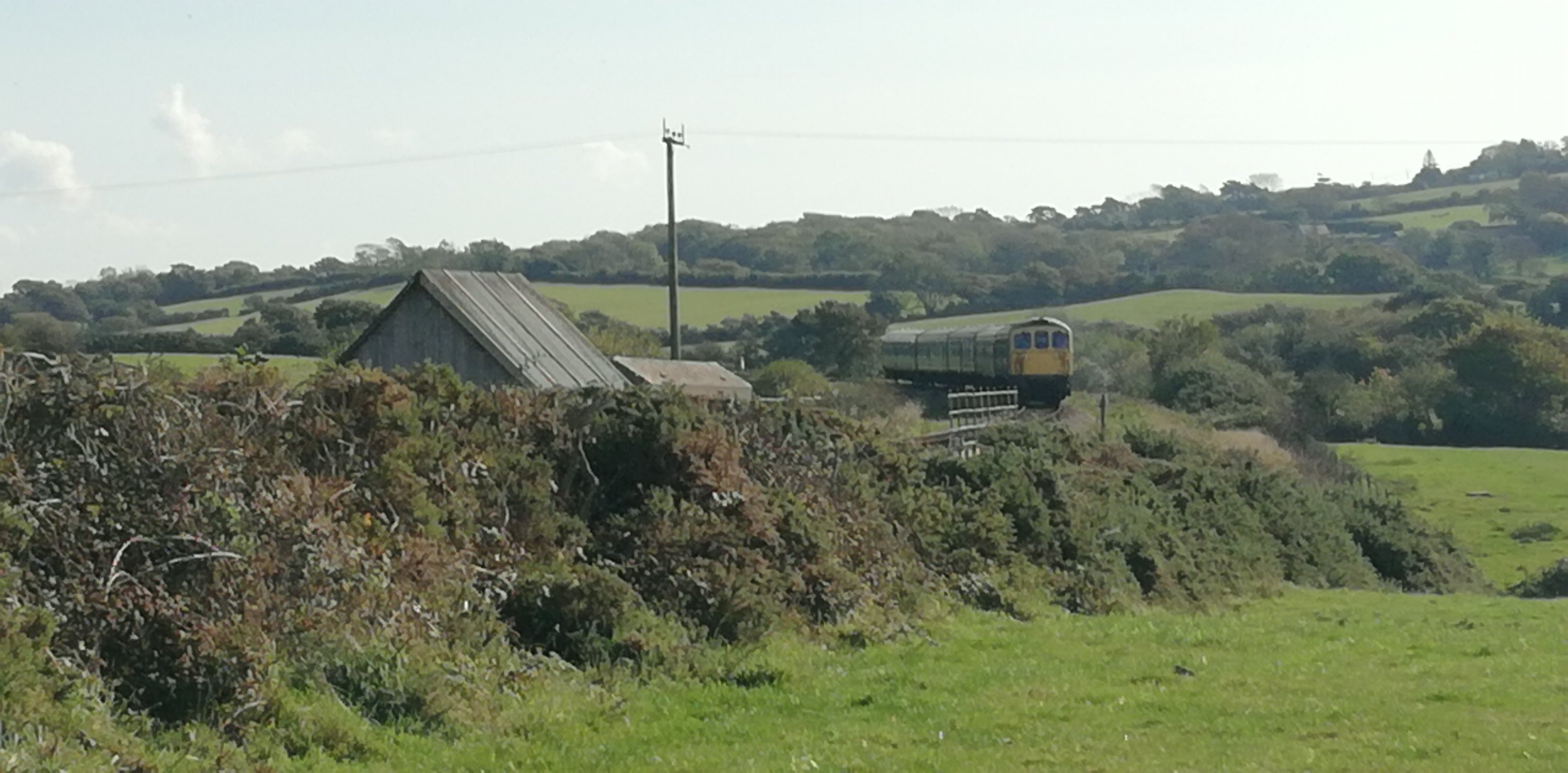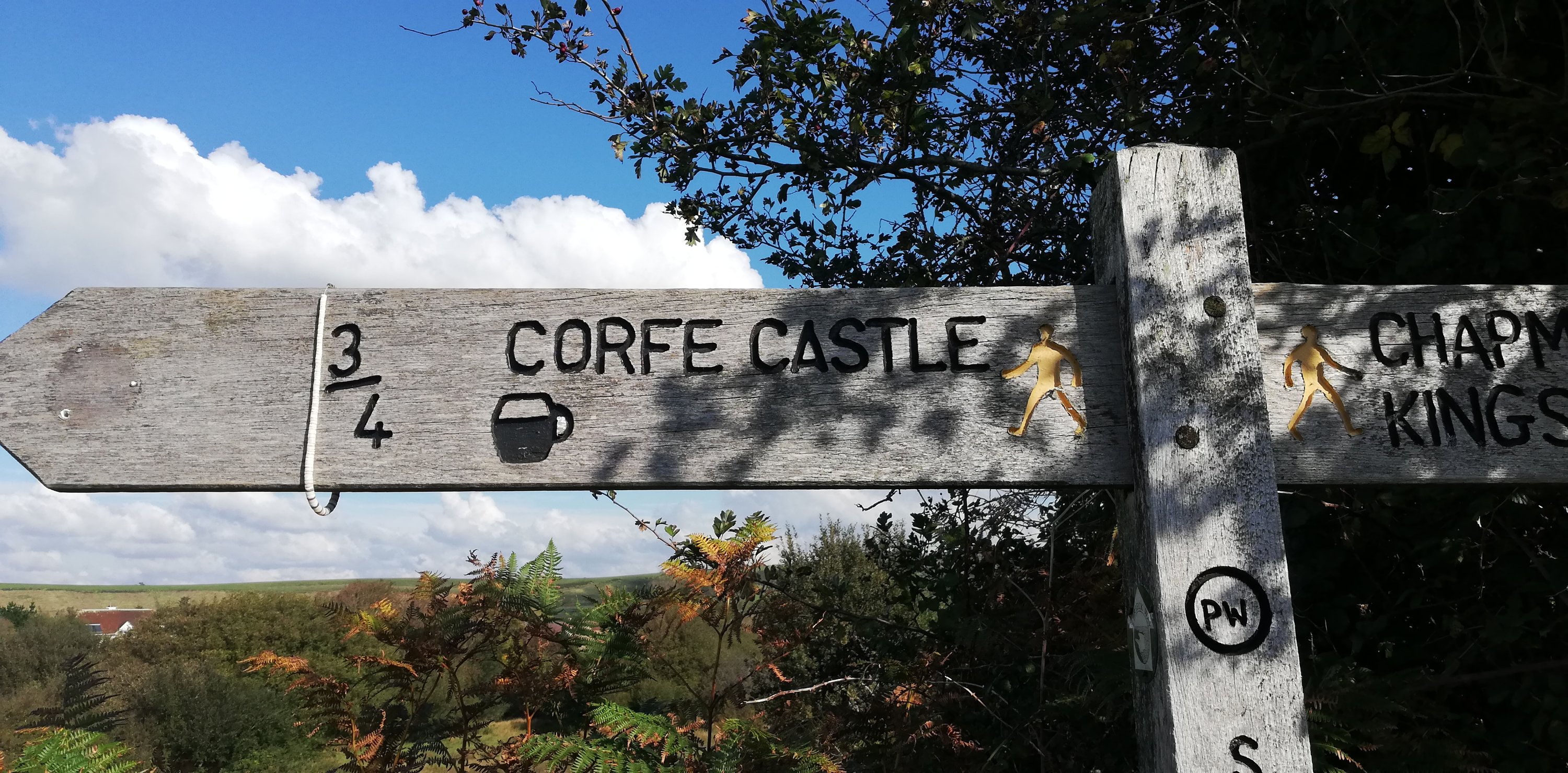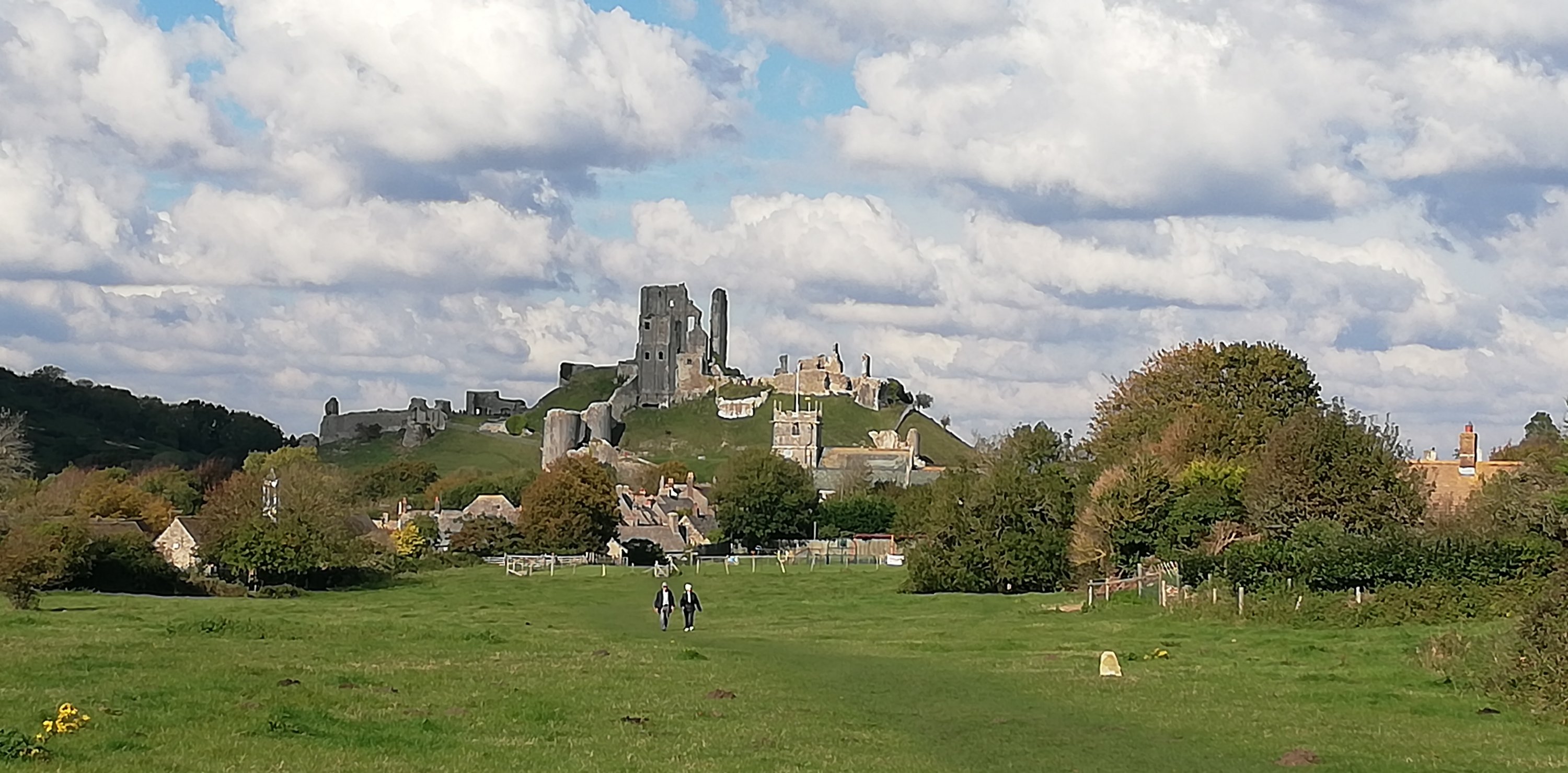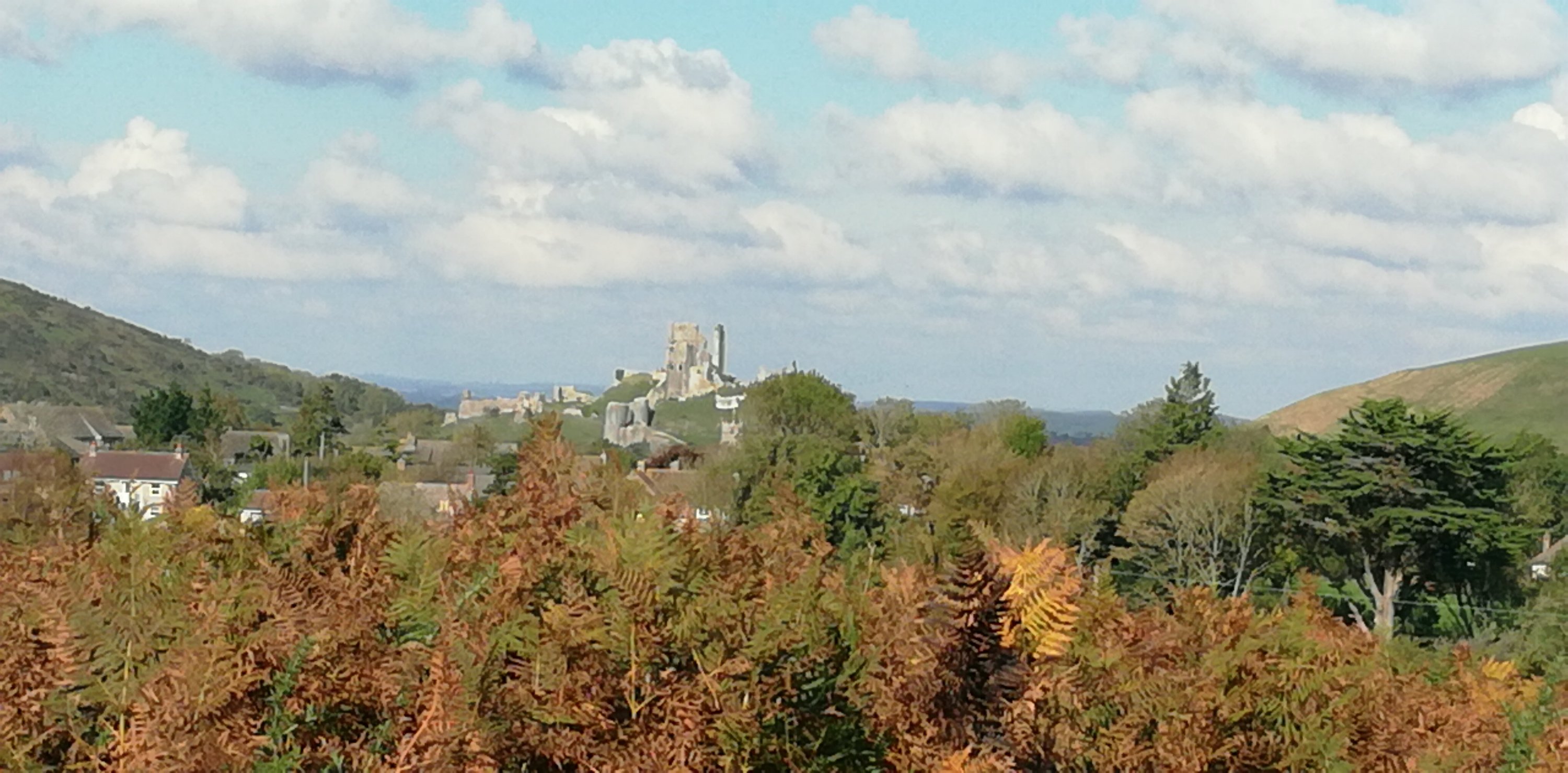 As we are pitching up a train passes us, literally behind our pitch. It’s supposed to be a steam train but today it’s an old diesel pulling old fashioned carriages. Sadly not quick enough to get a picture. After putting on our walking pants and shoes we walk to Corfe Castle. It’s a wonderful route mainly across fields and Corfe Common with only a very short section on the road.