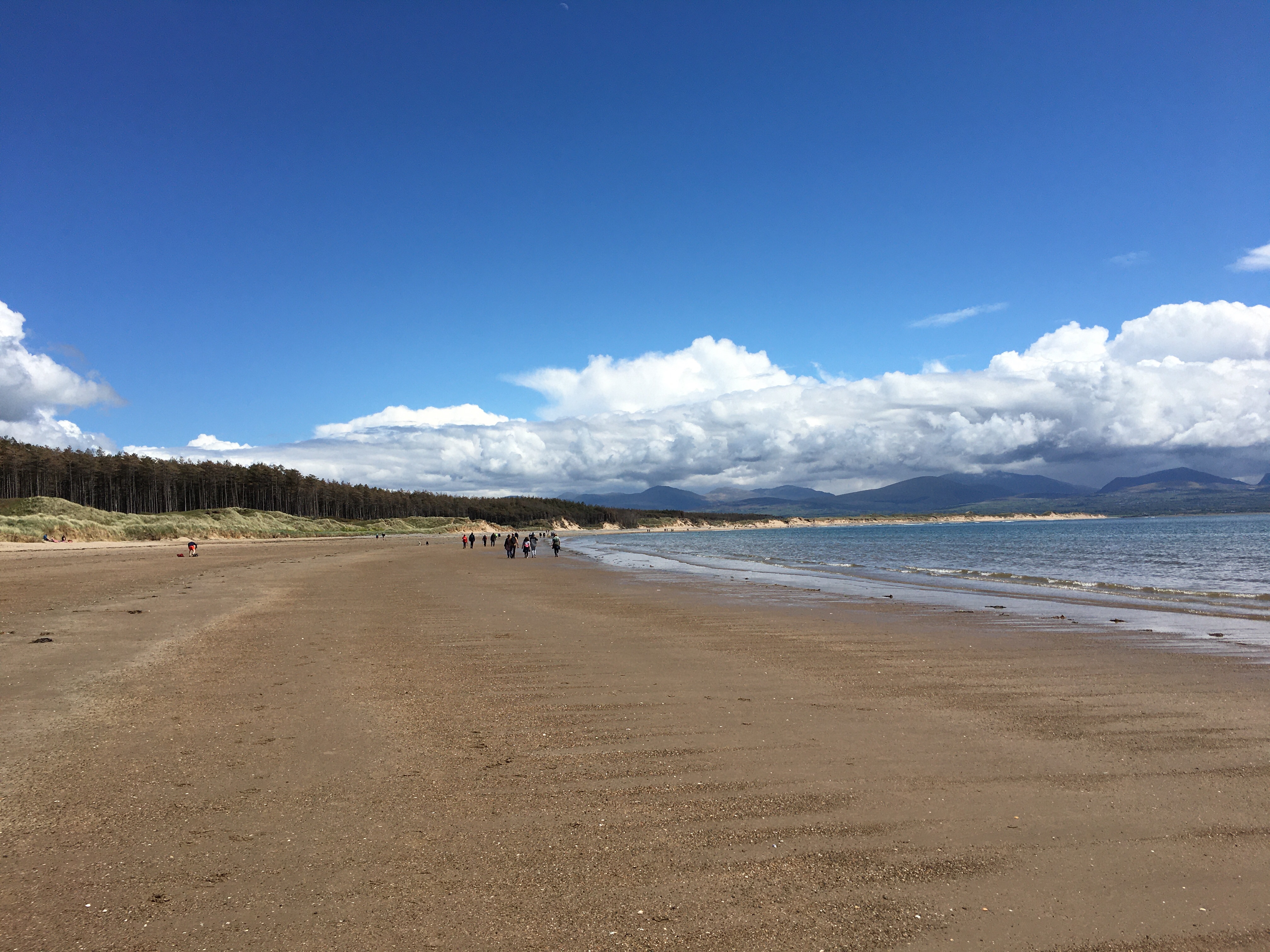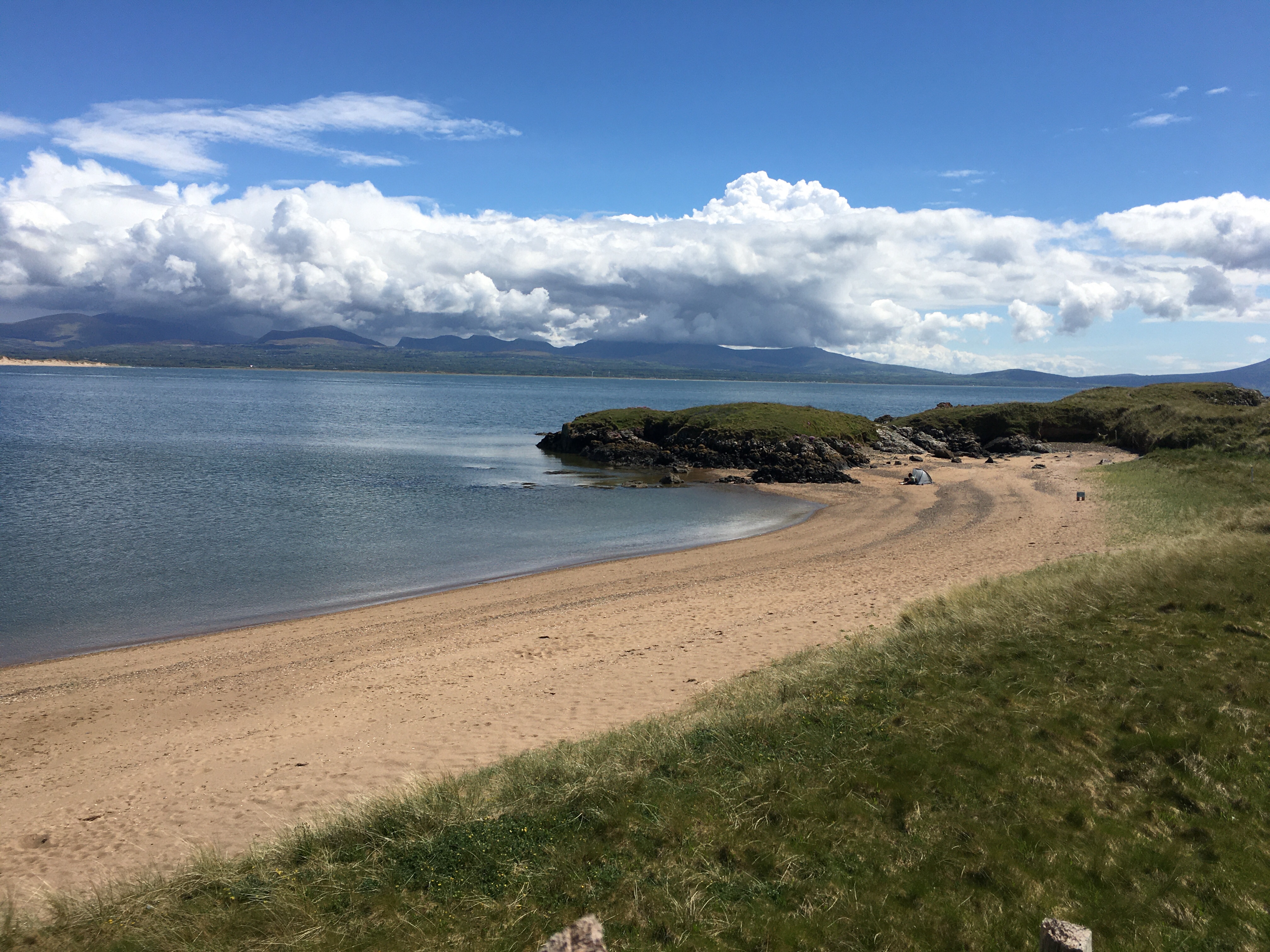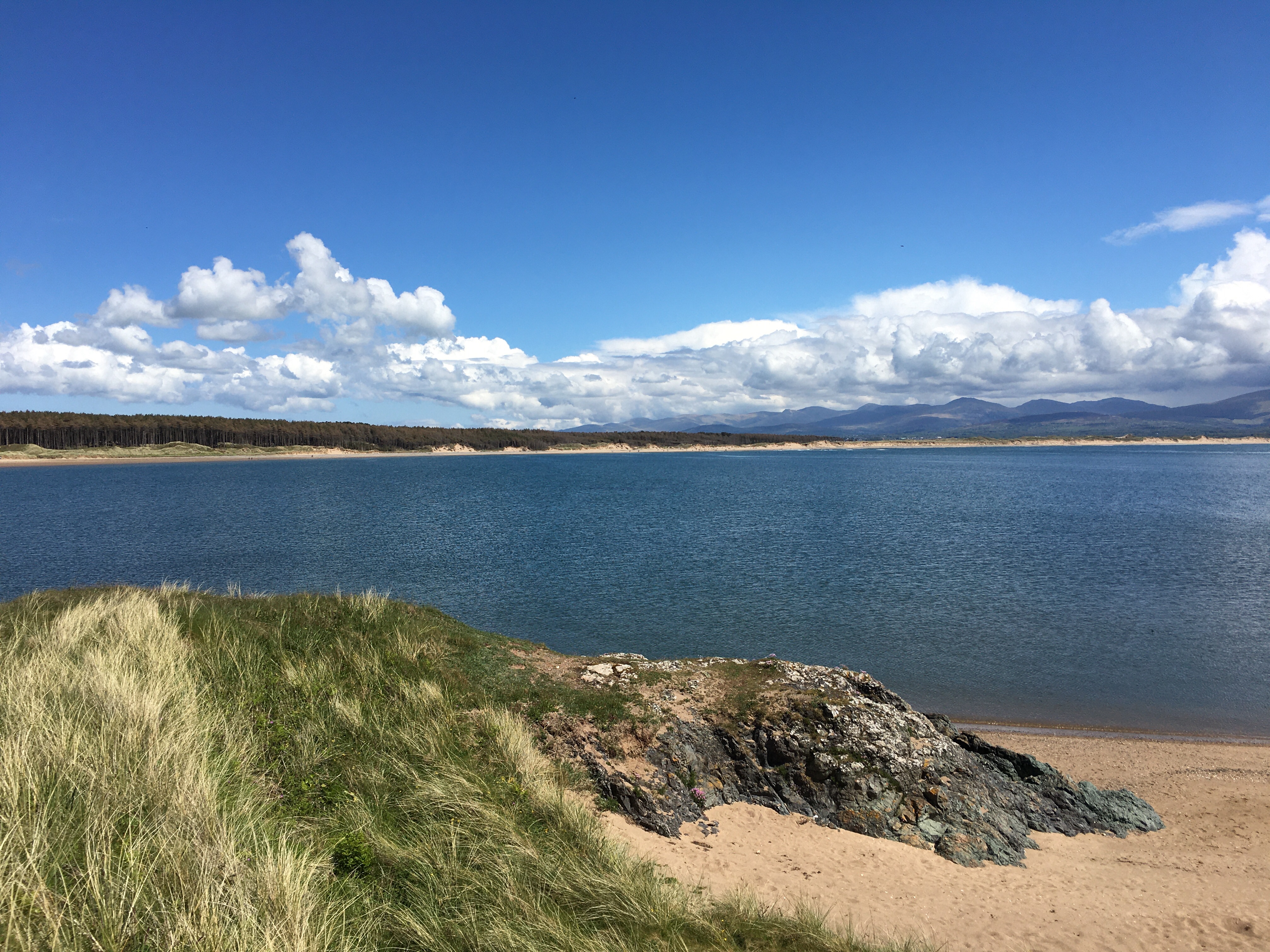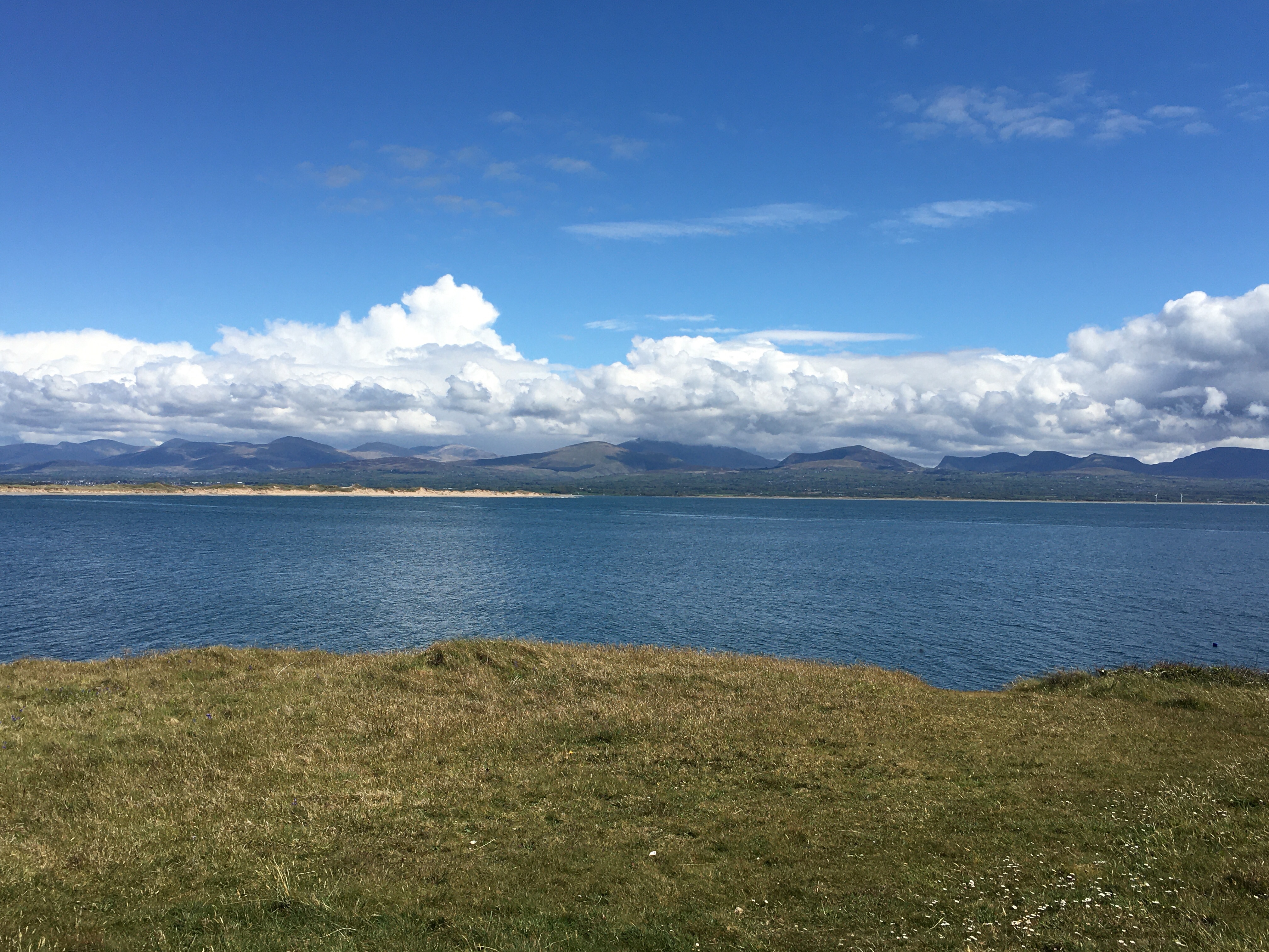 We climb a big sand dune to get to the beach and see across the Menai Straight and the spectacular Snowdonia mountain range. It’s awesome. The sky is blue, the water is sparkling, the beach is almost empty and the mountains are topped with amazing cloud formations.