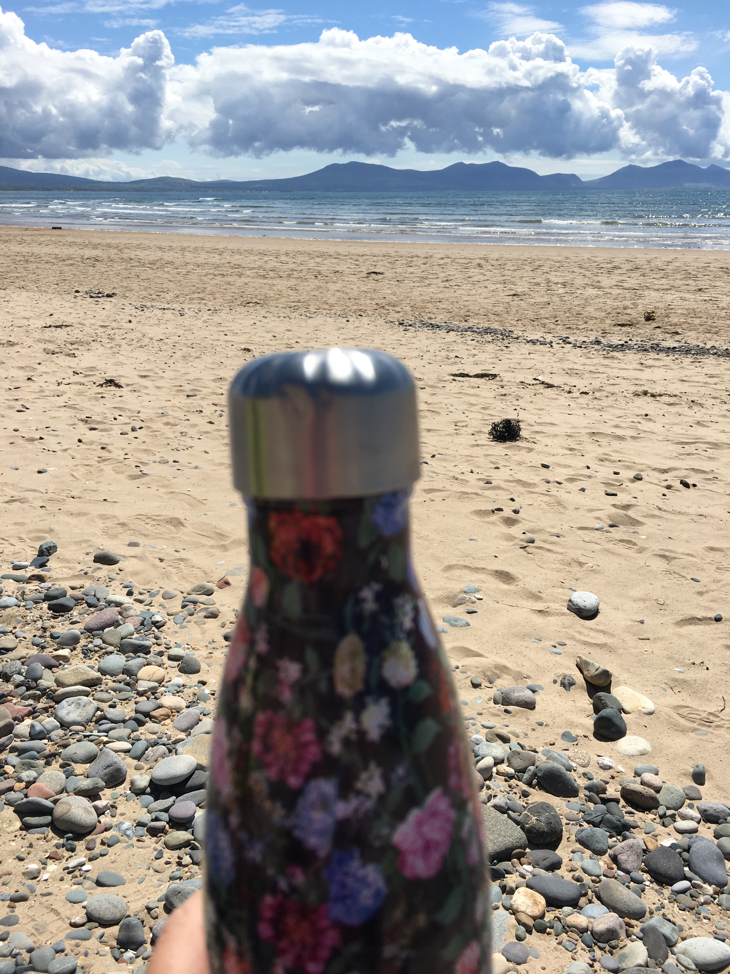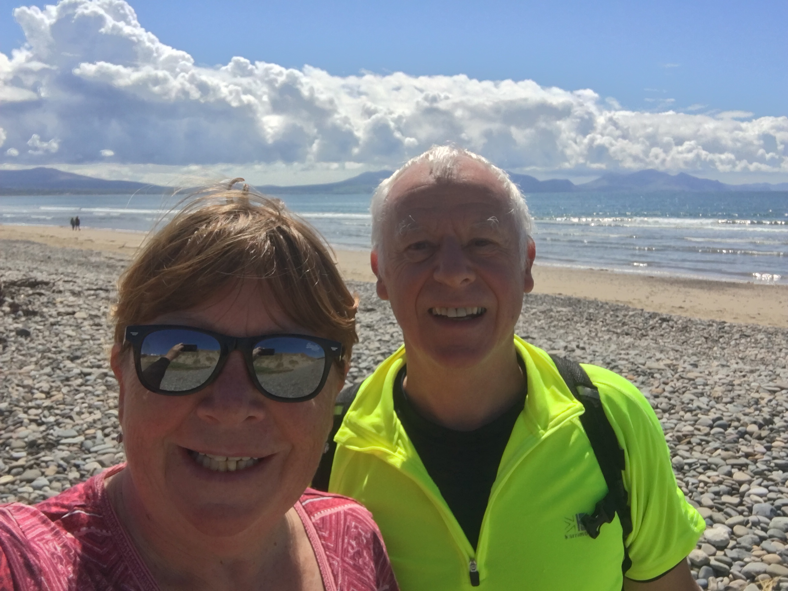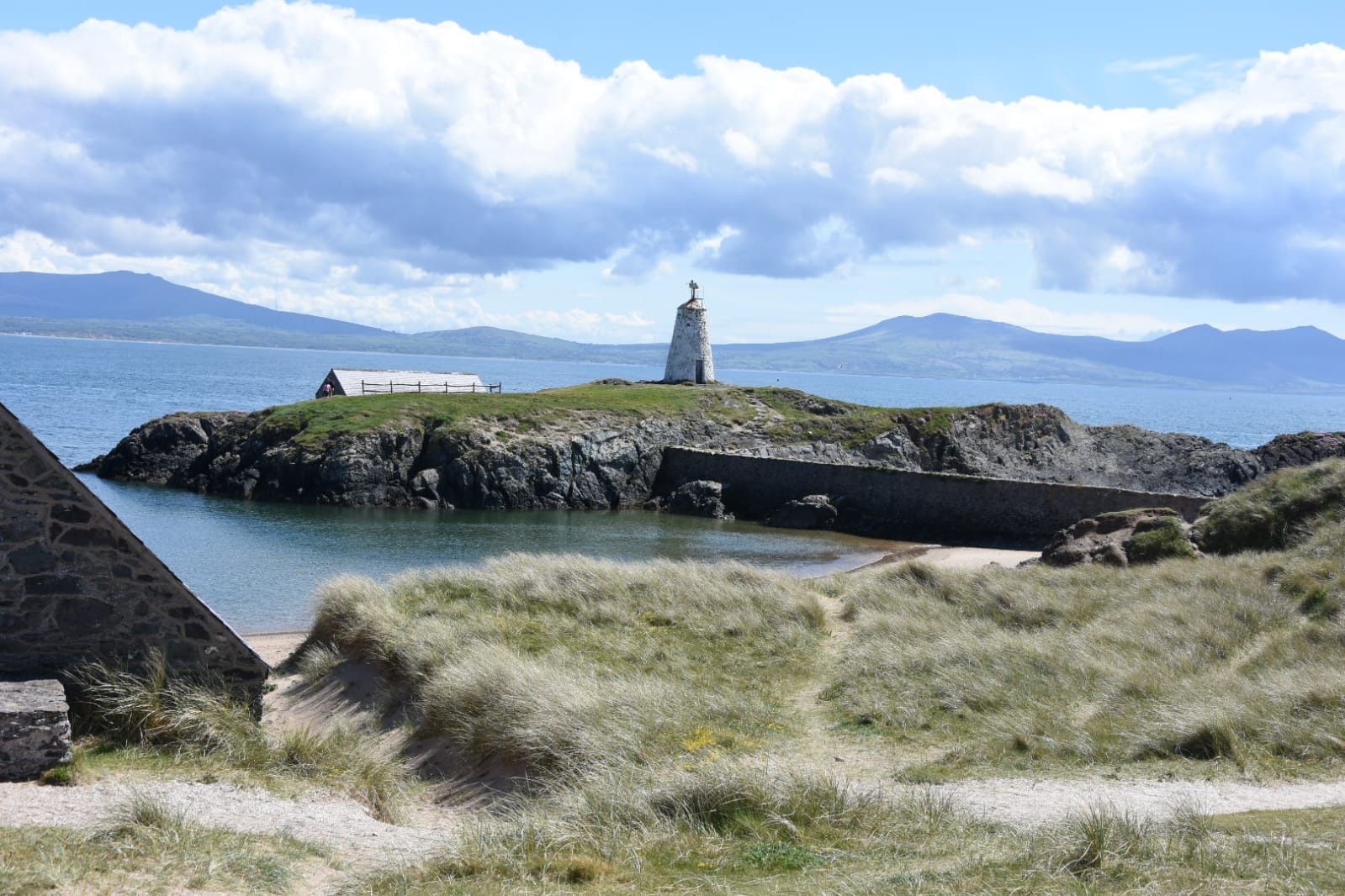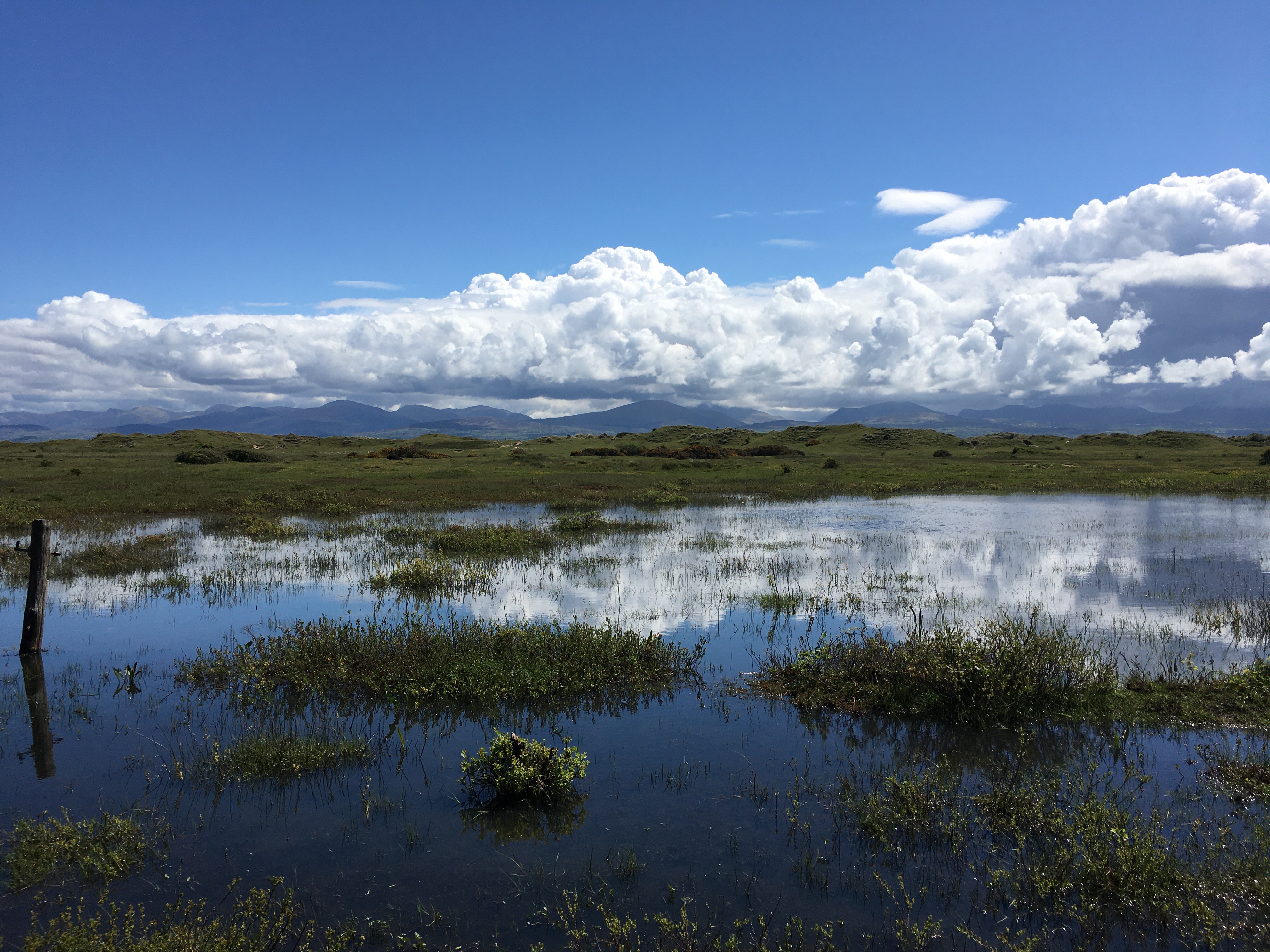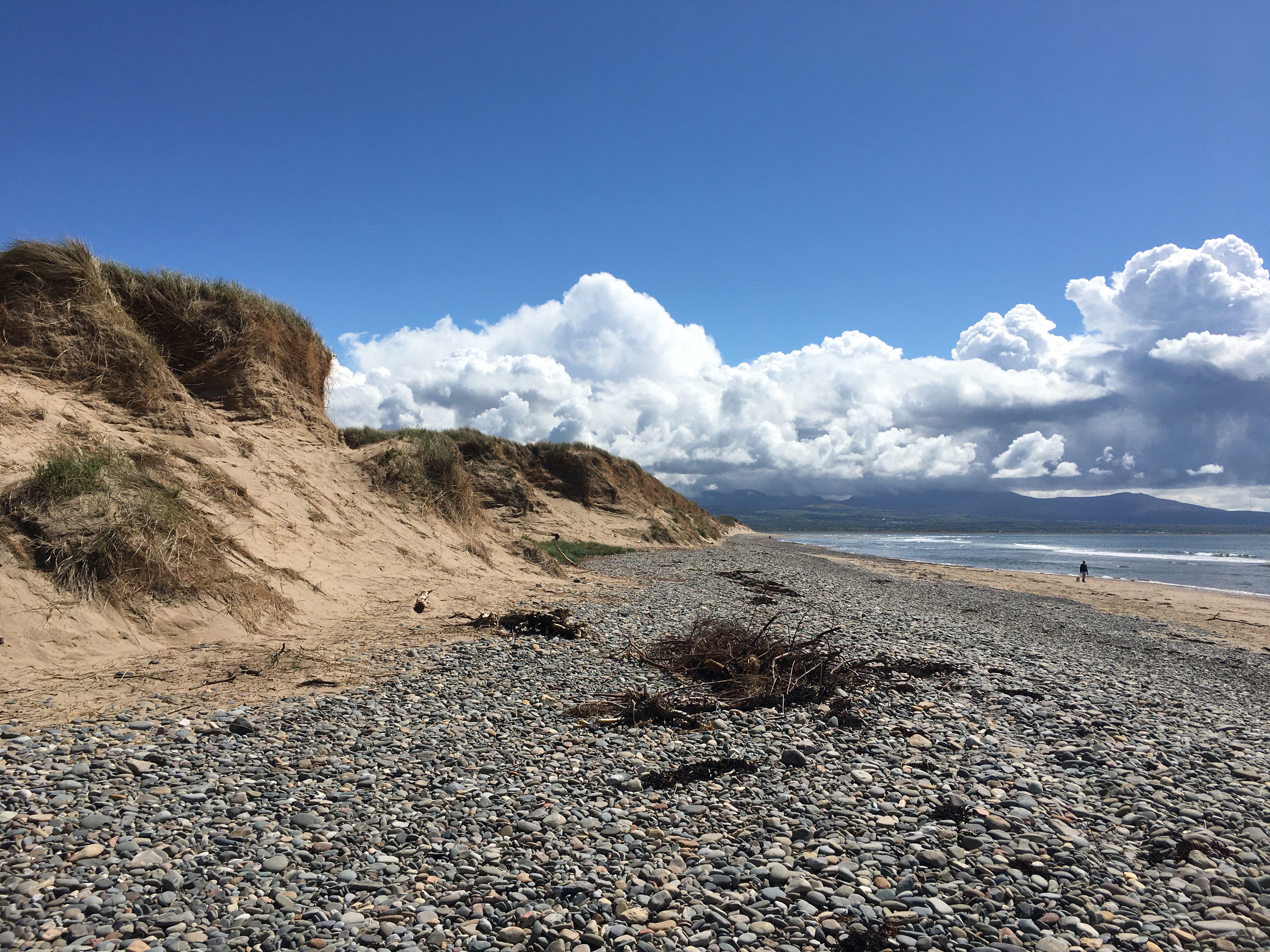 We climb a big sand dune to get to the beach and see across the Menai Straight and the spectacular Snowdonia mountain range. It’s awesome. The sky is blue, the water is sparkling, the beach is almost empty and the mountains are topped with amazing cloud formations.
