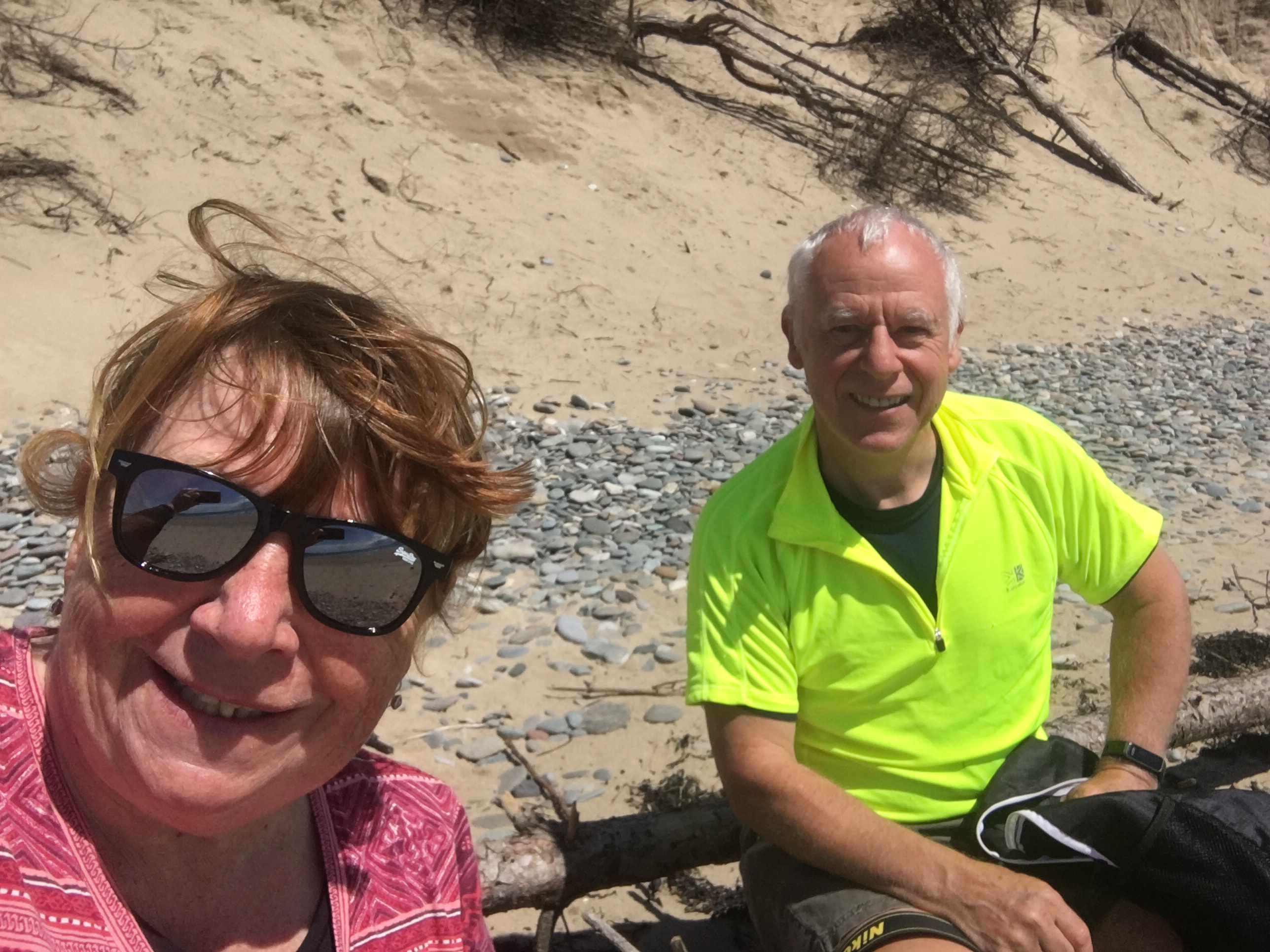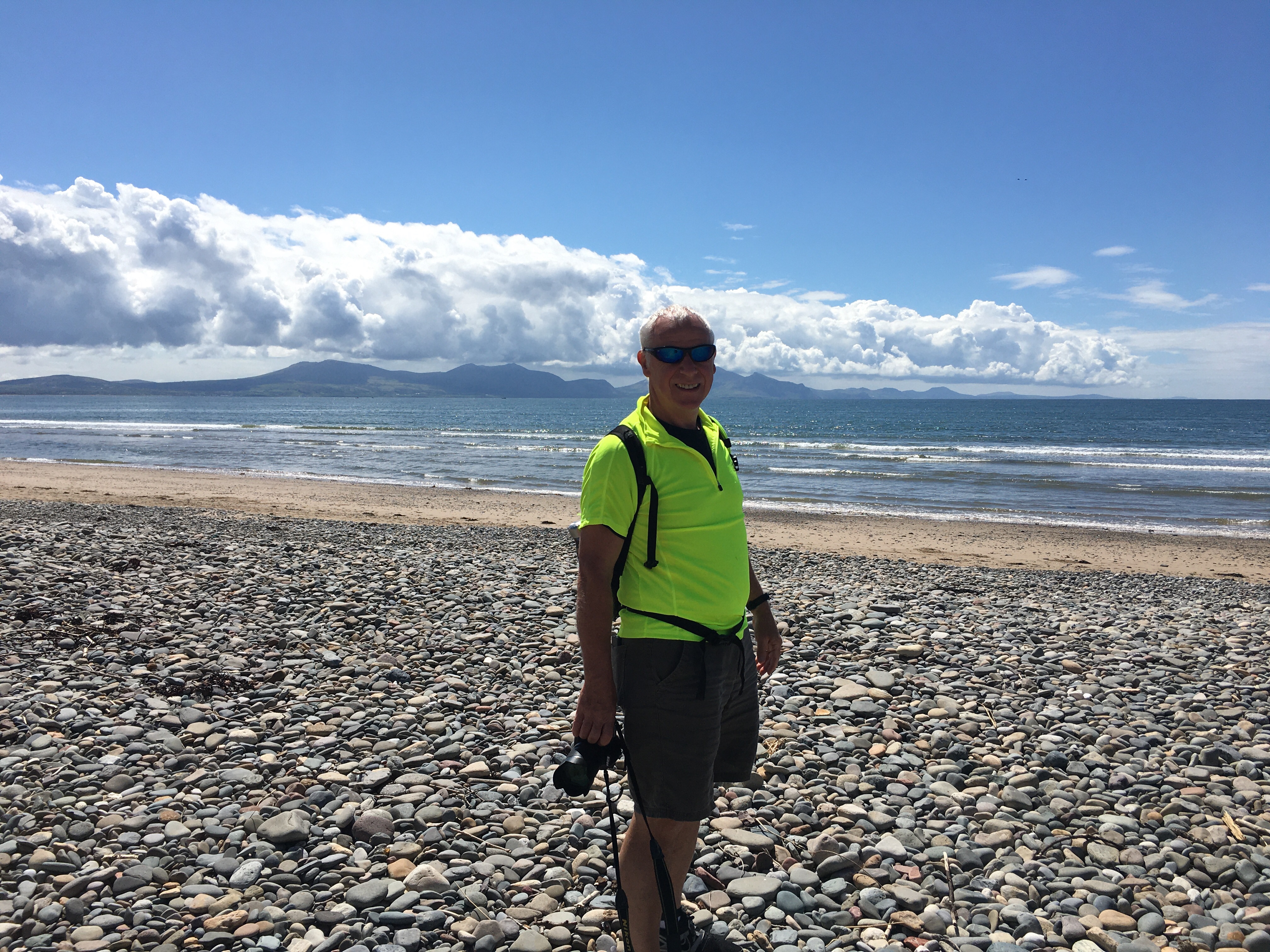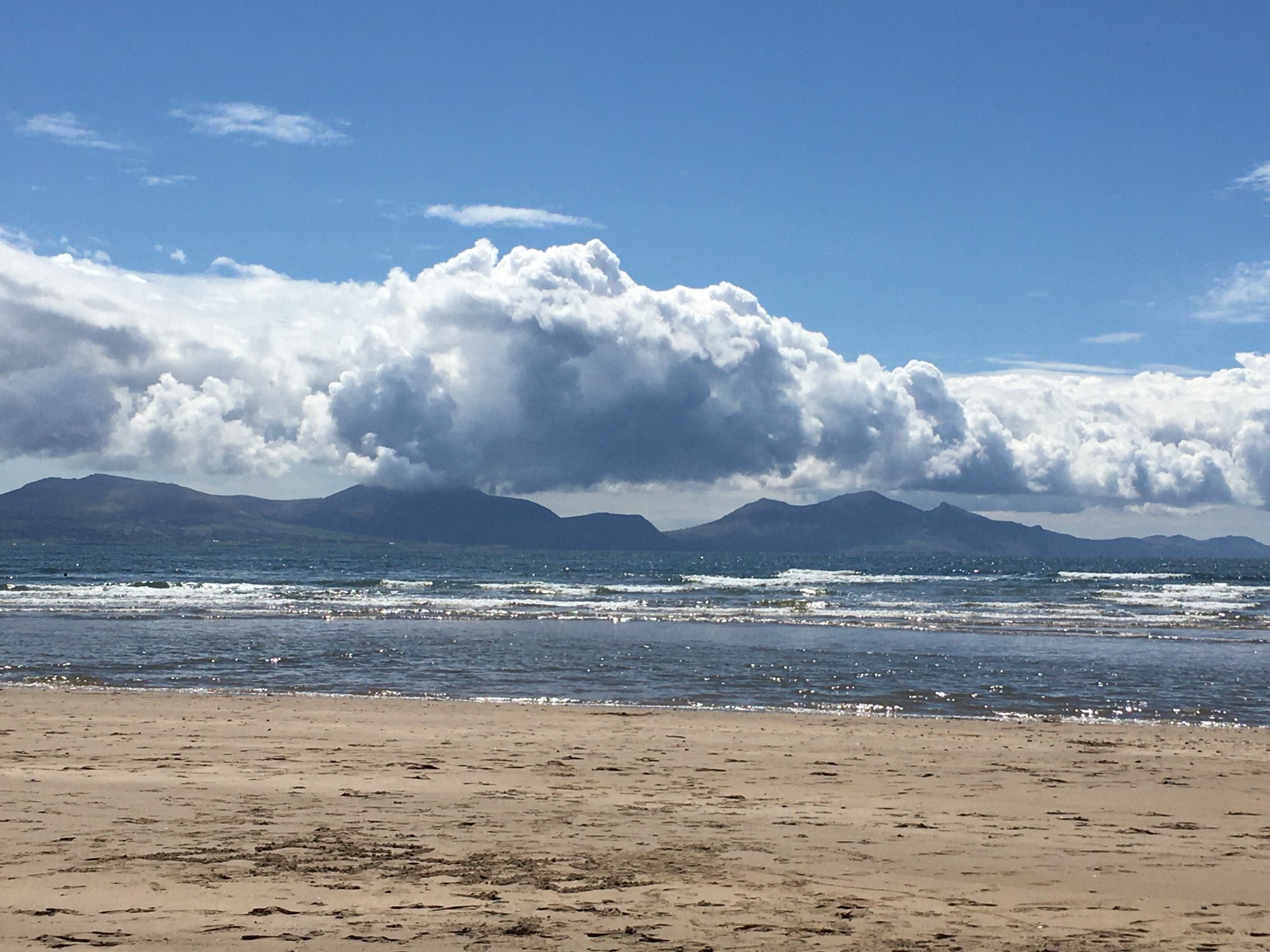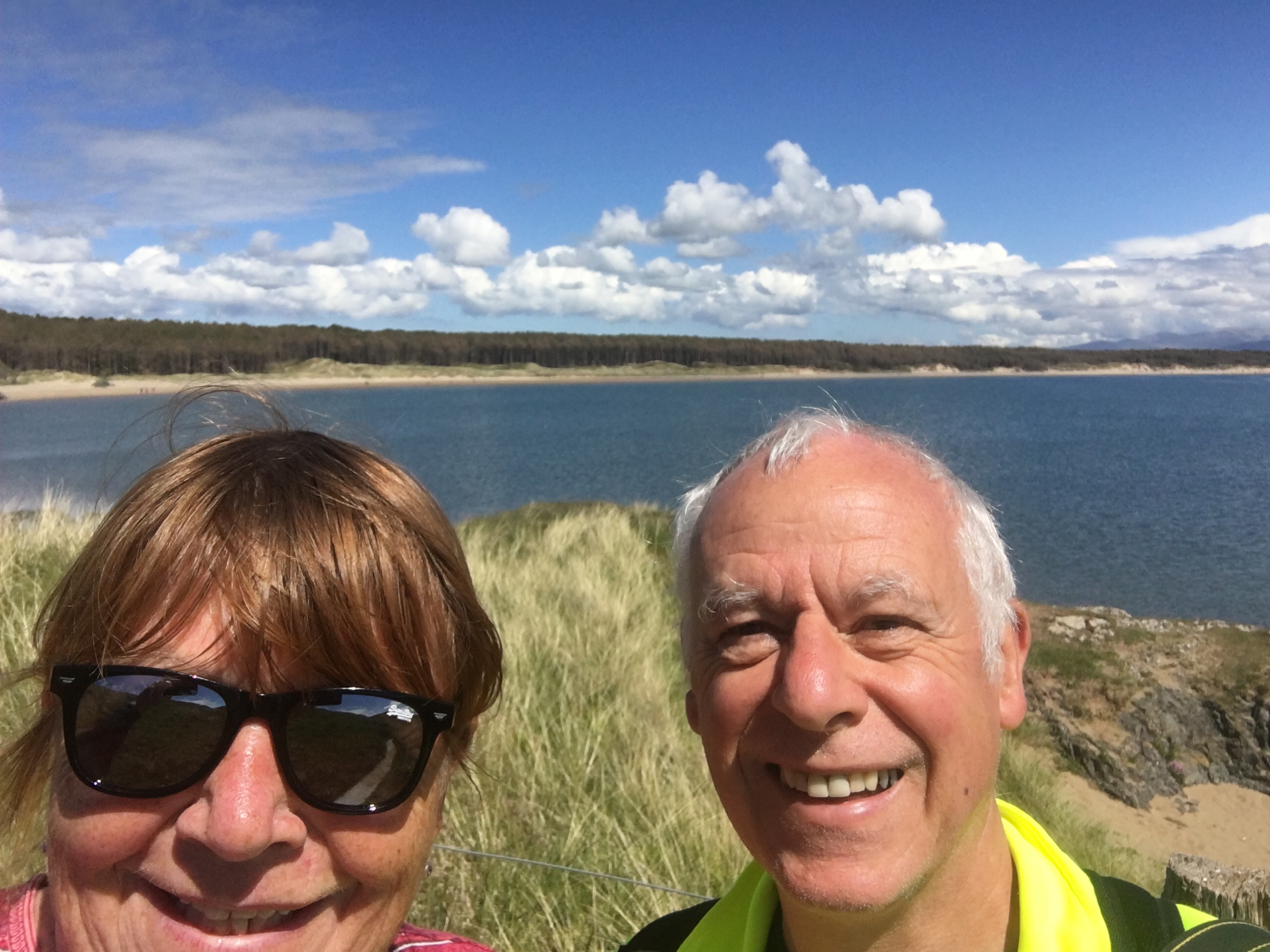 We climb a big sand dune to get to the beach and see across the Menai Straight and the spectacular Snowdonia mountain range. It’s awesome. The sky is blue, the water is sparkling, the beach is almost empty and the mountains are topped with amazing cloud formations.