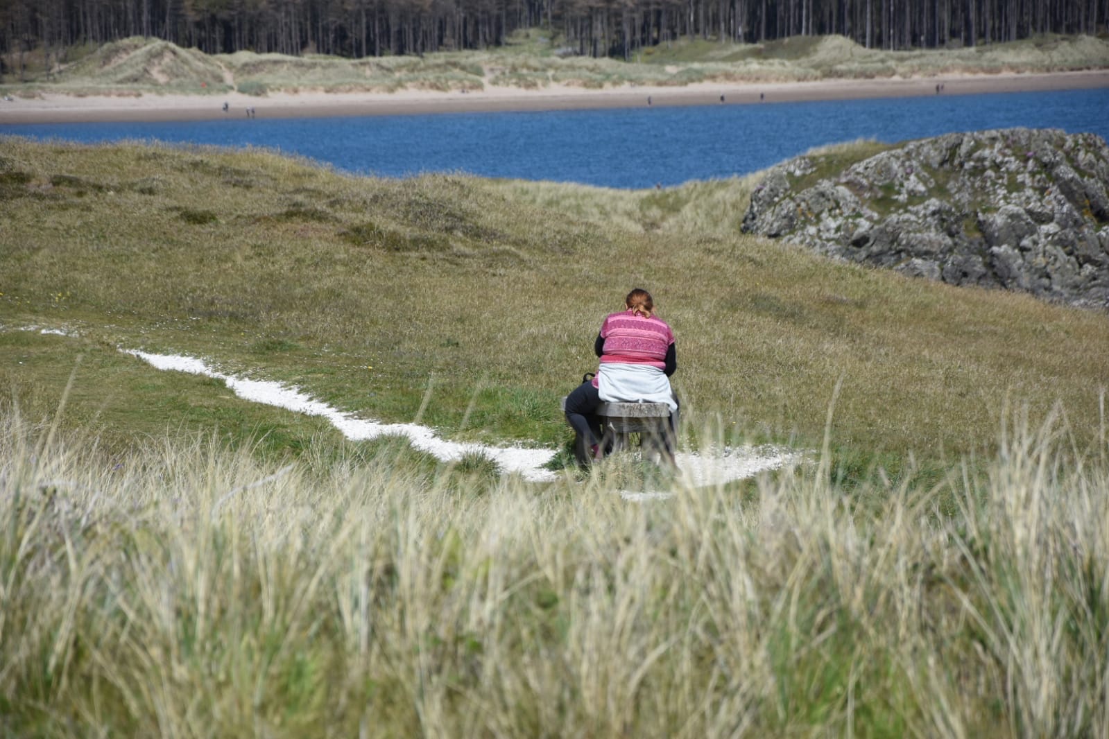 We wander along the beach towards the spit of land called Ynys Llanddwyn. As we get closer the beach gets much busier and we realise that there’s a big car park hidden behind the sandunes.
