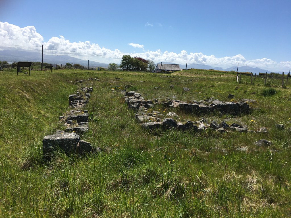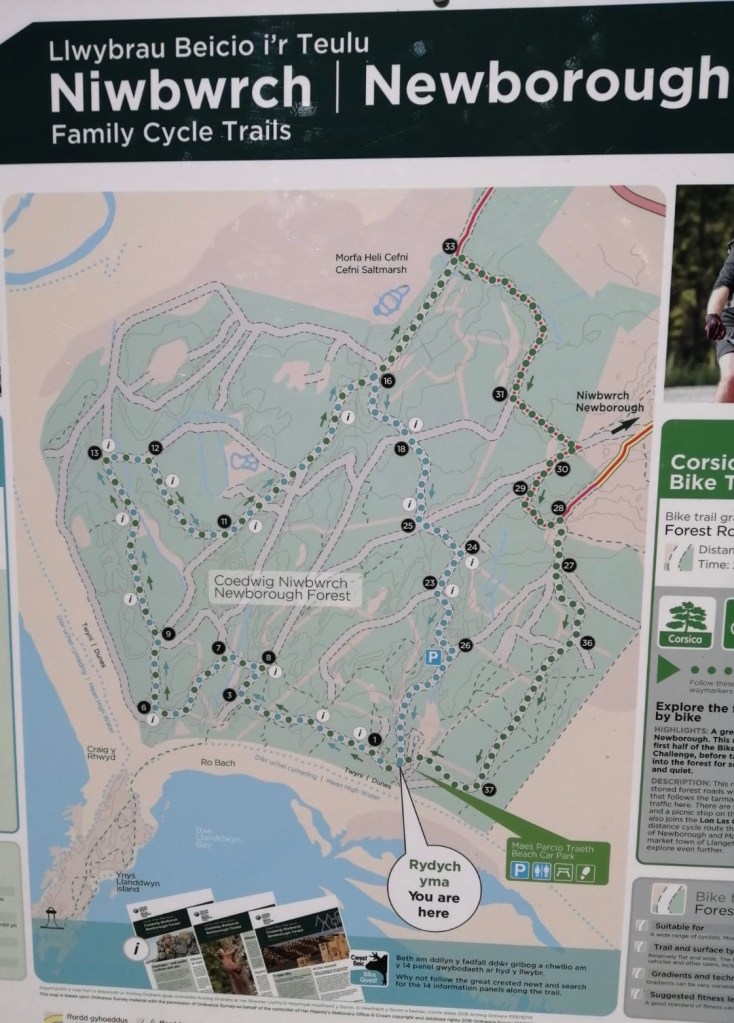 The plan is to take one of the cycling paths through the forest today. We cycle into Newborough and then up a long hill towards the coast. Our first stop is a ruin of a Welsh palace Llys Rhosyr right on the top of the hill. There’s not much to see but it does have some useful info boards. These palaces were all over Wales and used as bases for independent governance rather than defence until Edward I arrived in the 13c.