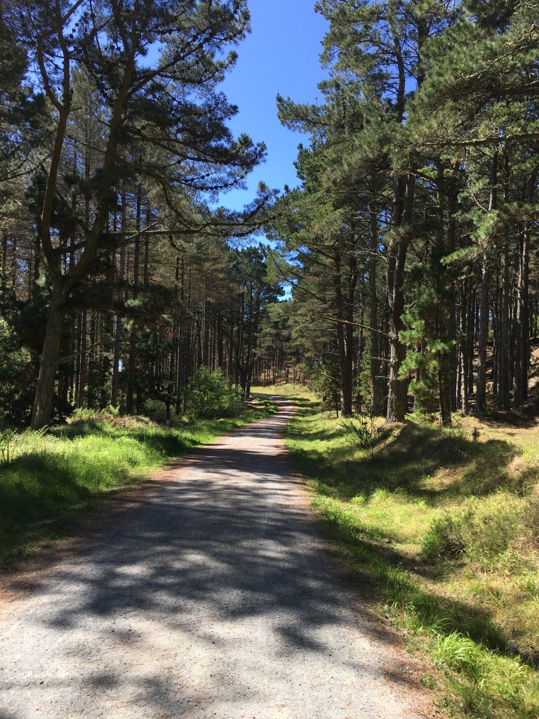 Down down down hill to the start of the cycling trail in the forest. It’s called the Corsica trail after the Corsica pines planted throughout the forest. They are tall thin and very straight and great for logging.