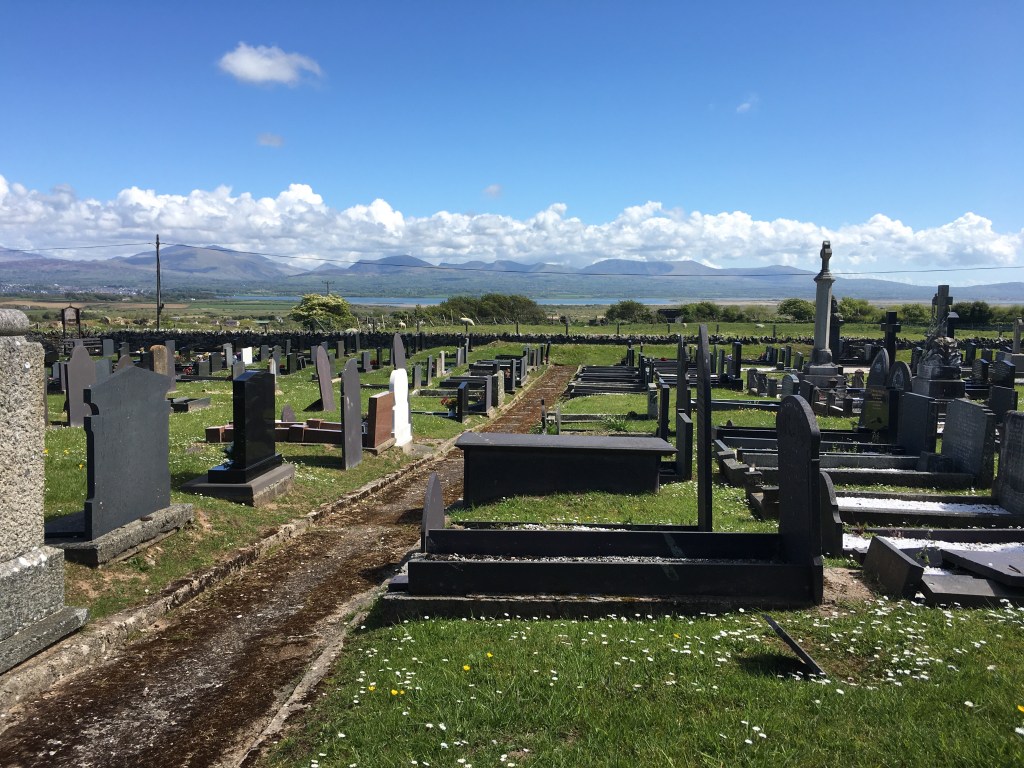 It has good views across to the Snowdonia mountain range and we while away 30 mins checking out gravestones and making calls..until the pub opens!