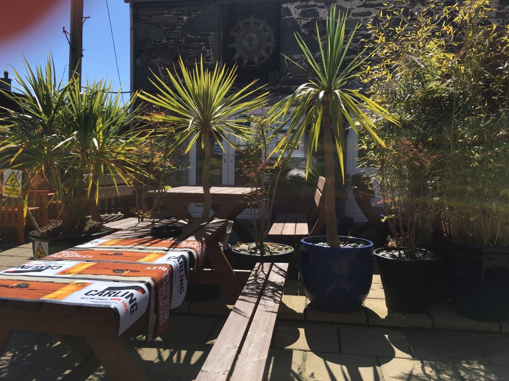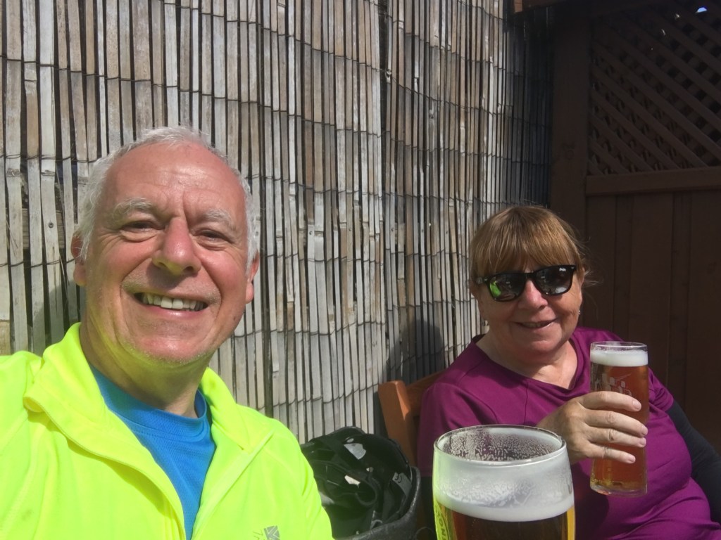 A couple of pints are quaffed in the lovely sunny beer garden of the White Lion in Newborough before cycling back to the campsite in Dwyran.