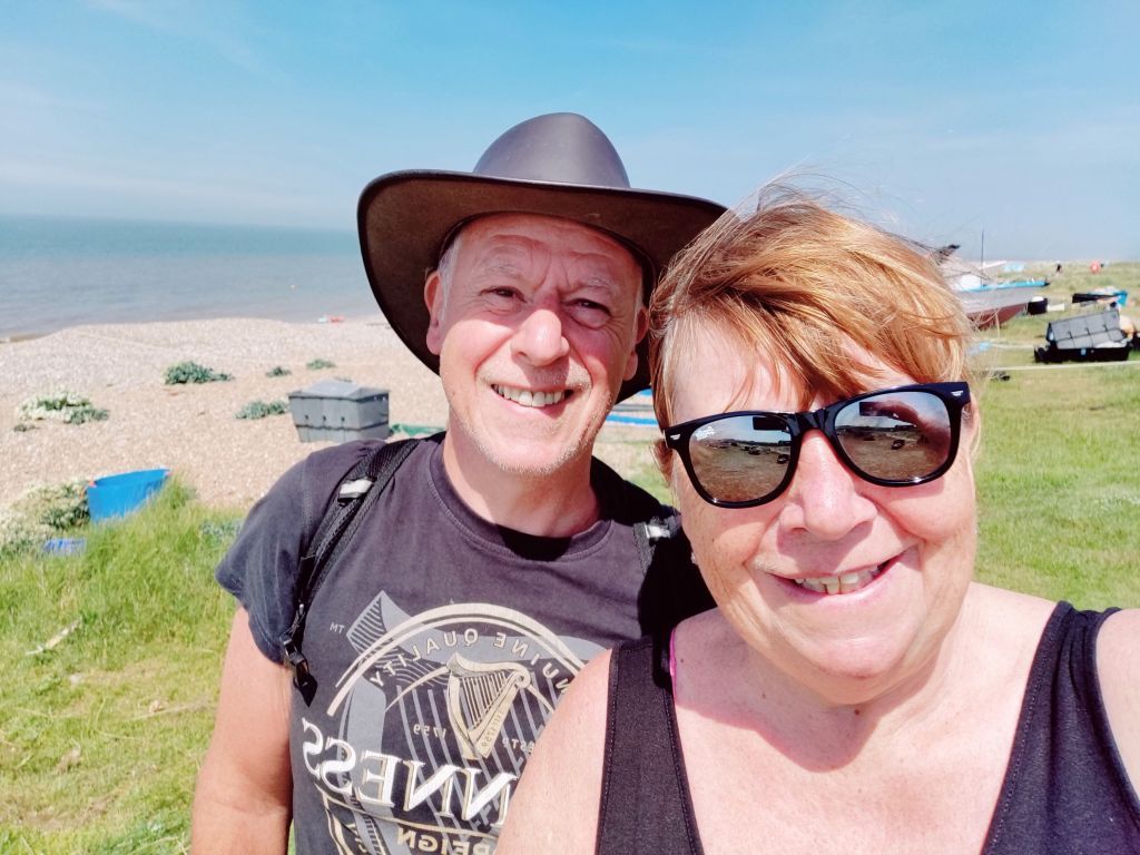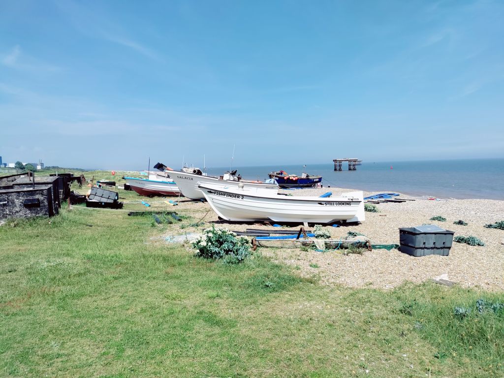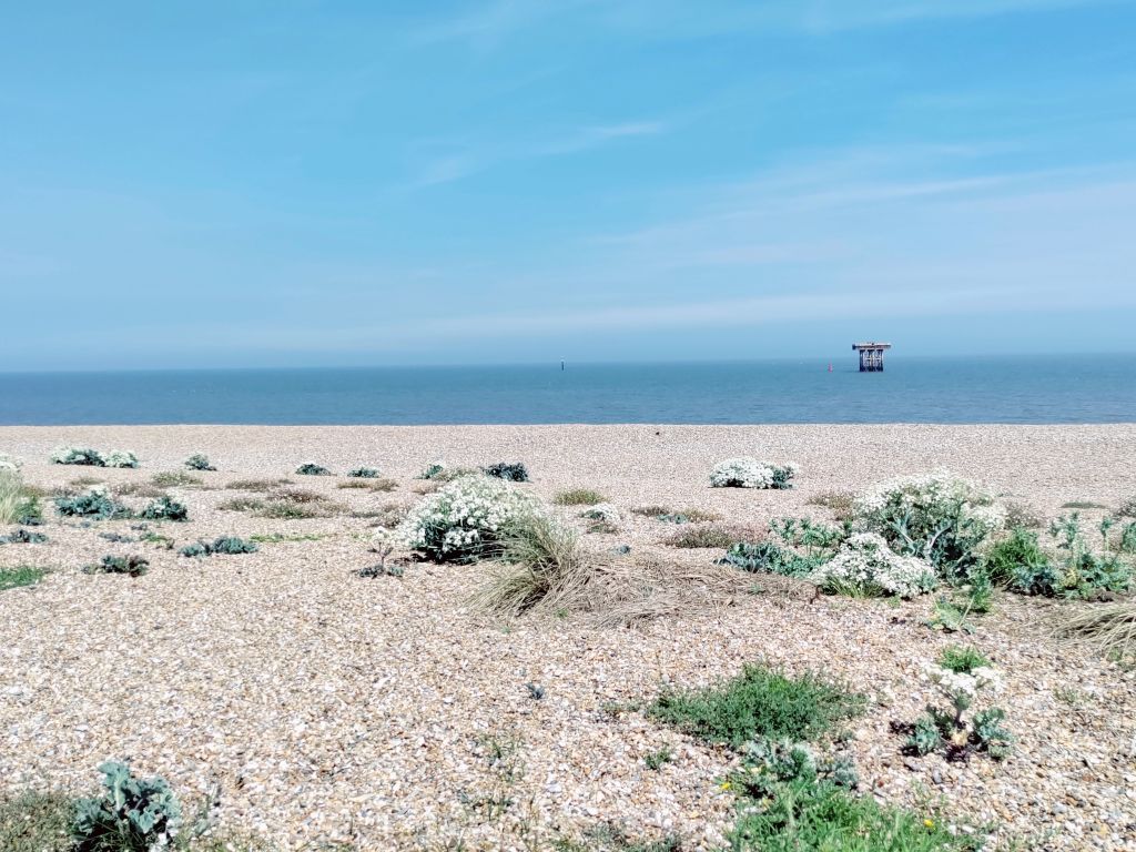 There’s a few boats on the beach with plastic rollers and winches to get them in and out of The North Sea. It’s a lovely sunny afternoon. The shingle is covered in plants called Sea Kelp that have cabbage like leaves and masses of white flowers. We also spot the lupin trees which are a mass of small yellow lupin flowers.