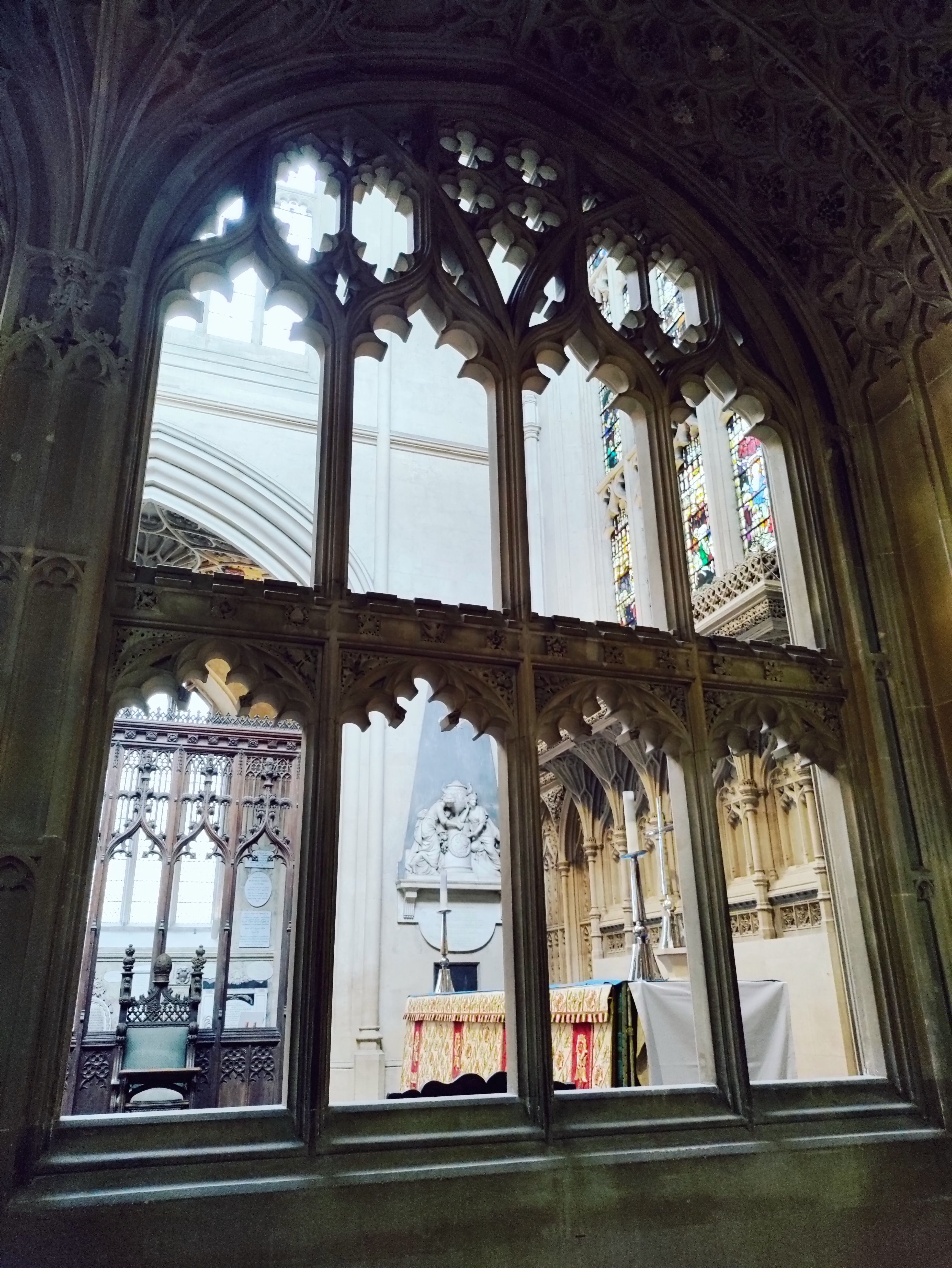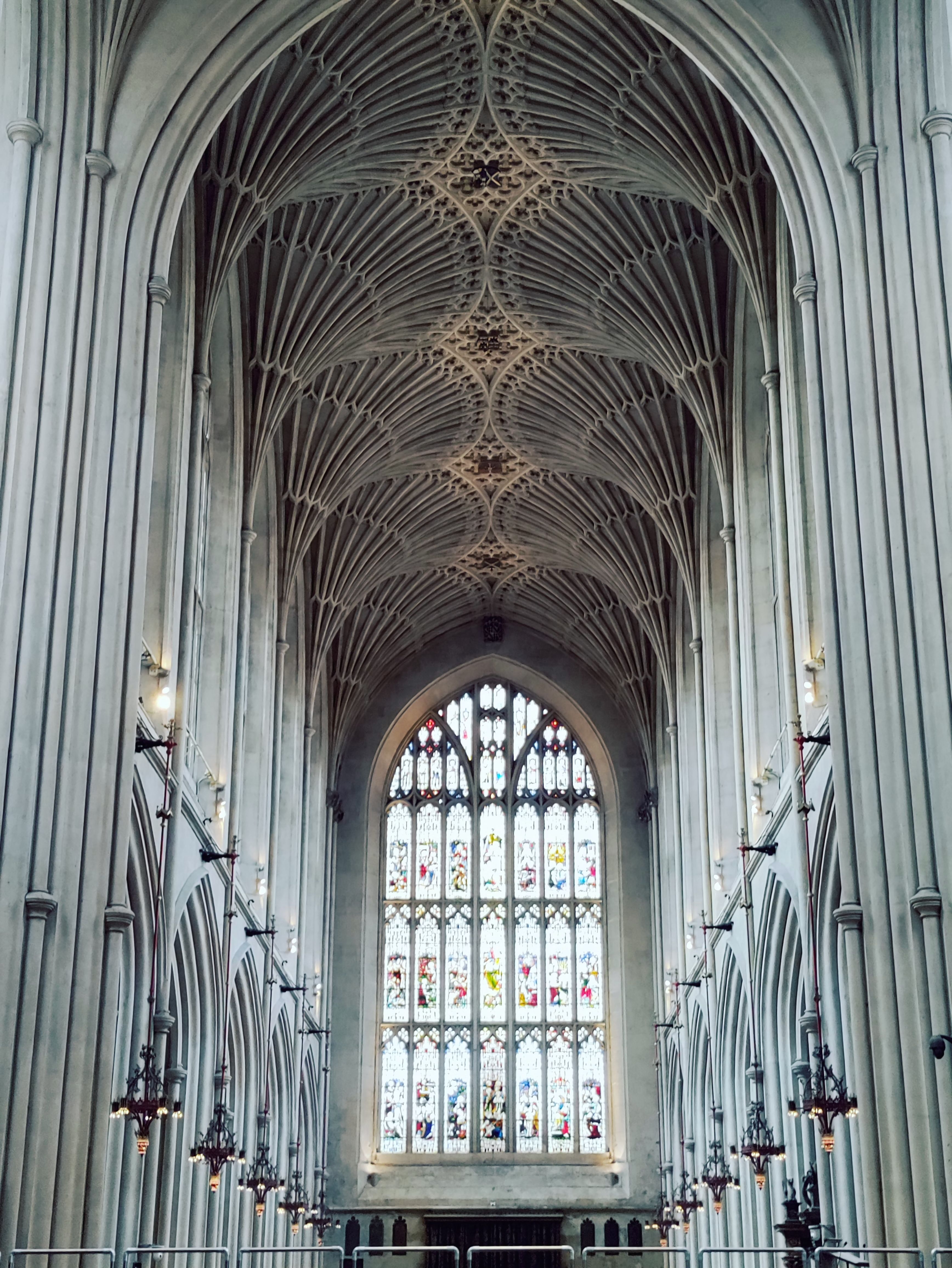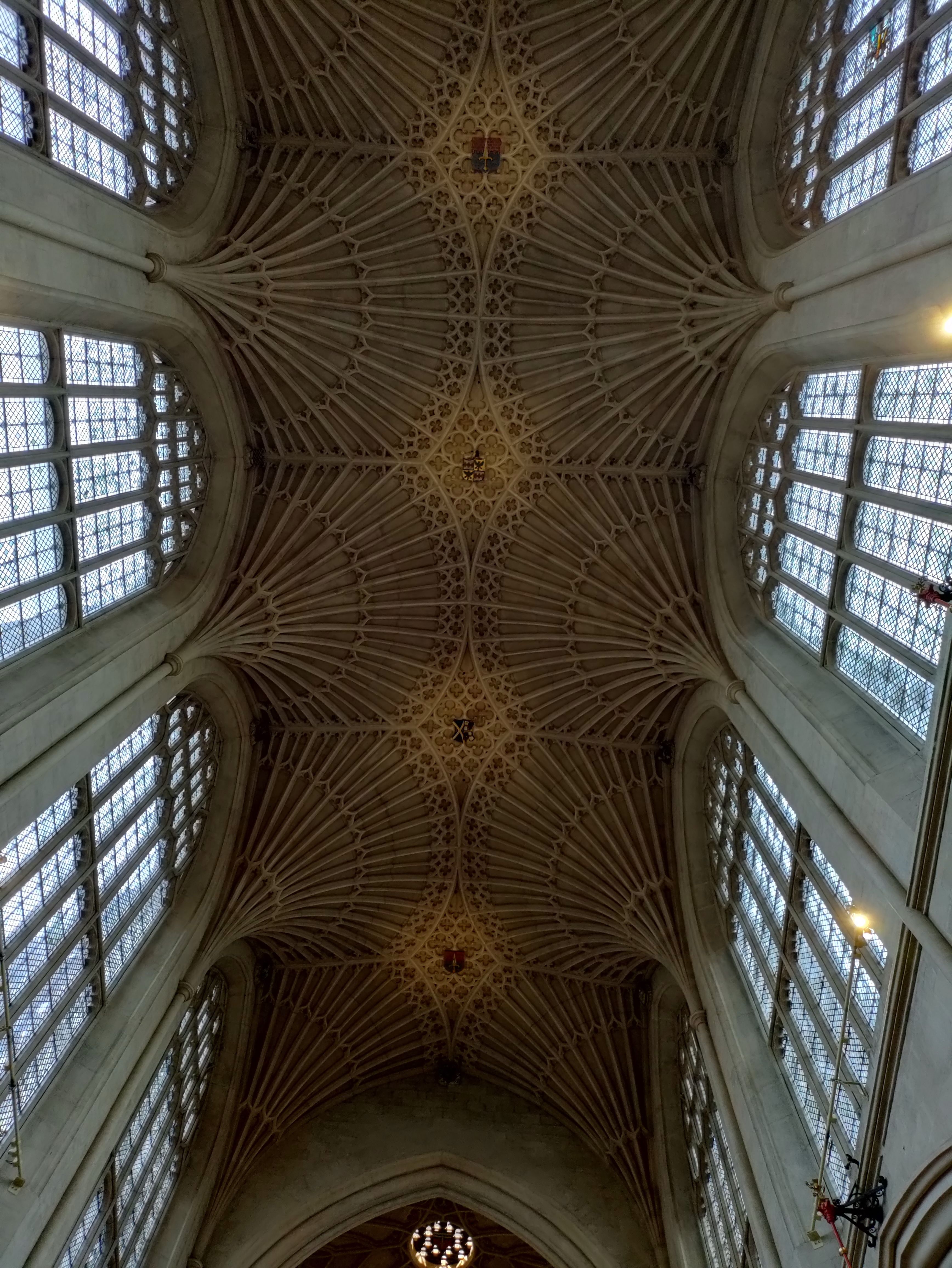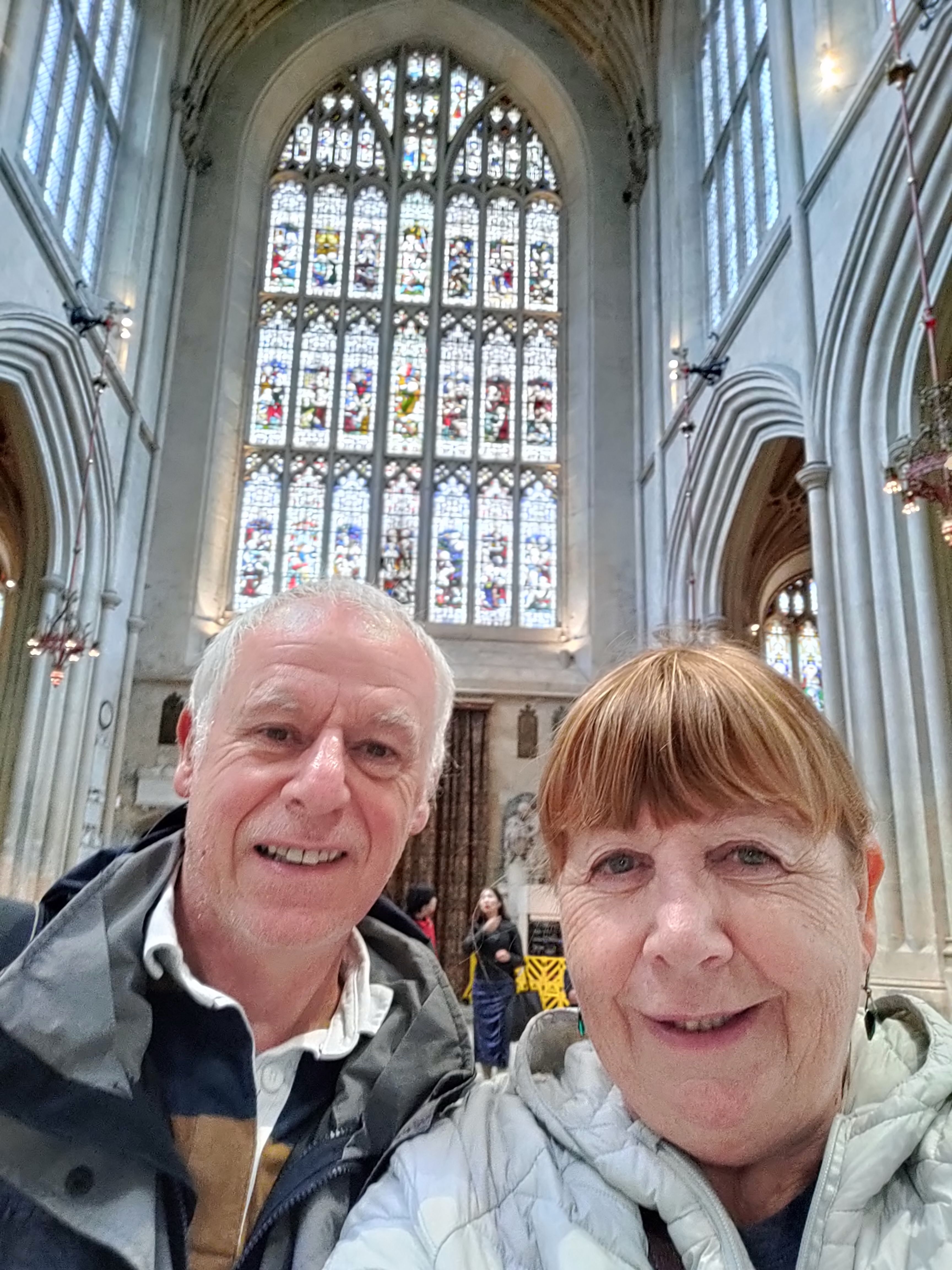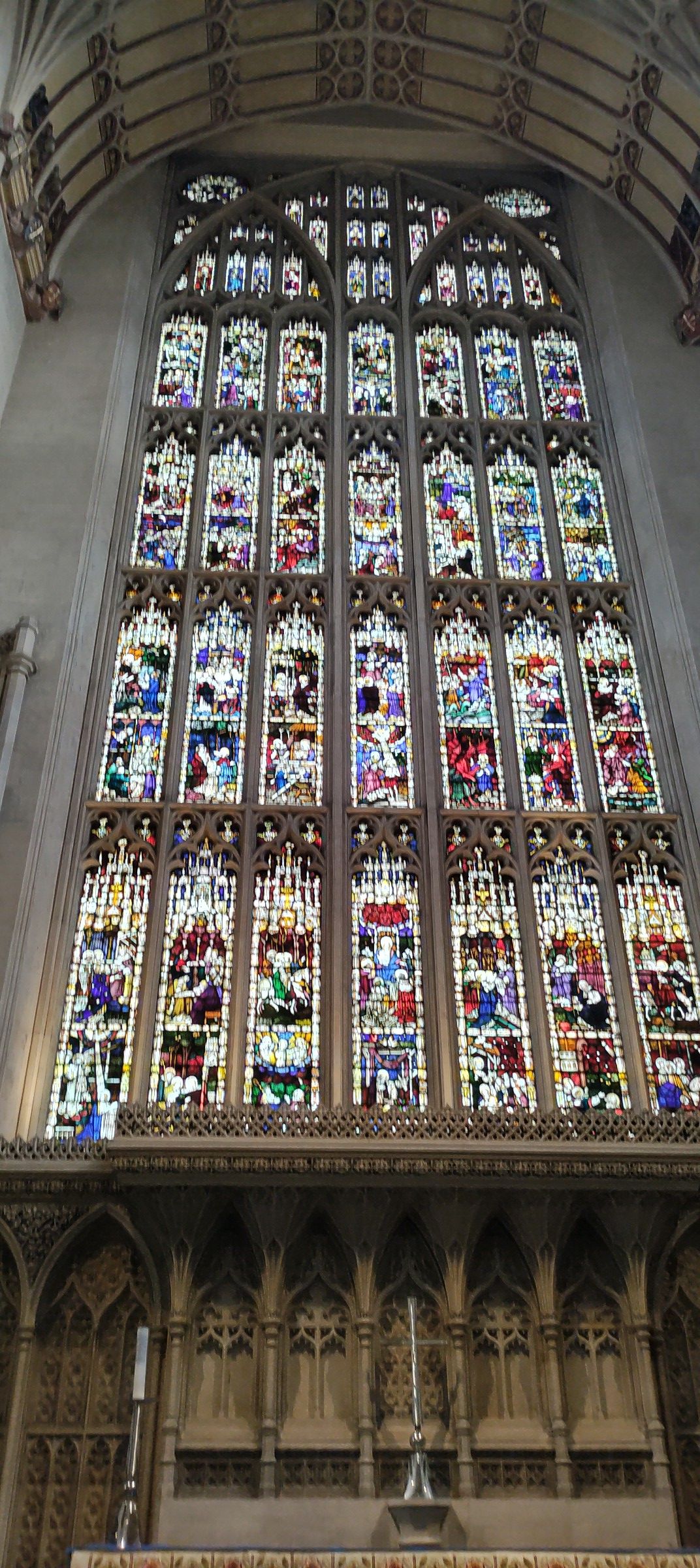 A rather damp start today. We run through the wind and rain, past the marina, to catch a bus into the centre. Bath Abbey is our first stop. We saw its roof from the baths yesterday. It has a wonderful ceiling and a lovely stained glass window.