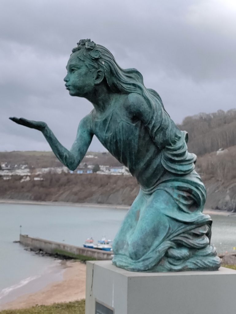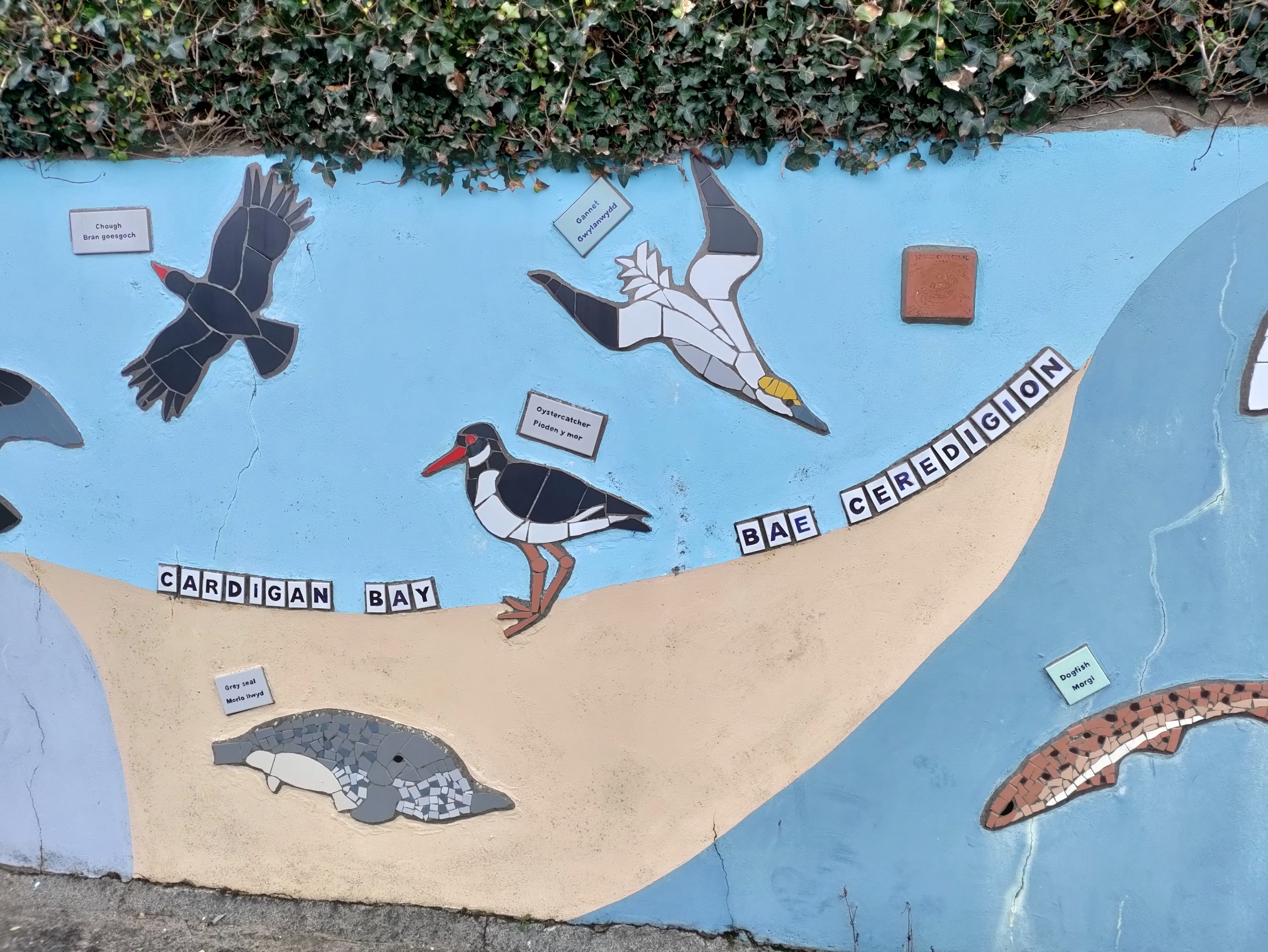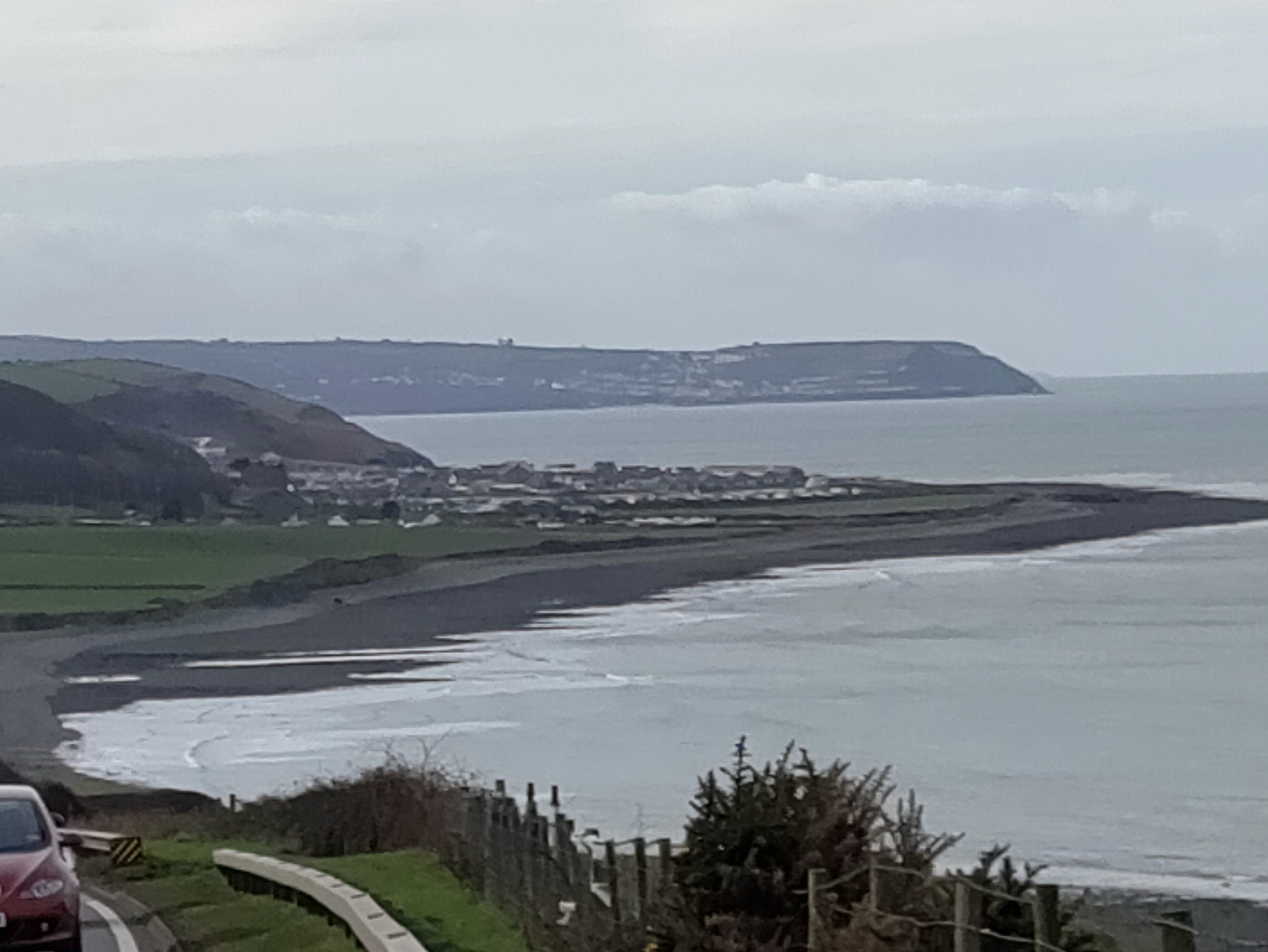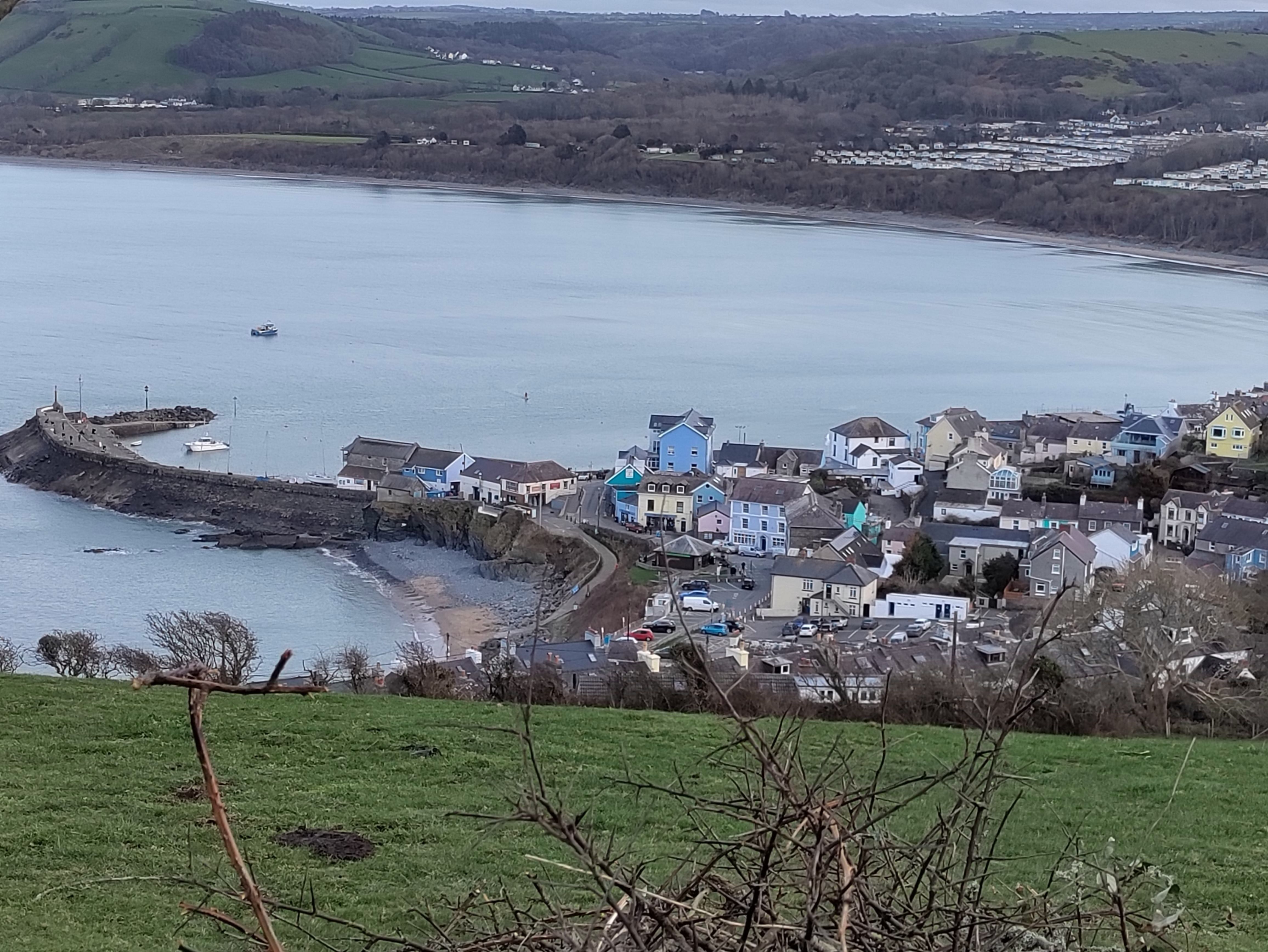 It’s down down down into New Quay harbour passing many holiday flats and houses. We wander along the harbour wall and get a great view of the lovely sandy beach, boats and pretty New Quay where many of its houses are painted in bright colours. We can see huge static caravan parks across Cardigan Bay all pointed out to sea.
