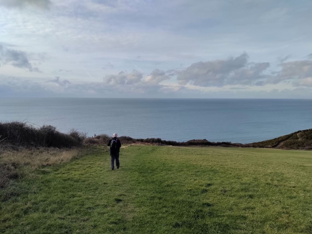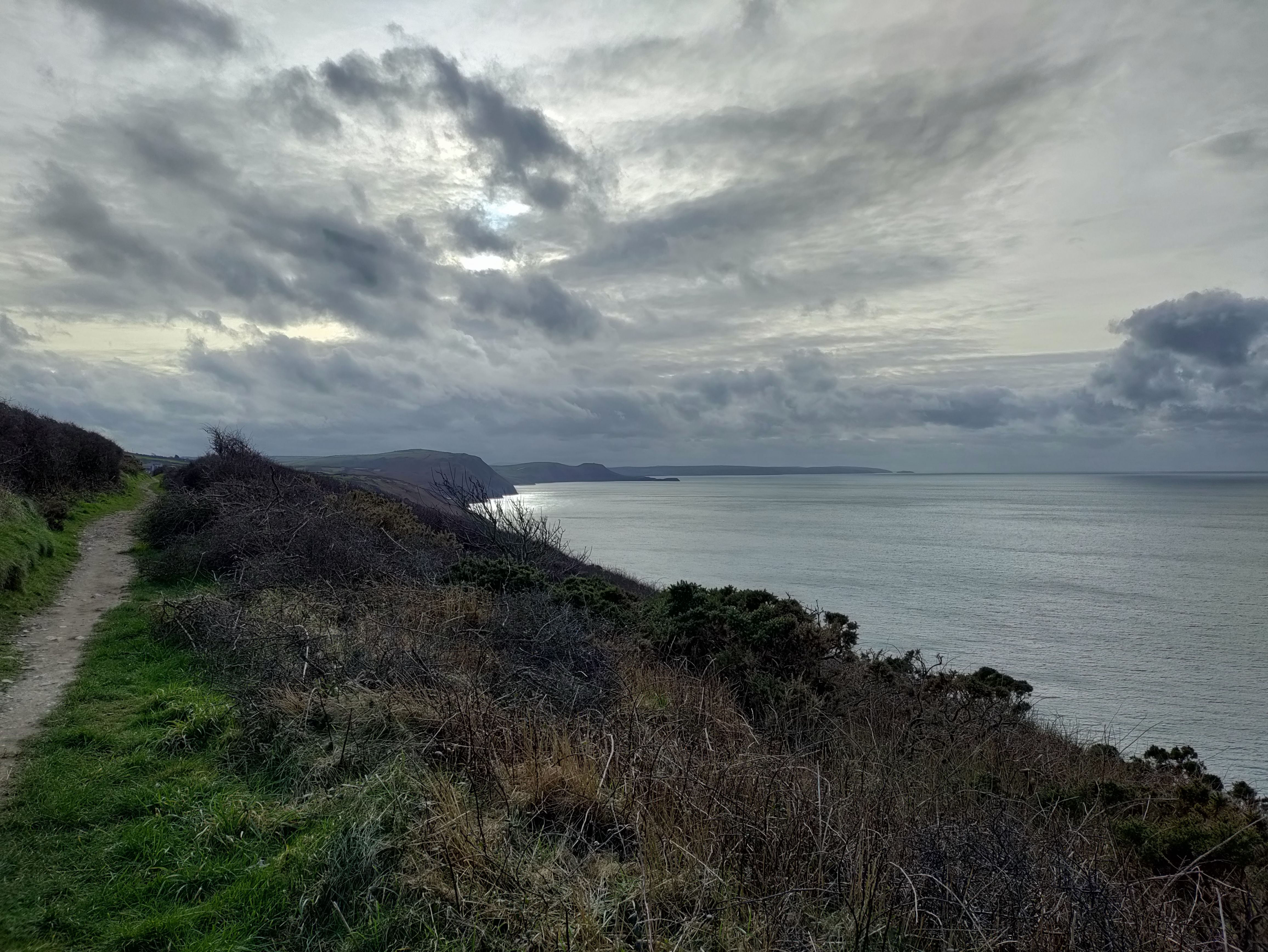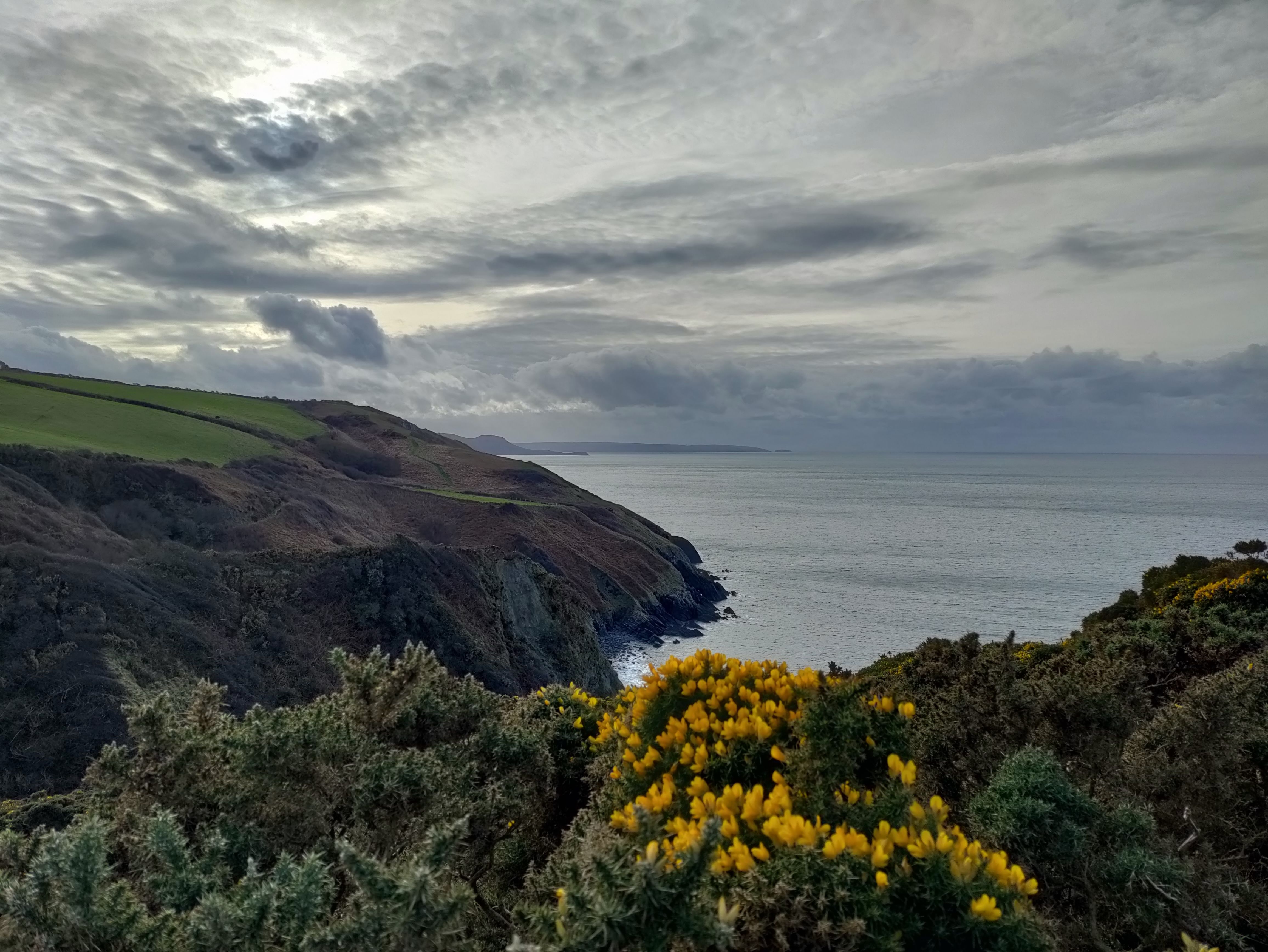 The route is a bit muddy at the start around the gates and stiles but dries up once we are on the coastal path. The views of the coast are great. It’s up and down with plenty of gorse around in flower. At one point the route narrows to less than a metre wide width a sharp drop off. Not somewhere to be in a gale. T takes that route but I go along the top to avoid a down and up bit. I do prefer the flat but you don’t often get flat coasts!