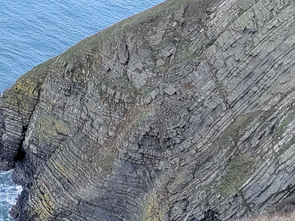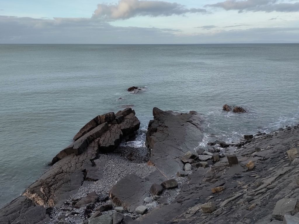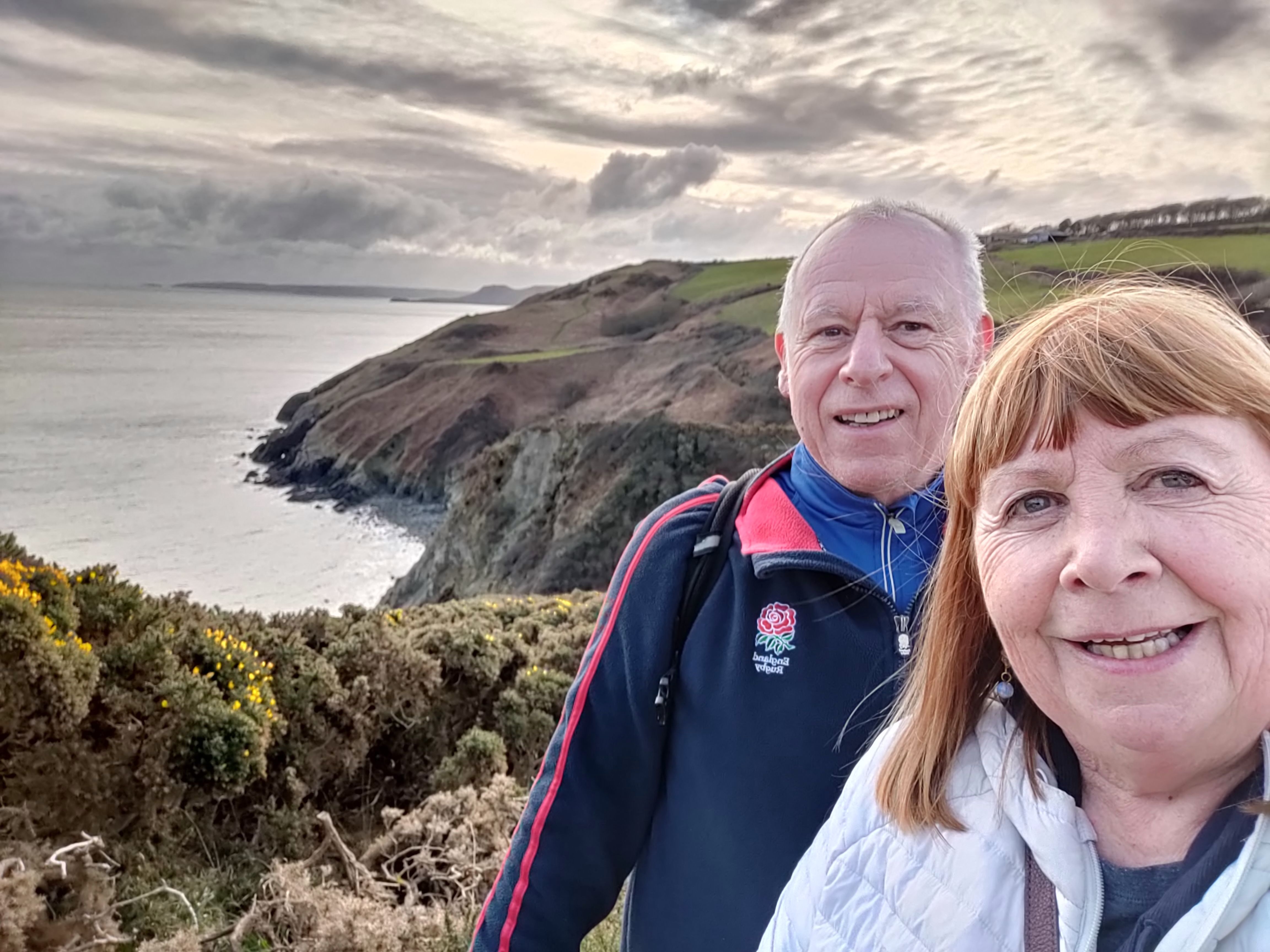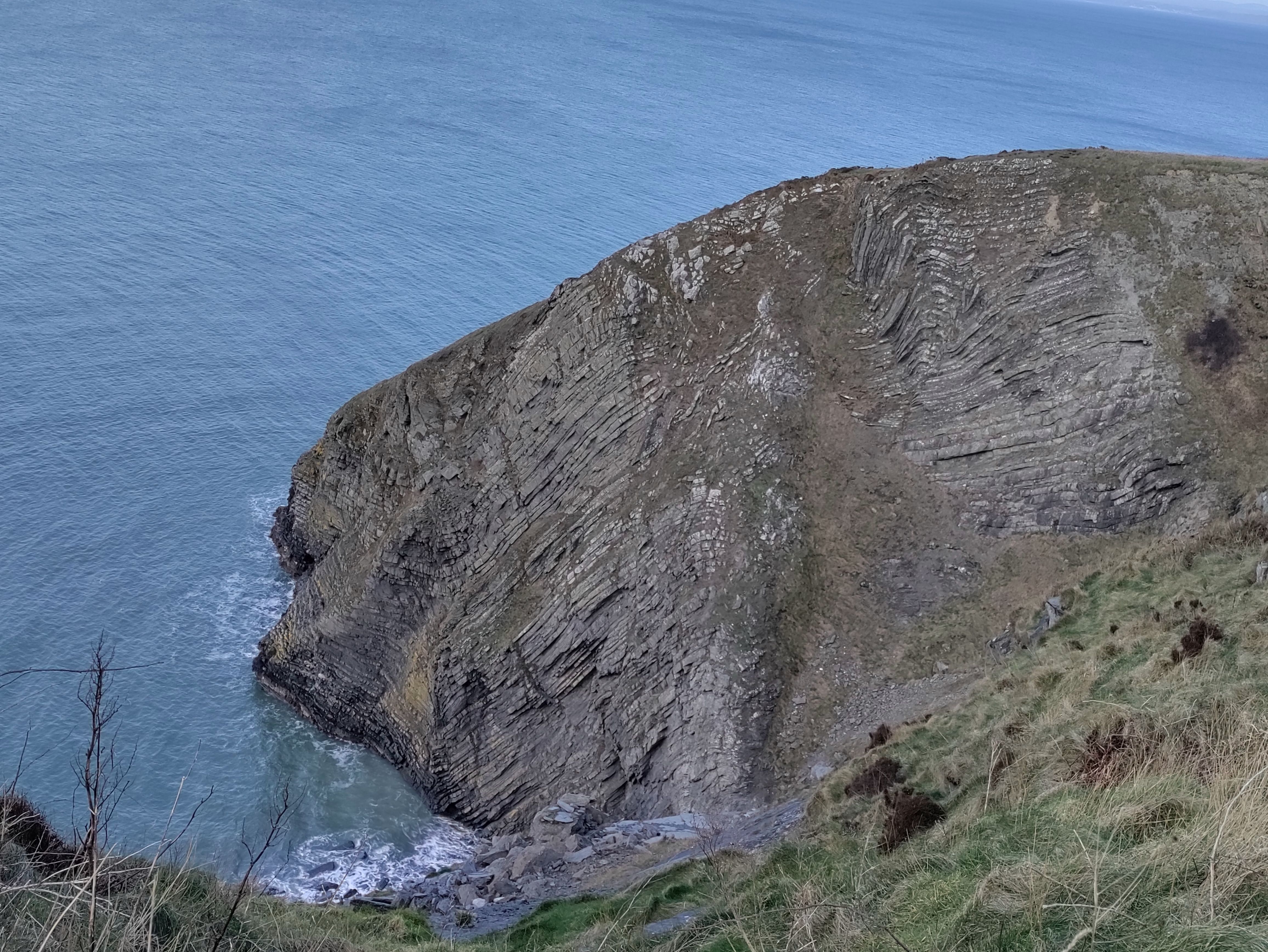 The route is a bit muddy at the start around the gates and stiles but dries up once we are on the coastal path. The views of the coast are great. It’s up and down with plenty of gorse around in flower. At one point the route narrows to less than a metre wide width a sharp drop off. Not somewhere to be in a gale. T takes that route but I go along the top to avoid a down and up bit. I do prefer the flat but you don’t often get flat coasts!