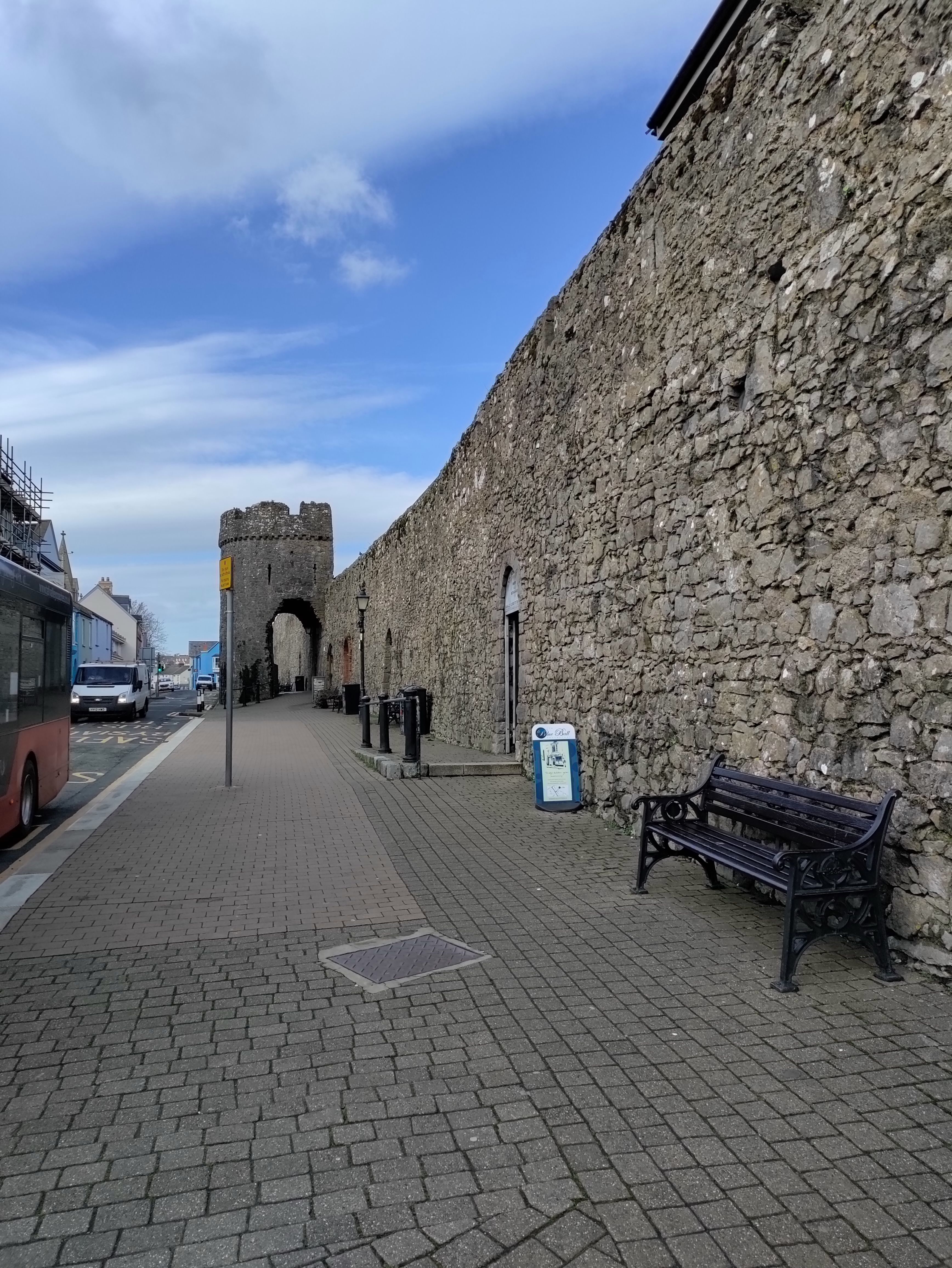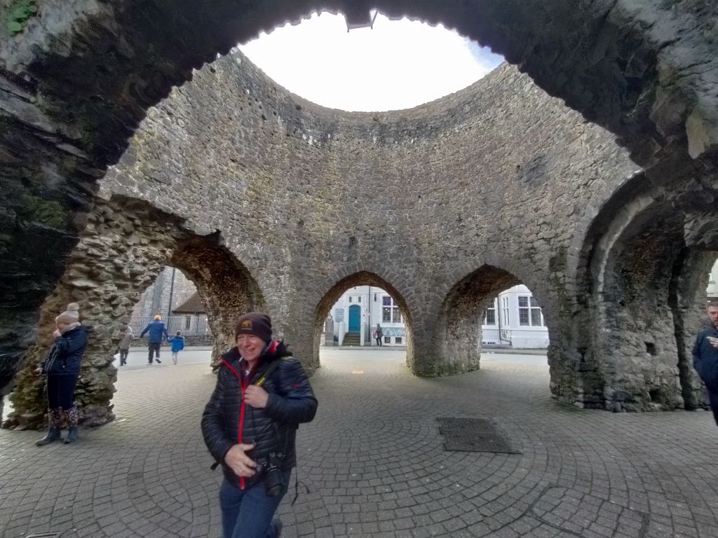 The bus stops alongside the 13C old town walls built by the Normans to keep the local Welsh out! We enter the town via Five Arches Gate and wander through the town via a maze of narrow streets.