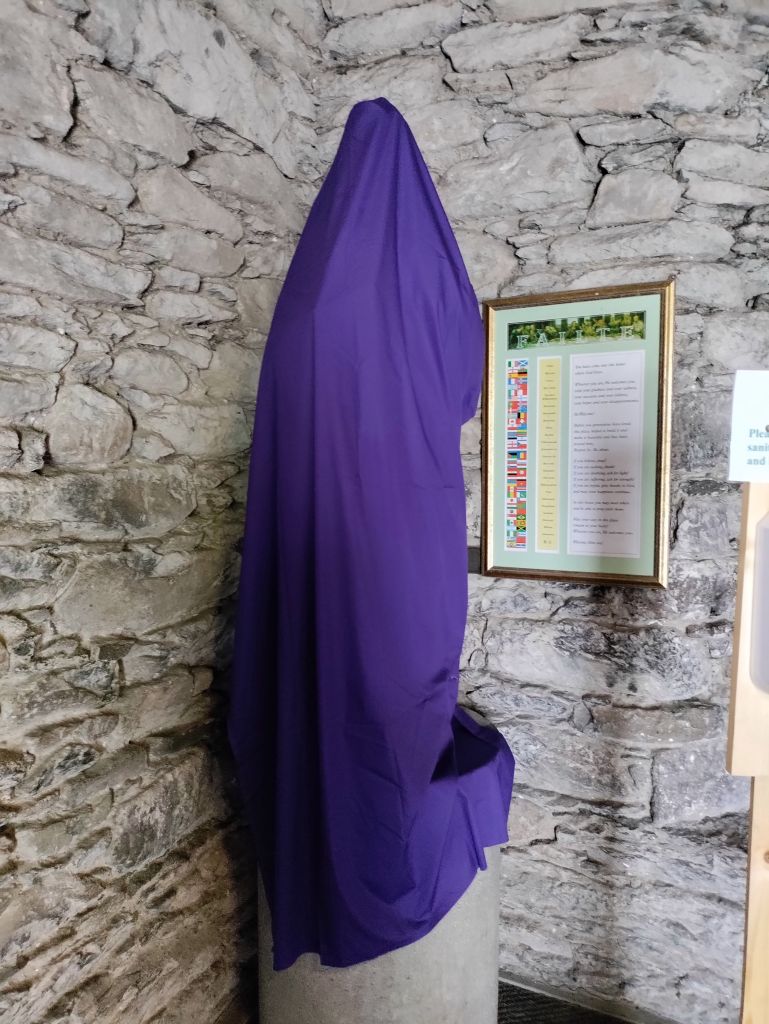 Up the hill, the Sacred heart church is open and we are surprised to read that’s it’s part of a university in Massachusetts and that there’s a campus here in Dingle!