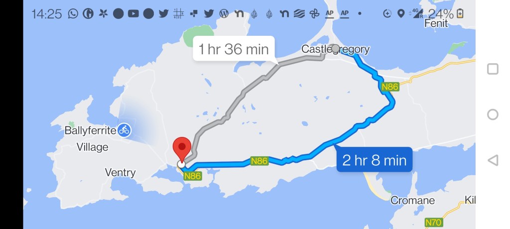 We leave Castlegregory late morning and head into Dingle making sure we don’t take the route over the Conor Pass, its shorter but we won’t fit!