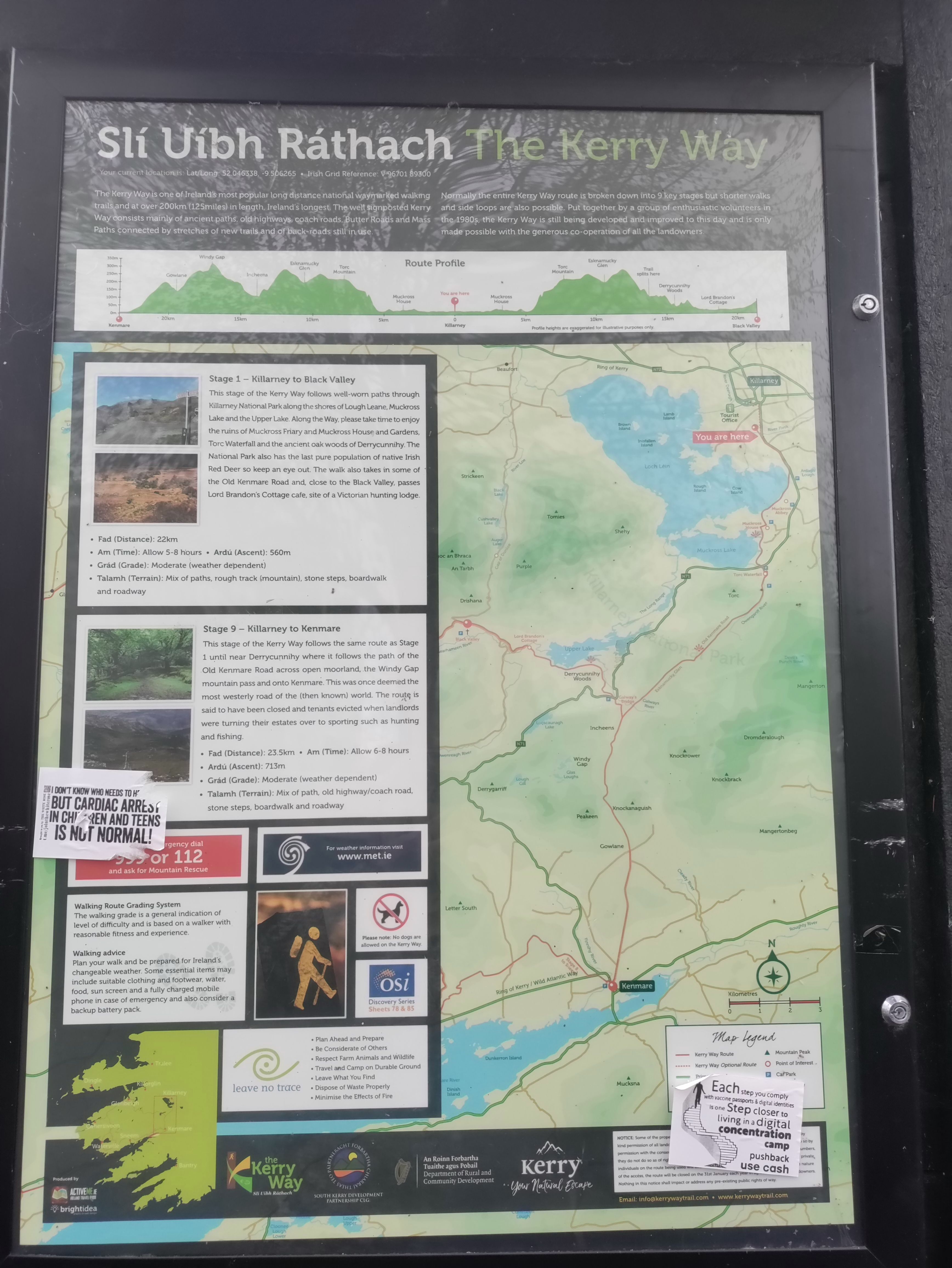 It’s a grey and rainy one today. On and off all day. We hide in the van until late afternoon and then wander into Killarney. The track opposite our campsite is a part of the Kerry Way, a signposted walking trail over 200km long.