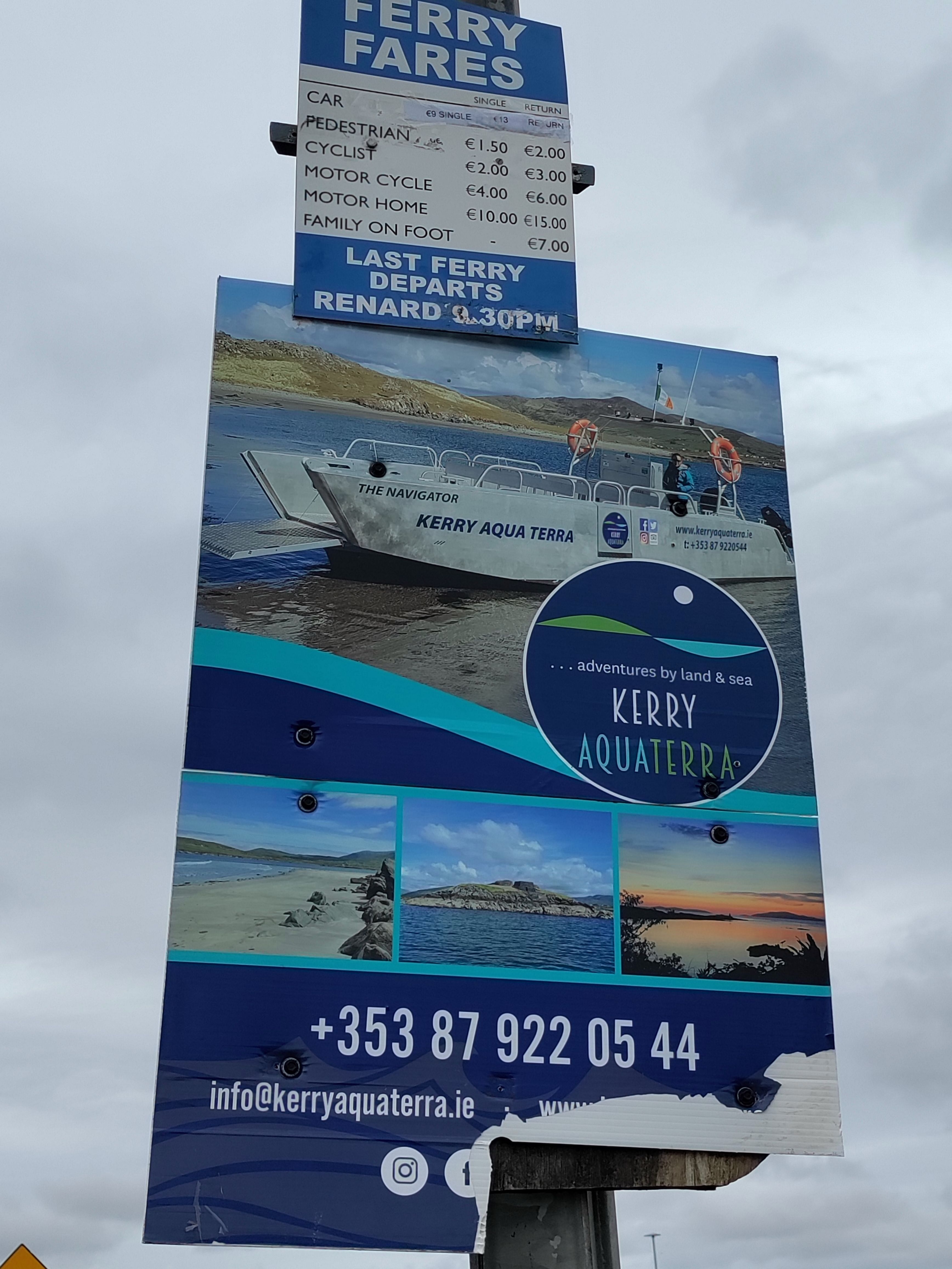 It’s at the bottom of a hill and we don’t have long to wait for it to arrive. It’s a tiny roll on/roll off ferry and we wait in line with a couple of cars and some foot passengers. It’s only a kilometre across so it’s a 5 minute sail across to the Knightstown Harbour. €3 each return for us and a bike.