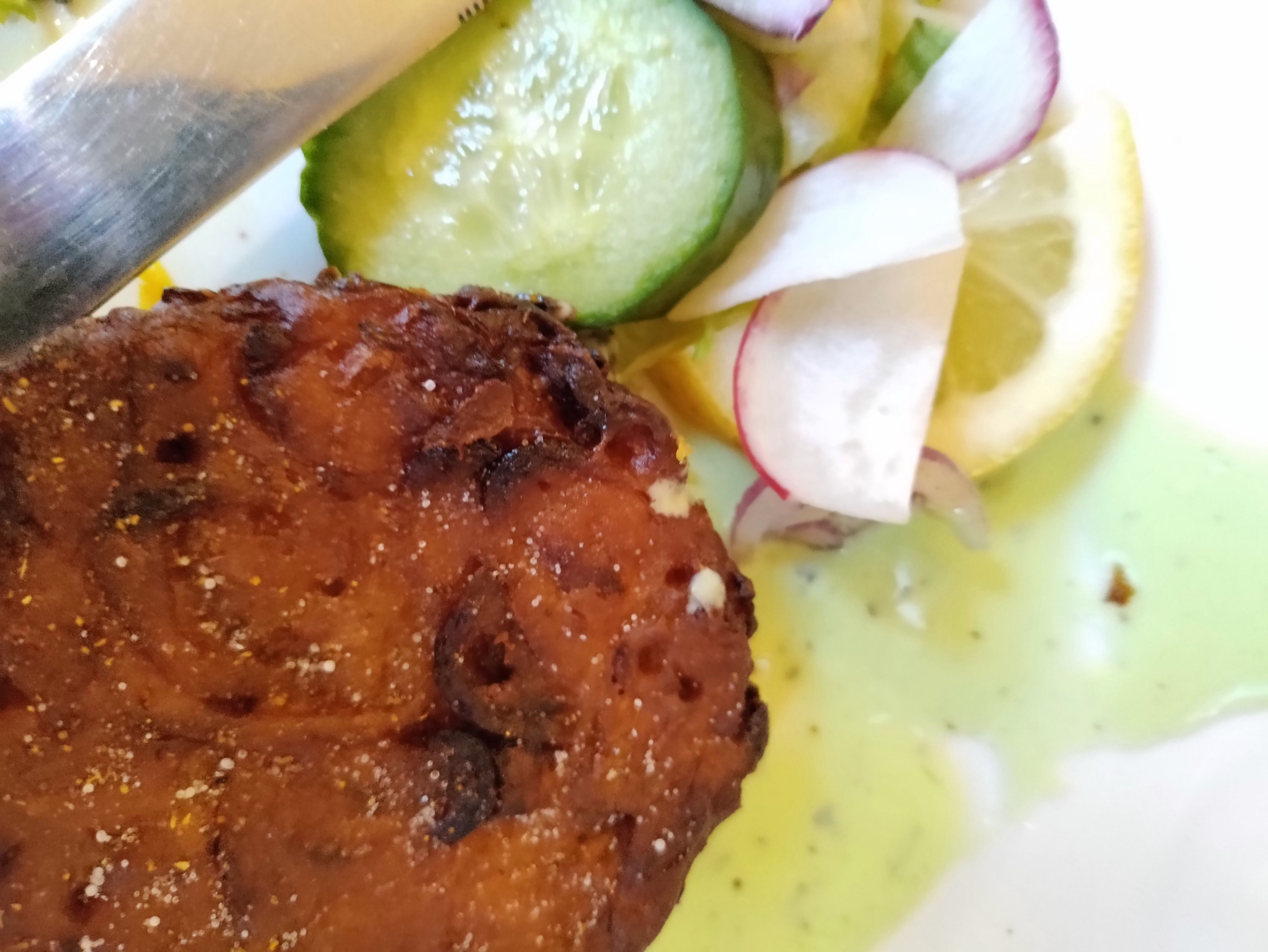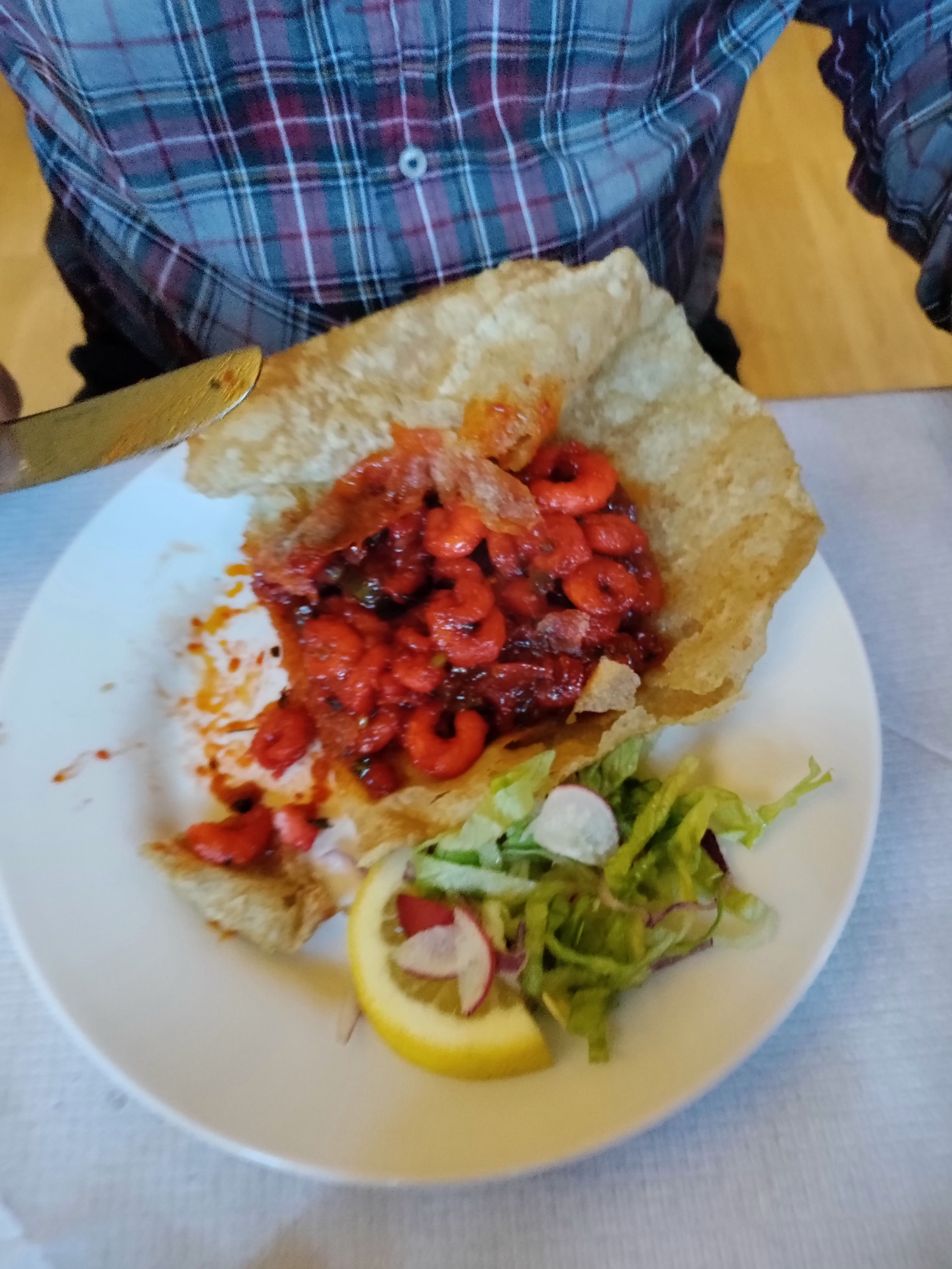 A bit of salmon pate on bruschetta and a cuppa and it’s time to go out for dinner. A curry tonight in the only Indian restaurant in town. Sadly it’s rather disappointing and possibly the worst onion bhajis I’ve ever eaten! Flat as pancakes and over cooked.