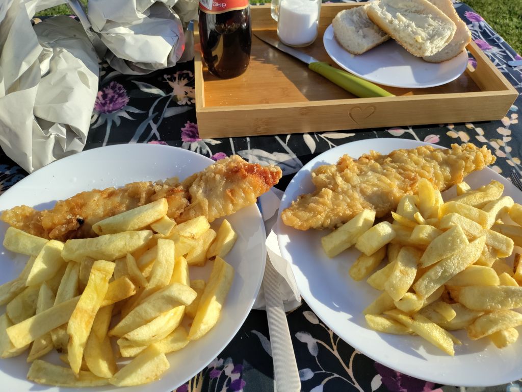 Back to the van to do a bit of washing and sit in the sunshine again. T goes to get our chippy tea. Taking Alice’s advice we order just one portion of fish and chips and it easily feeds both of us.