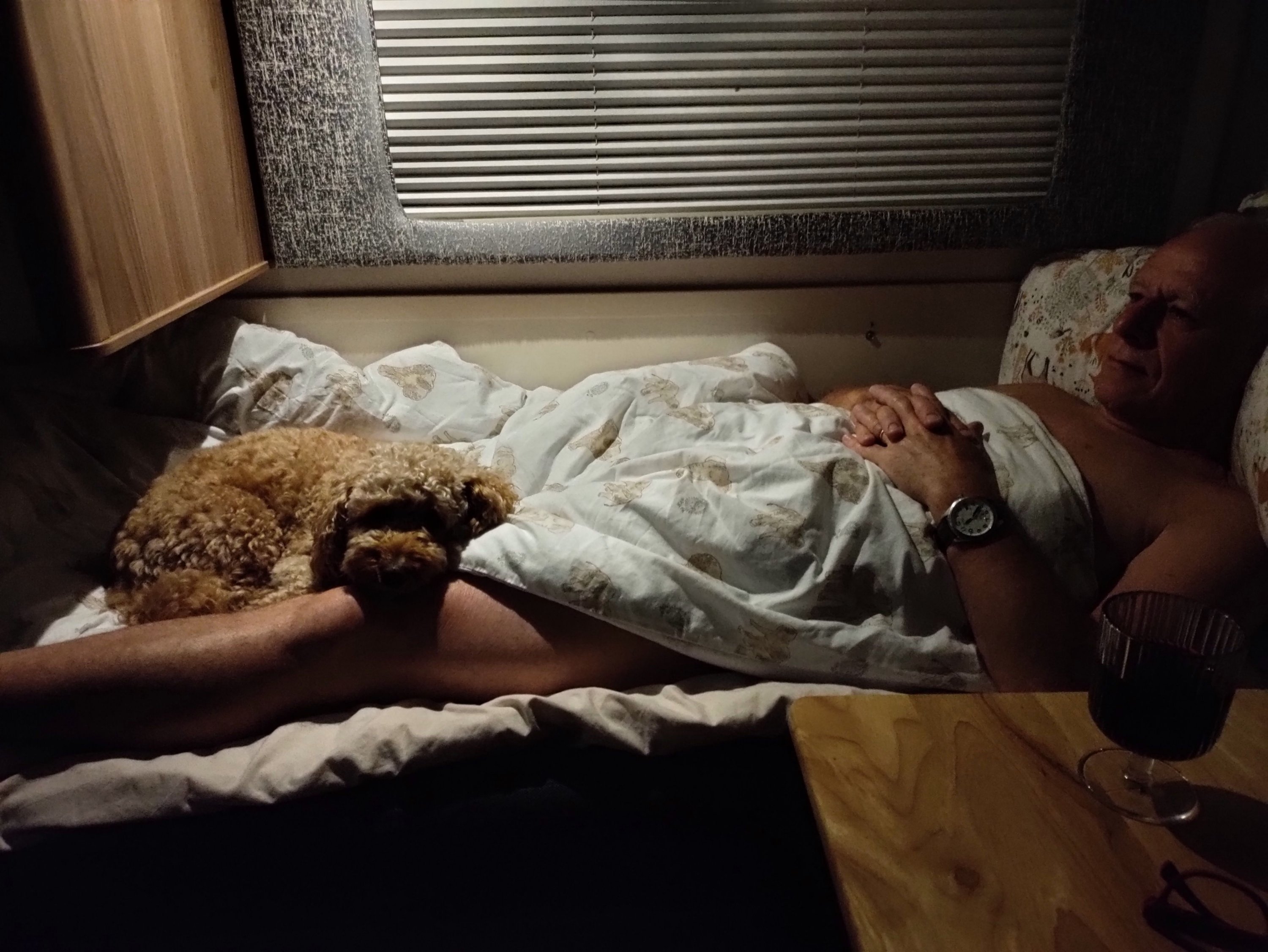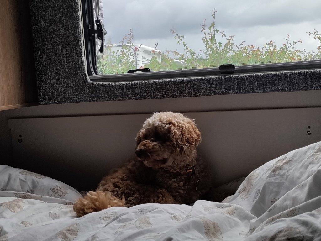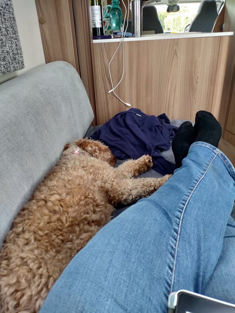 Awake after a night of heavy rain and noise from the awning. Nala slept the night on the end of my bed and seems to have settled in the van well.