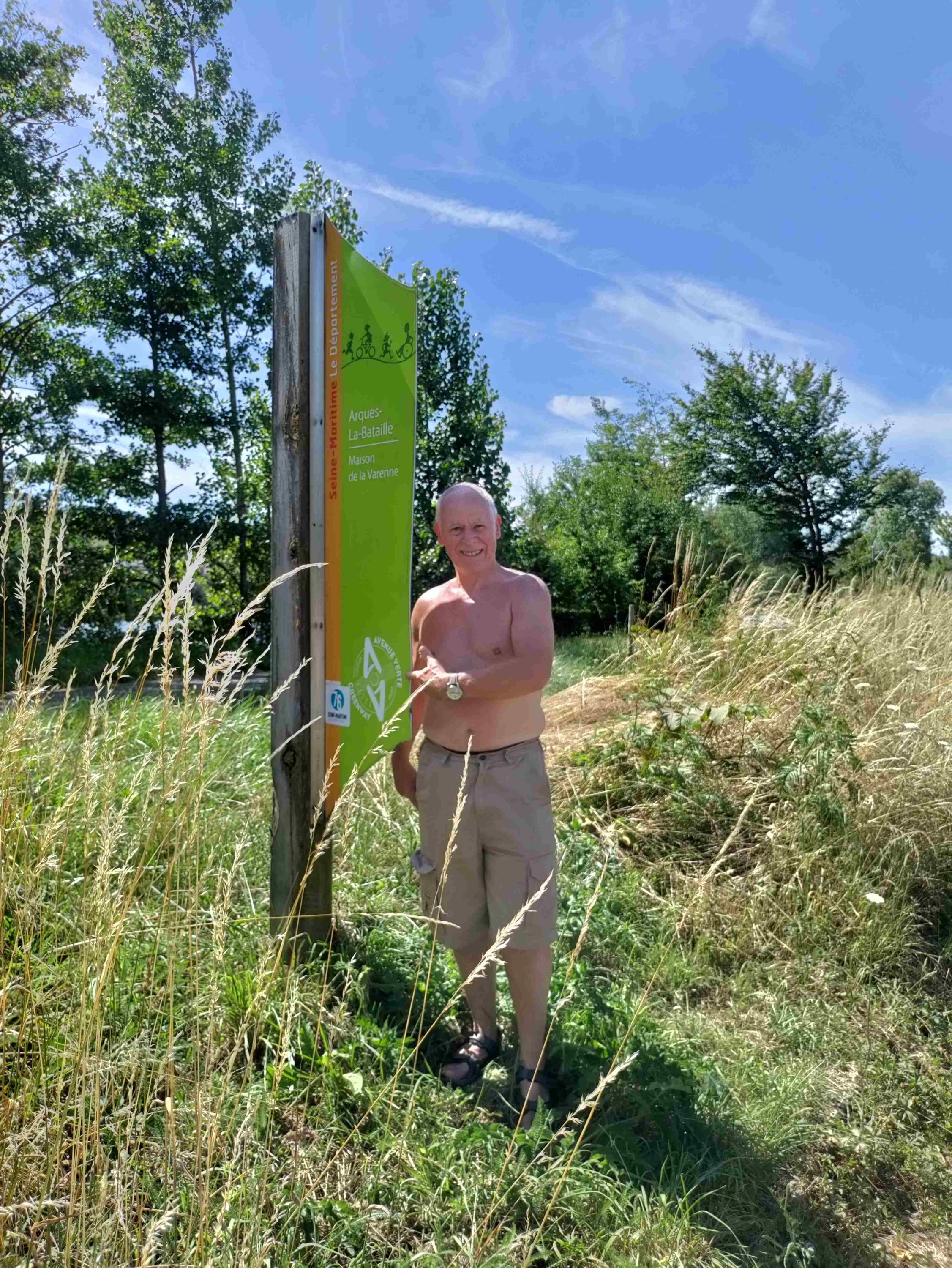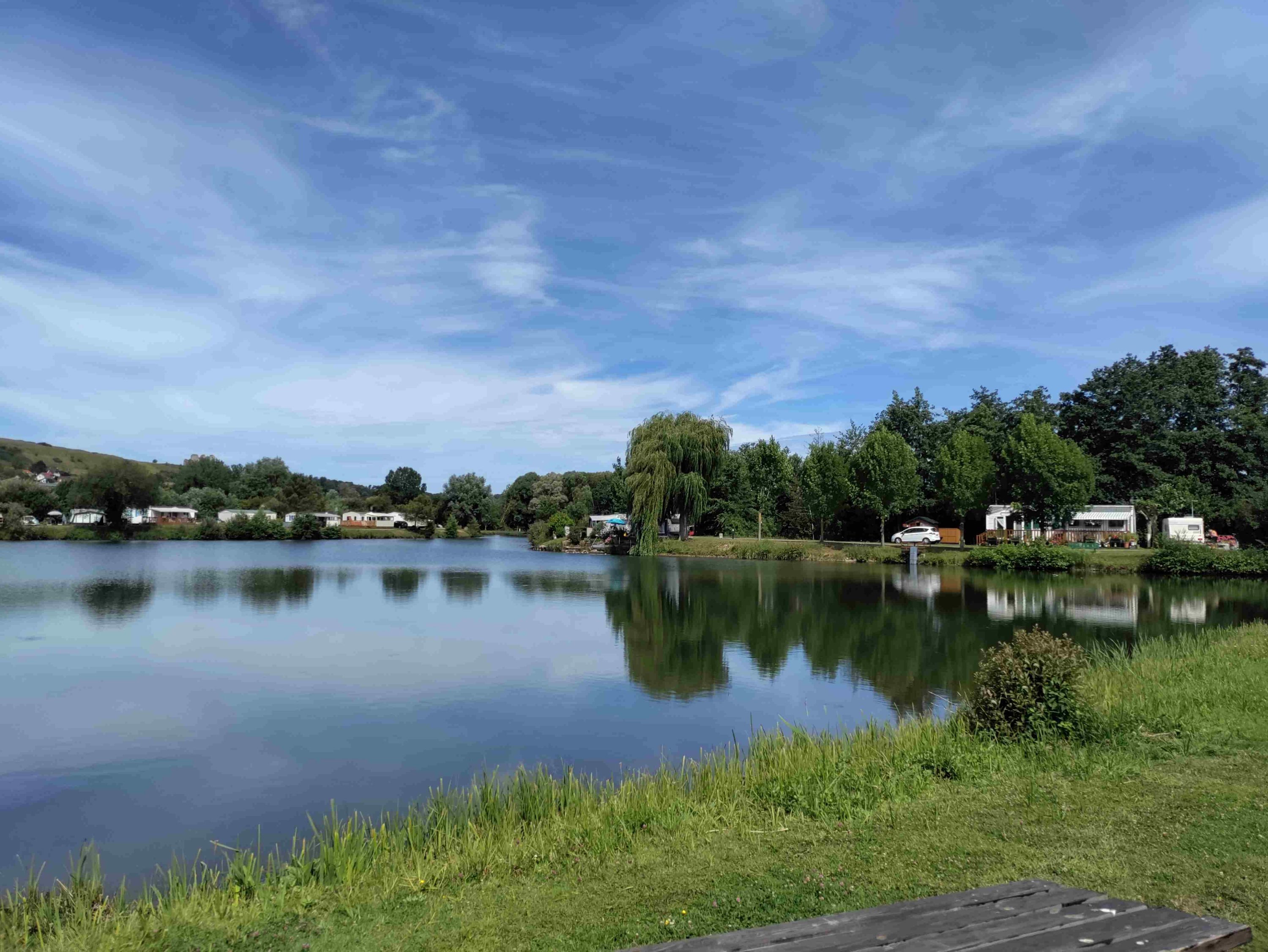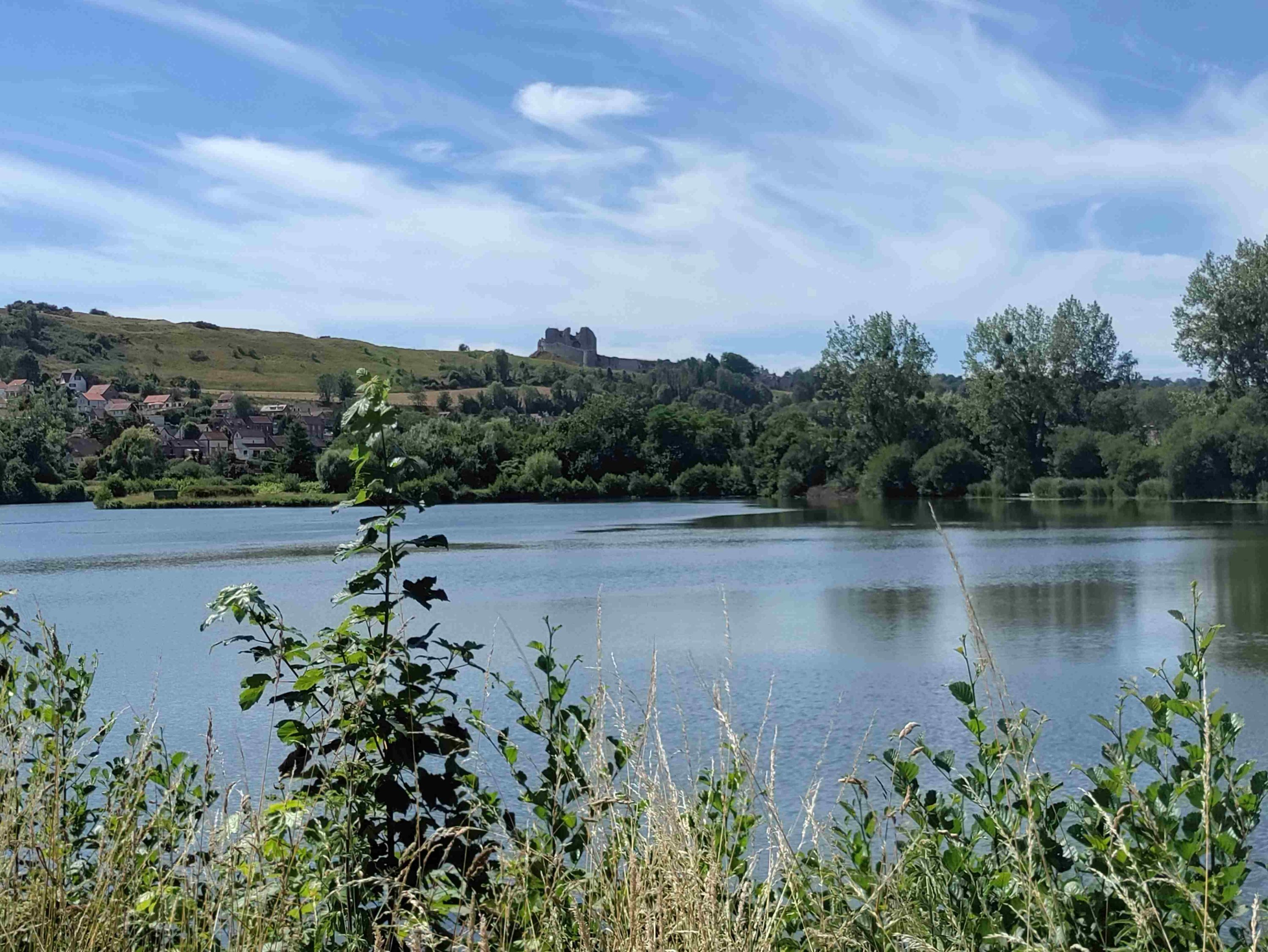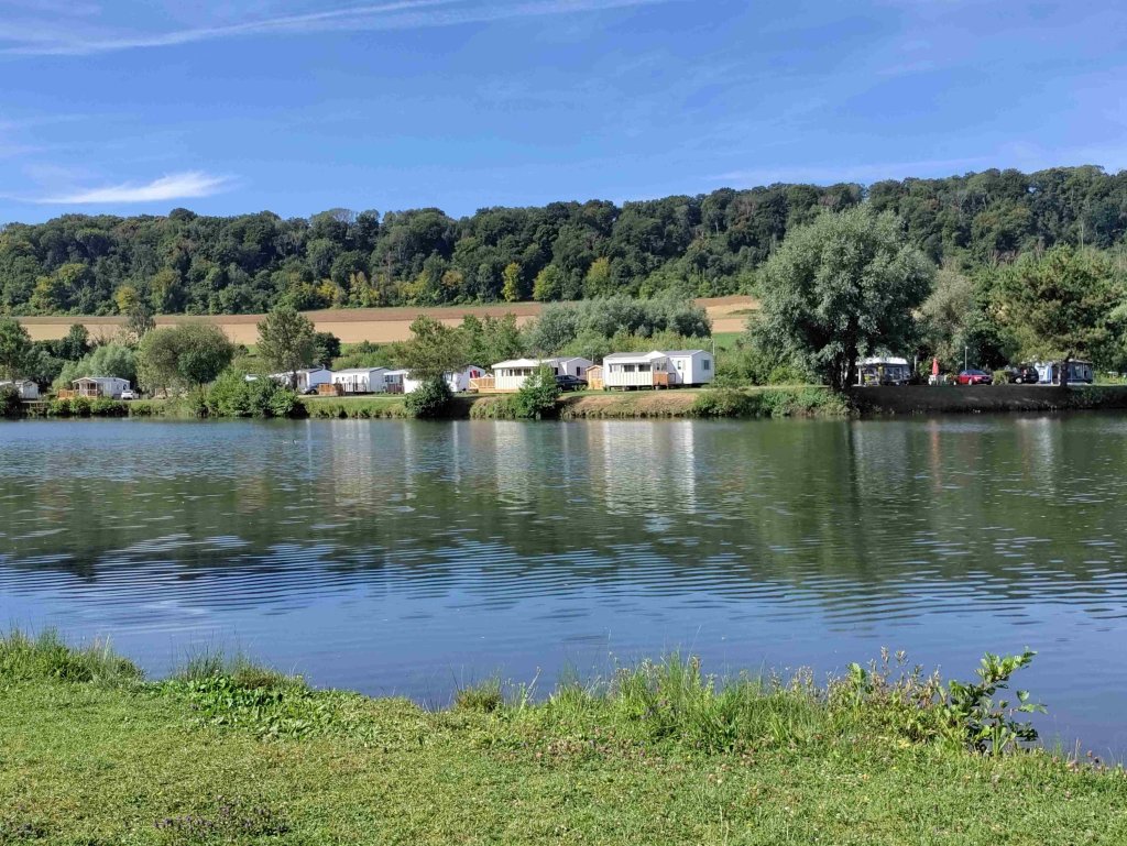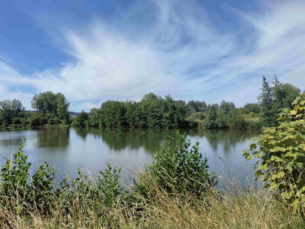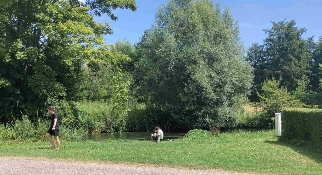 After we’ve relocated our day is spent doing not much other than reading, eating and drinking. At our new spot we have a distant view of the lake and a closer one of the River Varenne. Also have a couple of trees which are very welcome.
