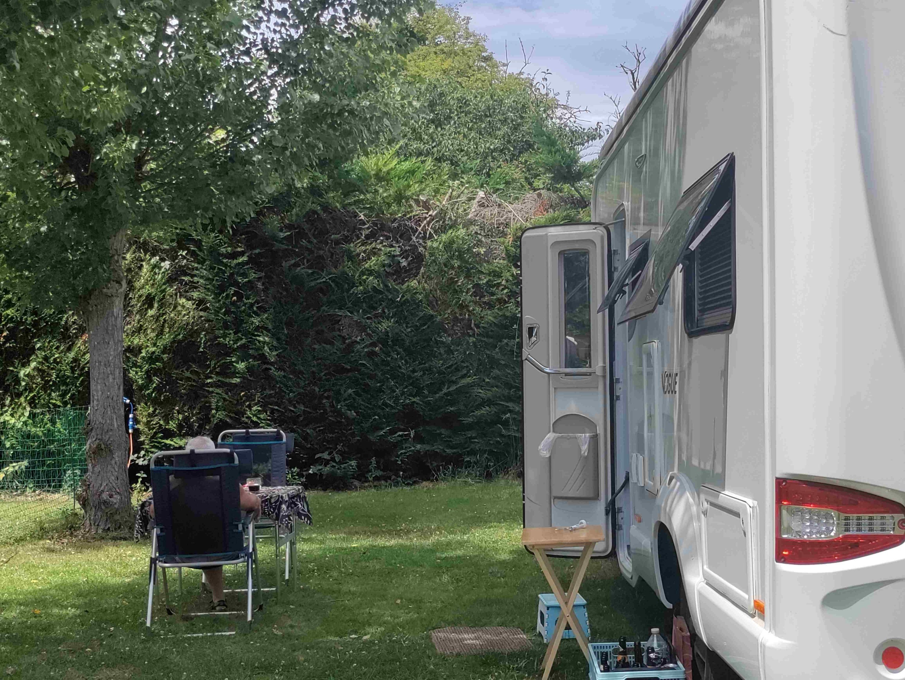A friendly couple from Brighton arrive early evening on the next pitch. They’d been driving since 10am and had struggled to find a campsite. They had a couple of dogs with them, one of them we think was a Chow Chow which was struggling with the heat. It was a big ball of black fur. Swapped motorhome war stories and convinced them to use their motorhome loo!