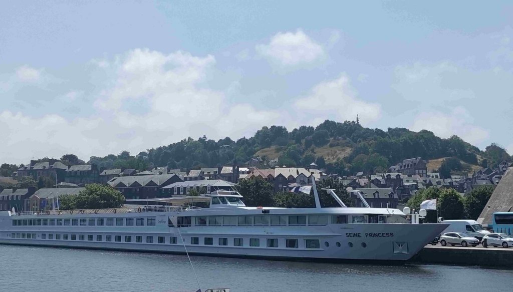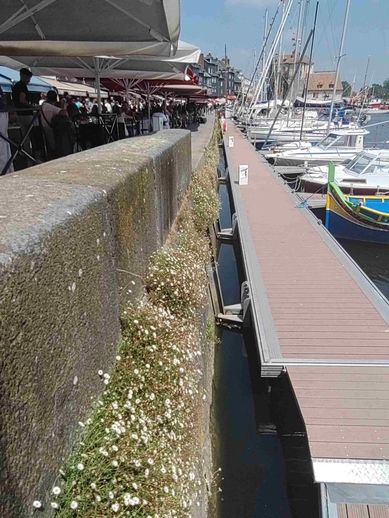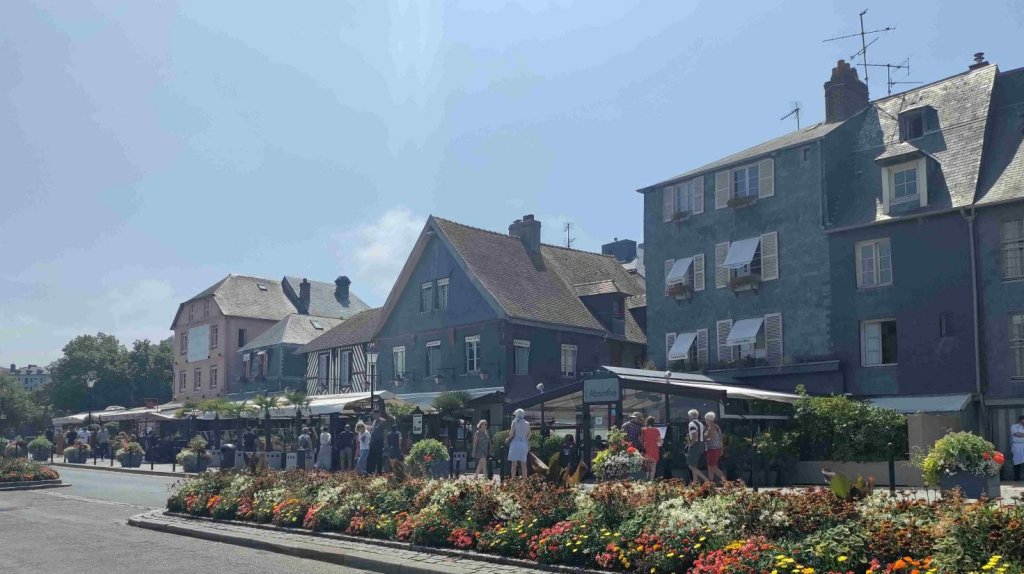 We have a butty and a cuppa and then wander into Honfleur passing huge hotel barges that travel up and down the River Seine. The port is a series of basins linked to the river. It’s a very pretty sight with the Town Hall covered in window boxes and restaurants and shops running three sides around the Vieux Bassin dock. There’s all sorts of yachts moored up many with huge masts and rigging decorated with flags. How do yacht designers decide how long a mast should be, it’s a mystery. Absolutely heaving on this Bank holiday with people bustling too and fro and many sitting enjoying a late lunch, drinks and ice-cream.