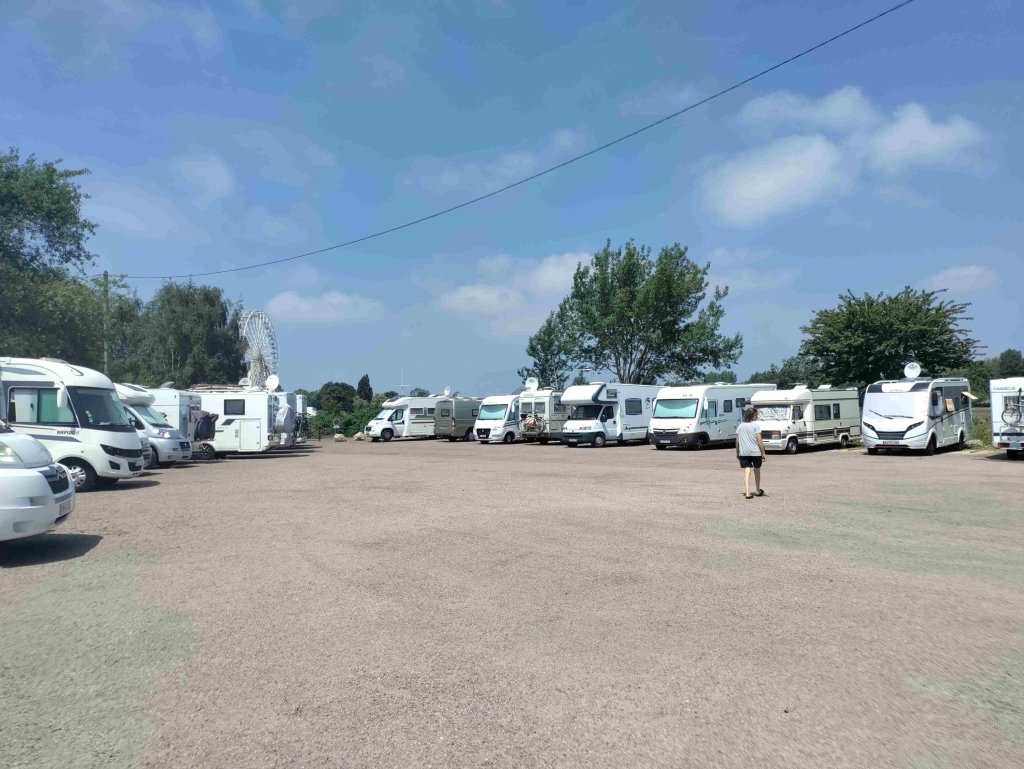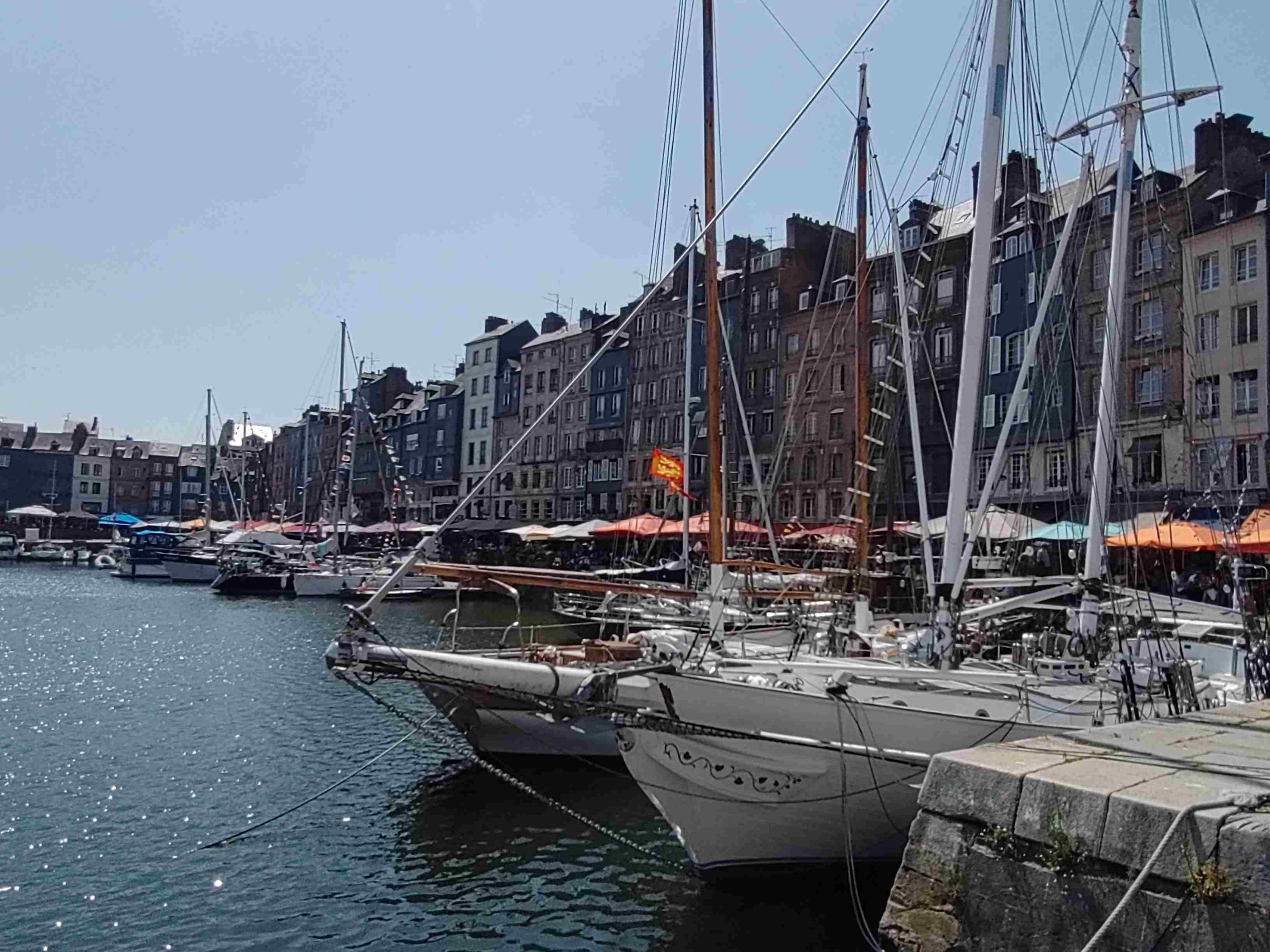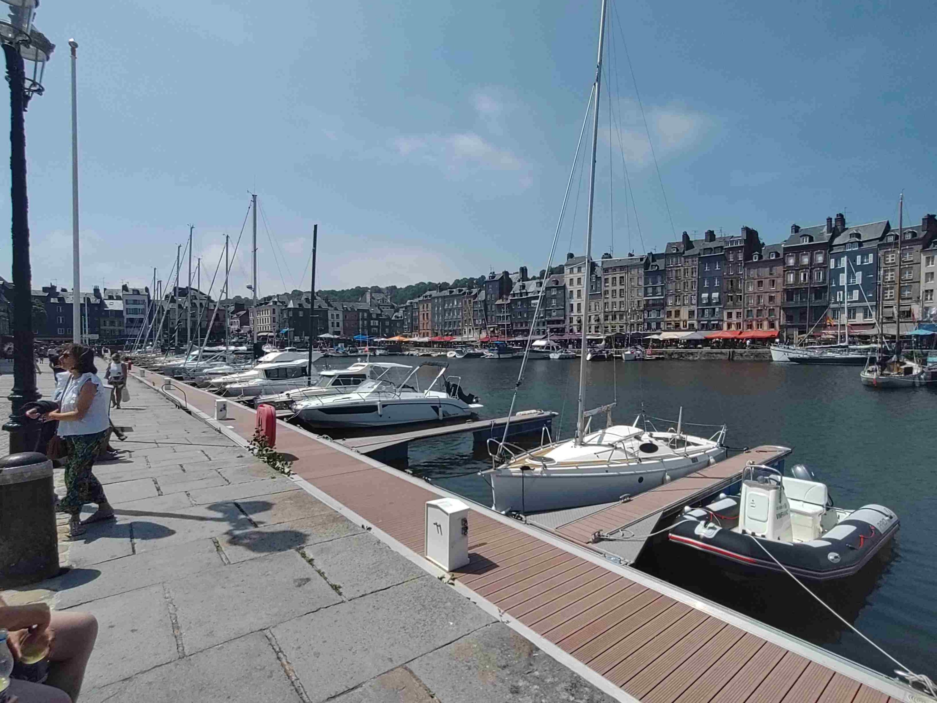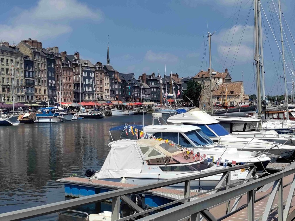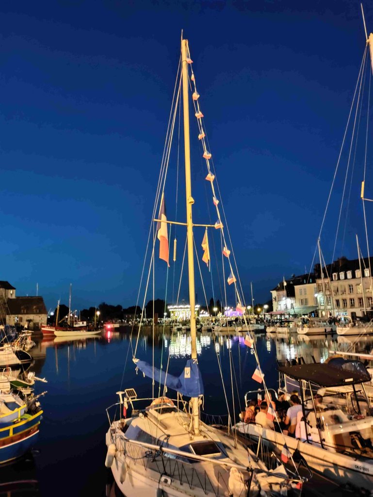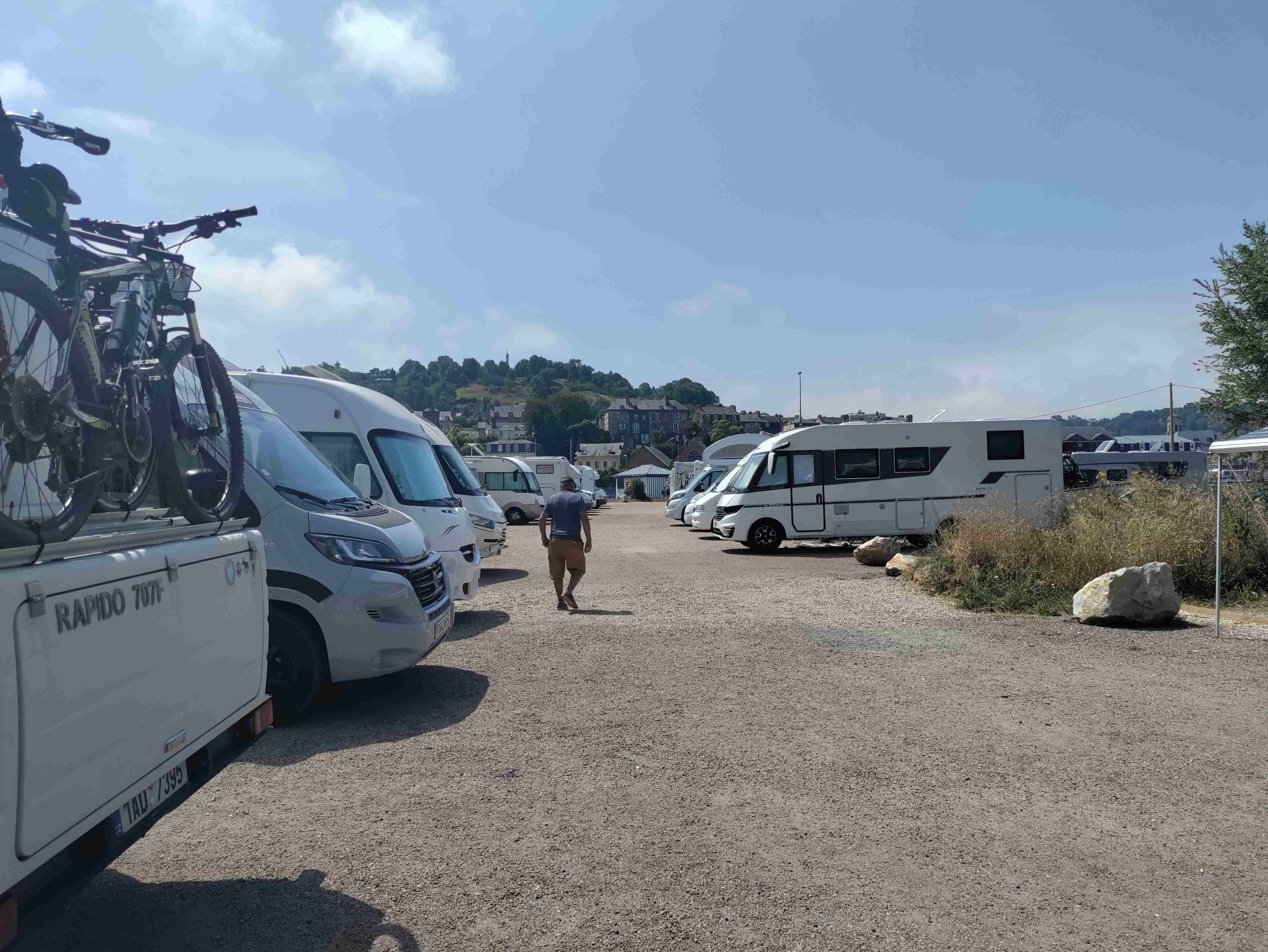 Arrive at the Aire in Honfleur which is rammed and basically a huge carpark with a few pitches with electricity. We are told by a local that it’s probably full but we have a look and find a pitch with easy access! Feeling lucky as it’s Bastille Day after all. No power available but that’s ok as we can use gas for the fridge and 12v power for the rest. RV’s are parked like sardines but each pitch is marked which helps a lot and it’s so handy for the town and only €12 for 24 hours.