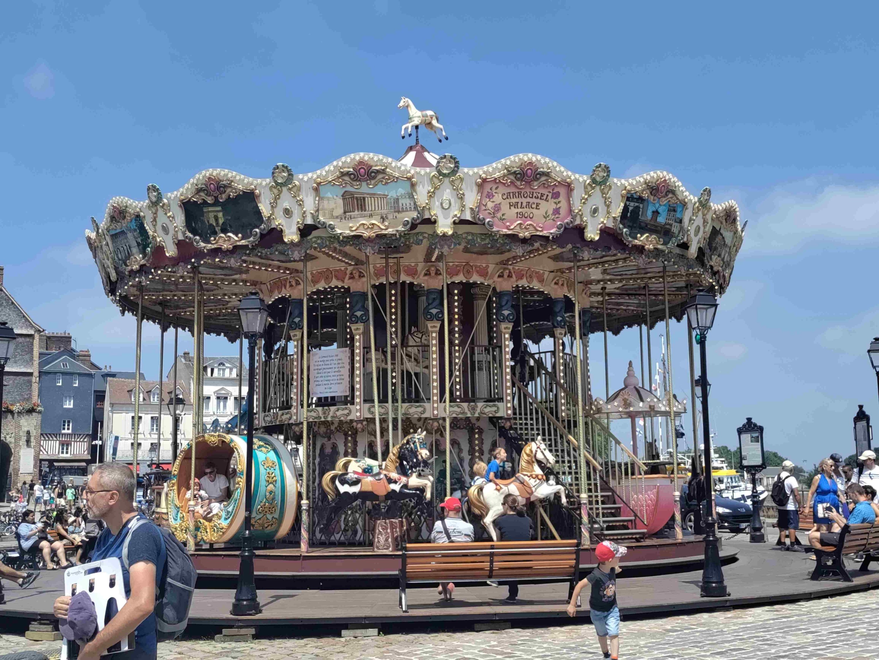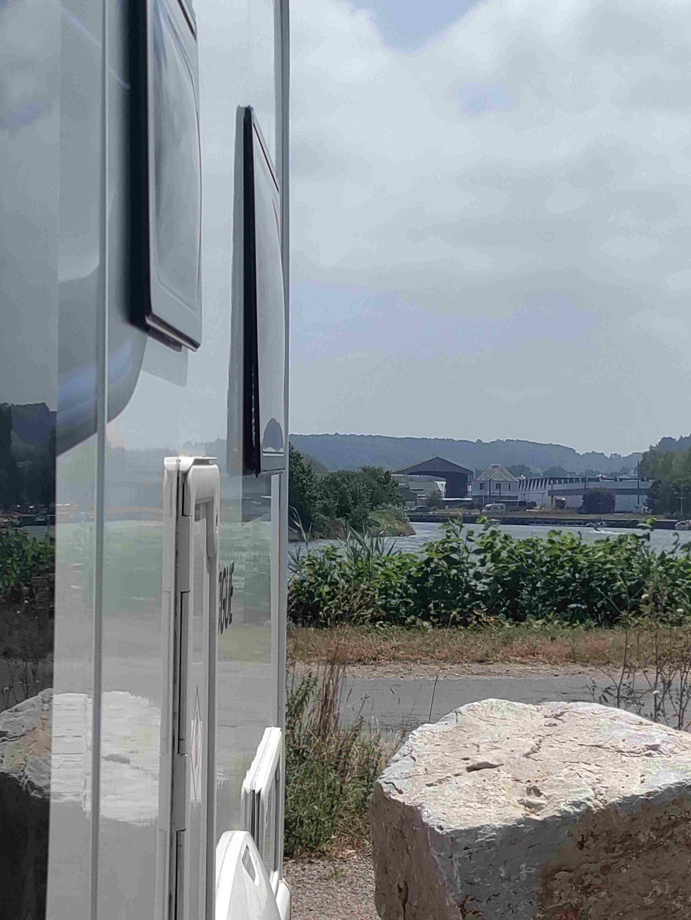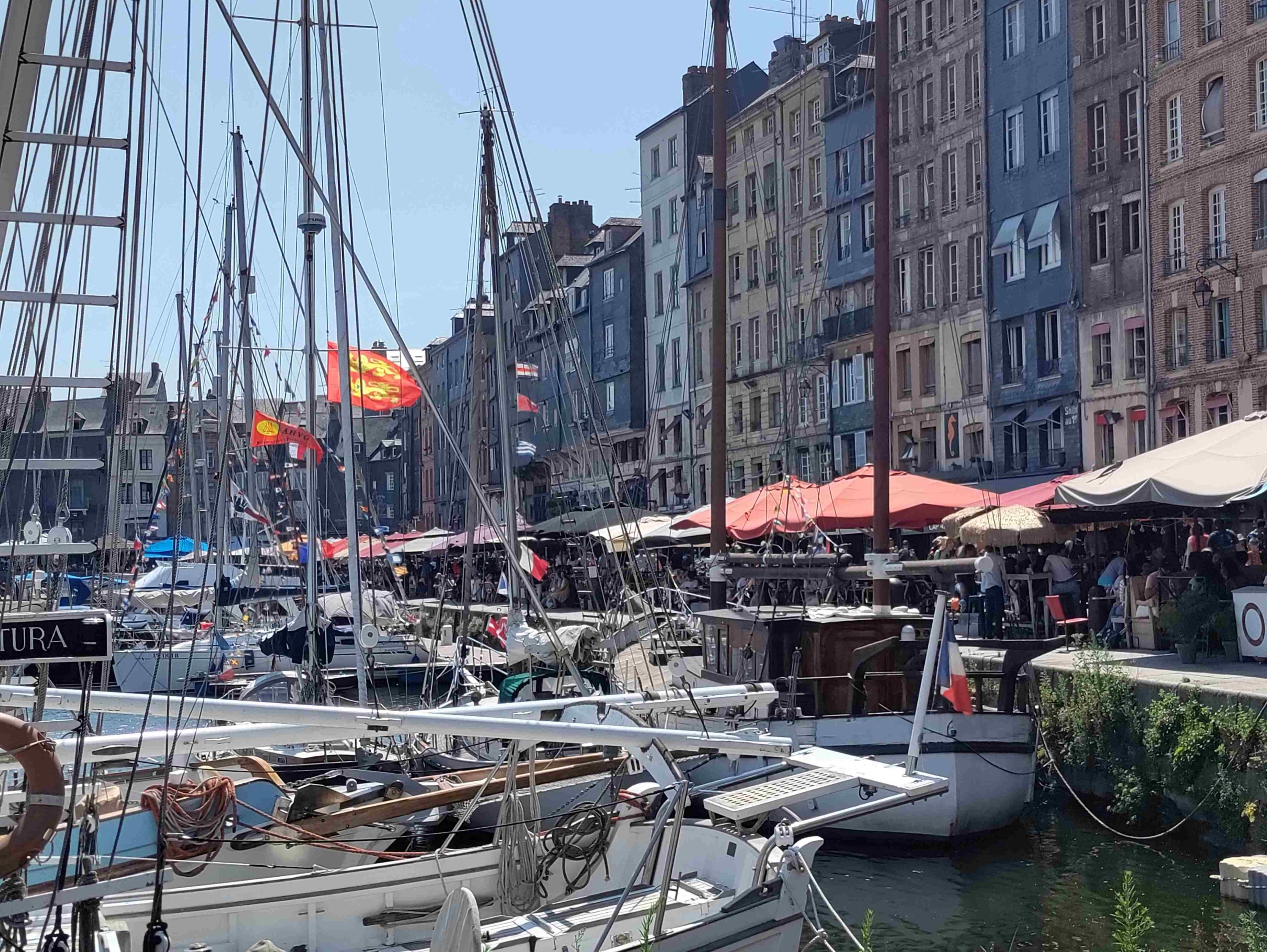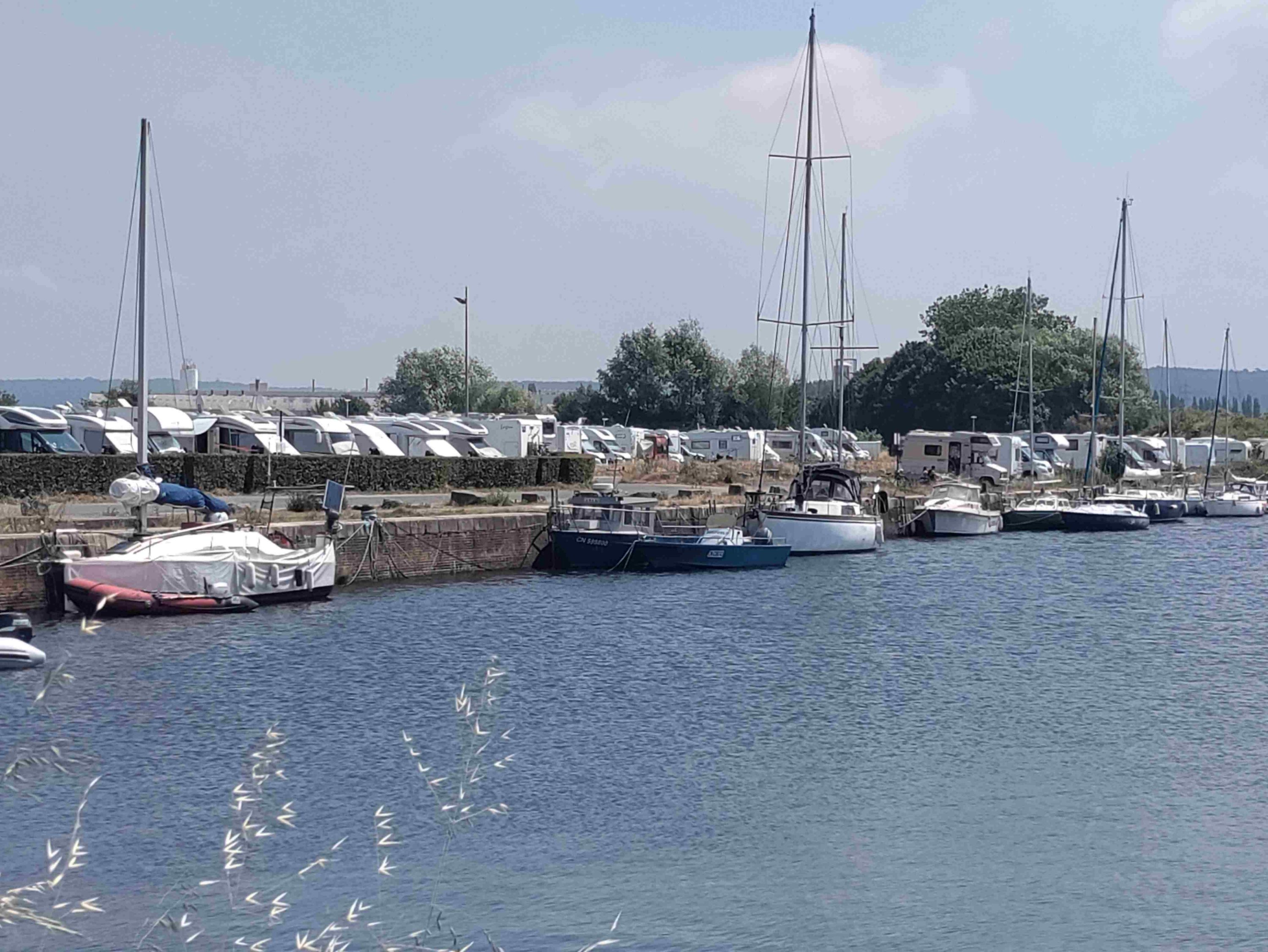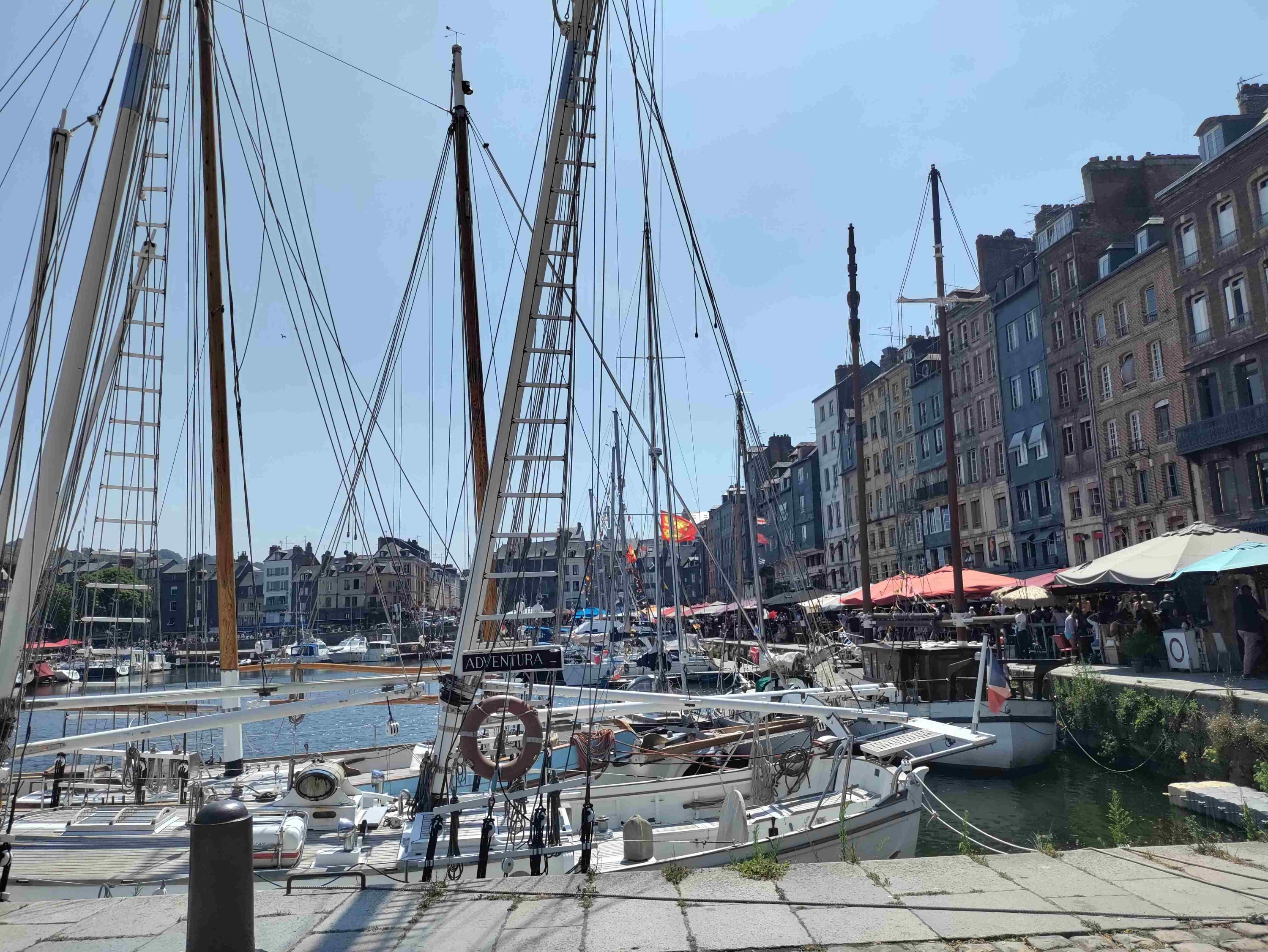 Arrive at the Aire in Honfleur which is rammed and basically a huge carpark with a few pitches with electricity. We are told by a local that it’s probably full but we have a look and find a pitch with easy access! Feeling lucky as it’s Bastille Day after all. No power available but that’s ok as we can use gas for the fridge and 12v power for the rest. RV’s are parked like sardines but each pitch is marked which helps a lot and it’s so handy for the town and only €12 for 24 hours.