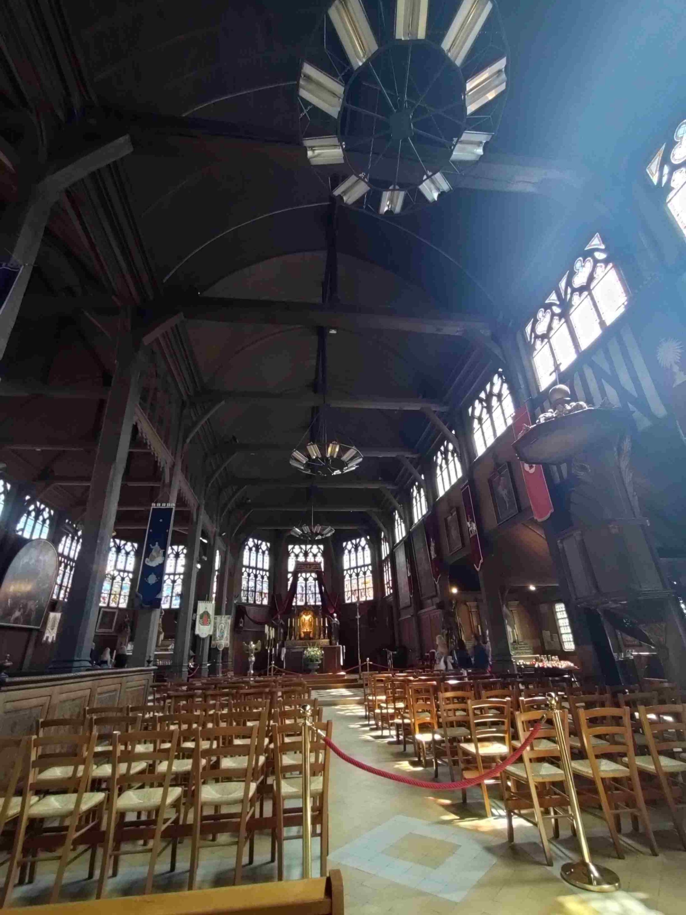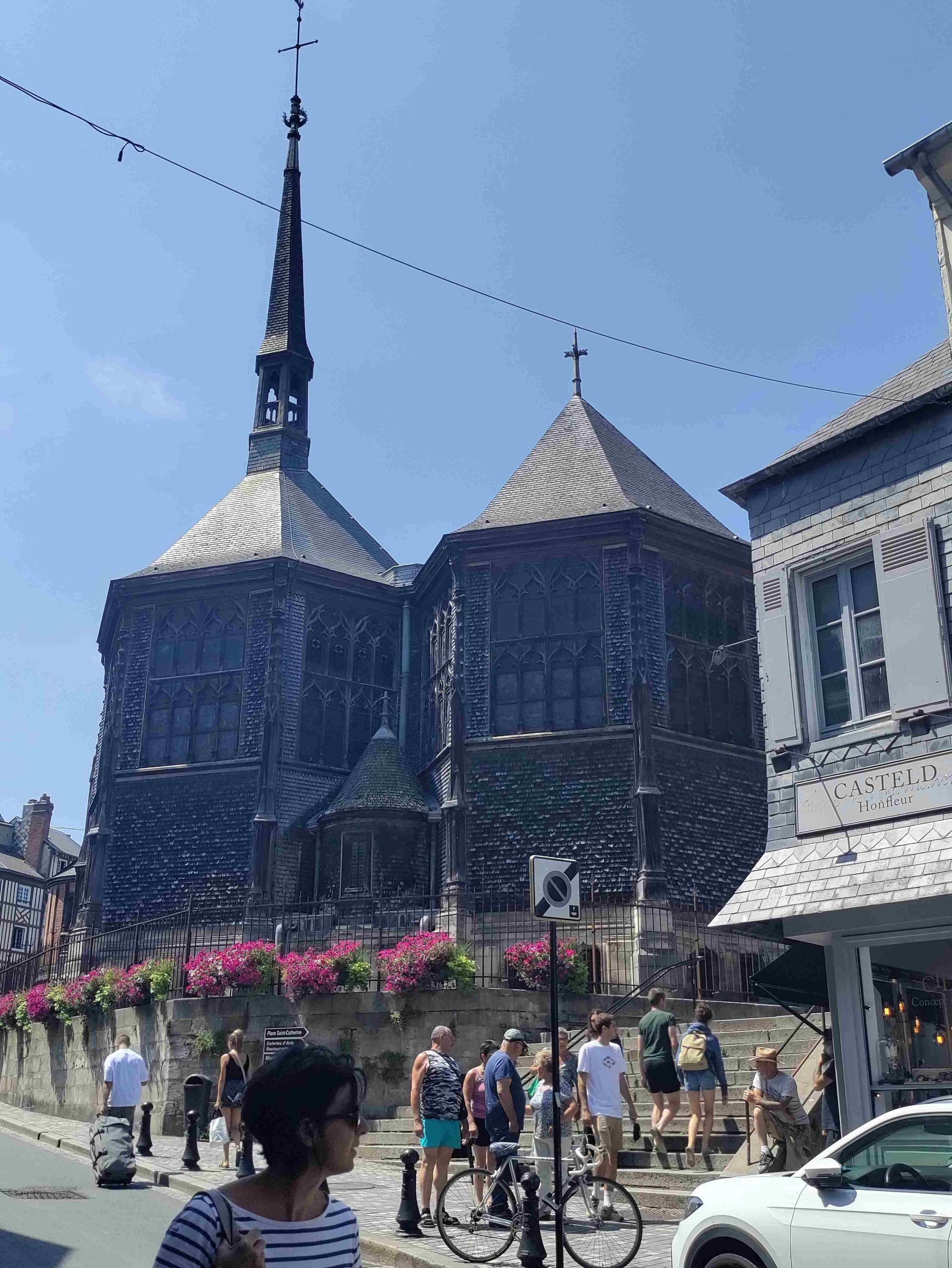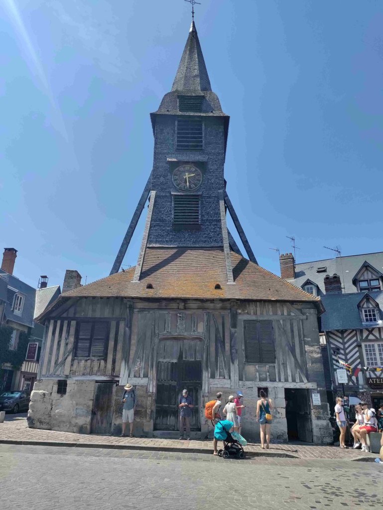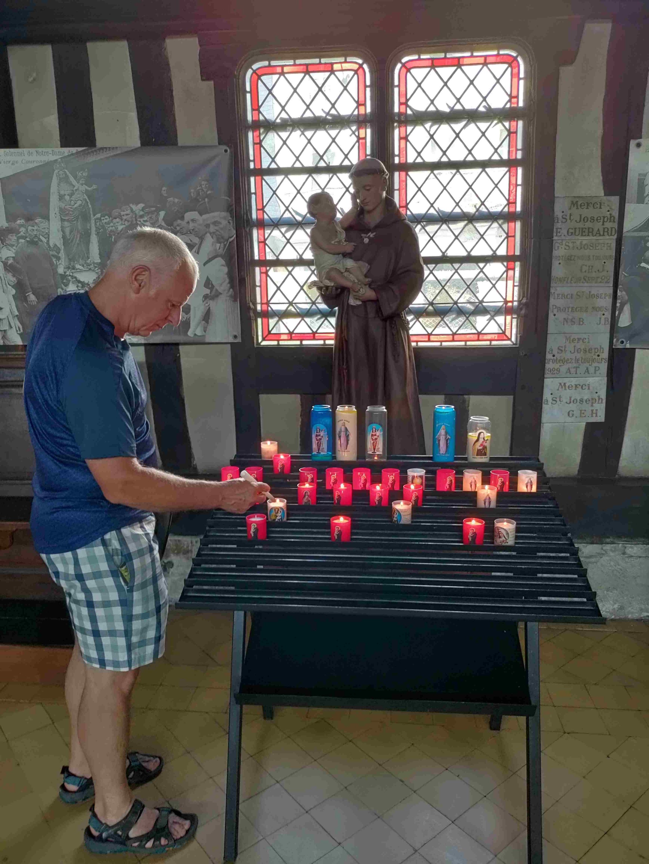 After a wander around spotting some lovely art we visit the largest wooden church in France, St Catherine’s, which has been standing since the 15C replacing a stone built version destroyed in the 100 years war. It’s lovely inside and has many candles burning in lots of small altars. T is happy to light one to St Anthony his fave and namesake.
