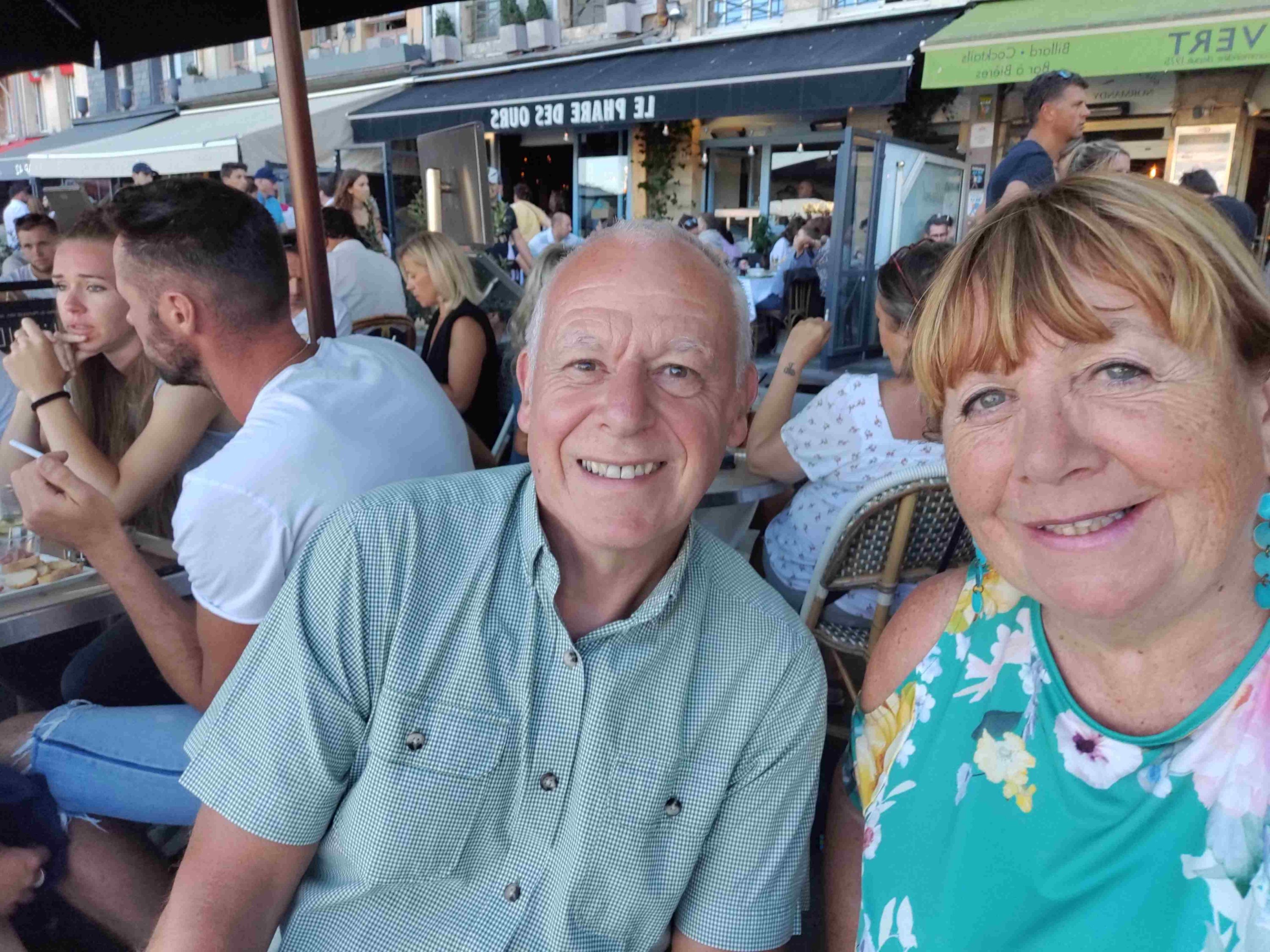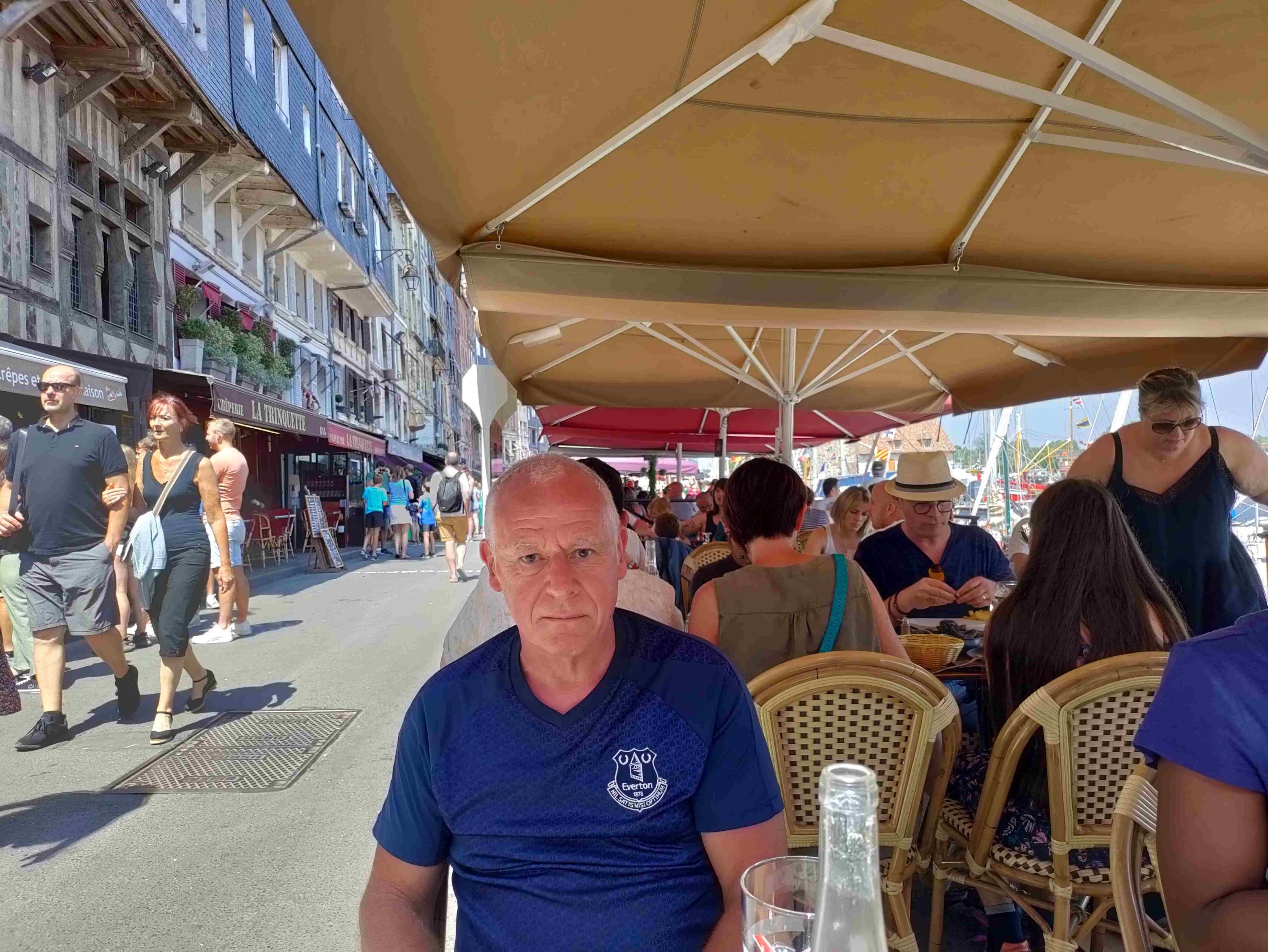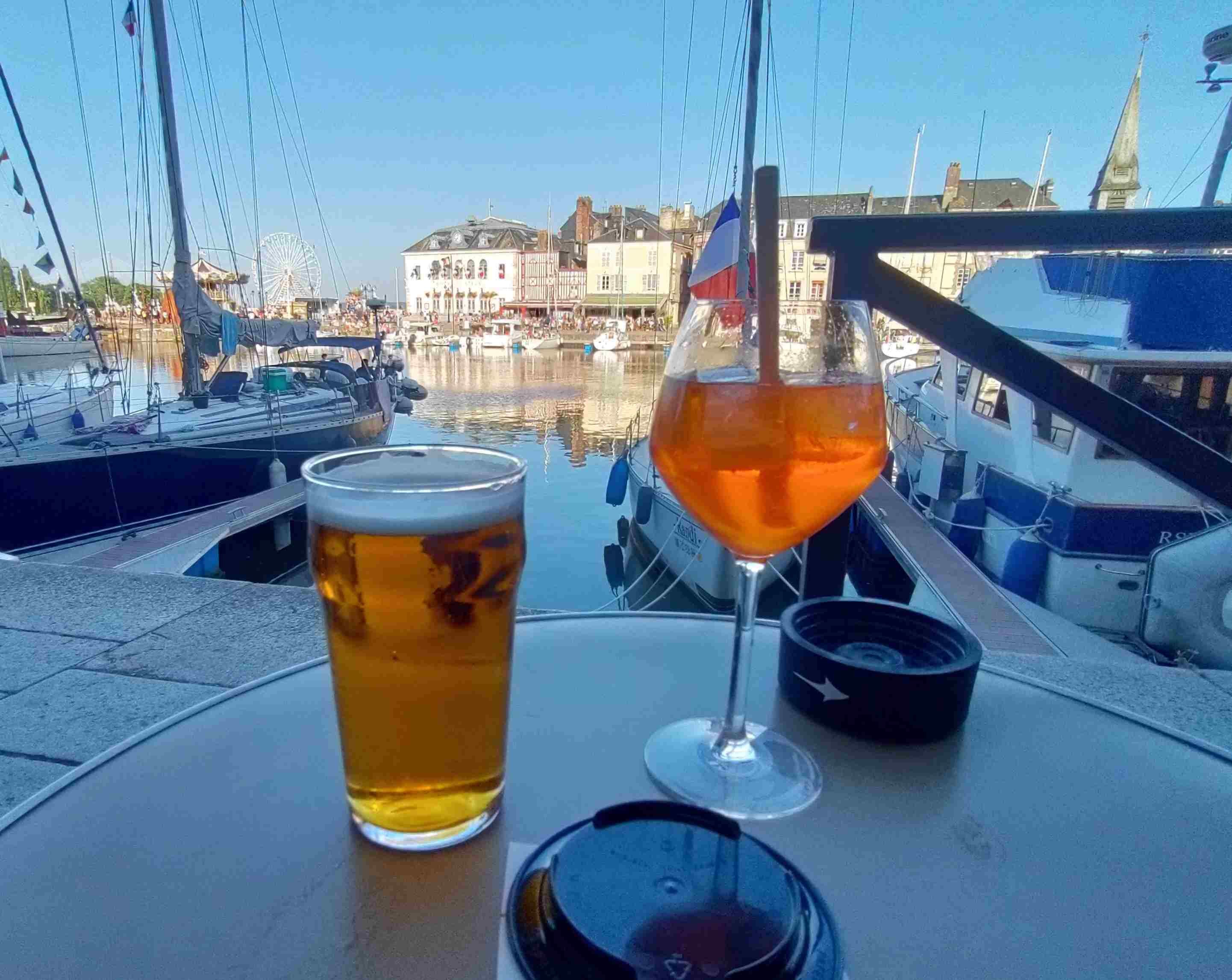 A lie down in the van and a read as it’s warm work wandering in the heat. We rouse ourselves around 7:45pm get changed and walk back in. Find two lovely seats right on the dockside with great views and enjoy a drink. First aperol spritz of the holiday for me. Unfortunately food has finished here at 8pm. We move on and manage to find another restaurant easily enough and avoid having to queue. The staff are rushed off their feet but eventually we get a drink and order food. Moules in cider for T which seem to be an Honfleur speciality. Loiter over our food and drink and watch the lantern parade until we’re almost thrown out at 10:45pm. Not bad as the fireworks are due to start at 11pm.