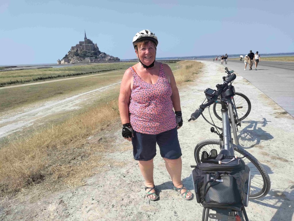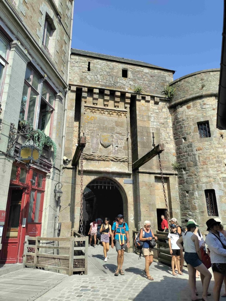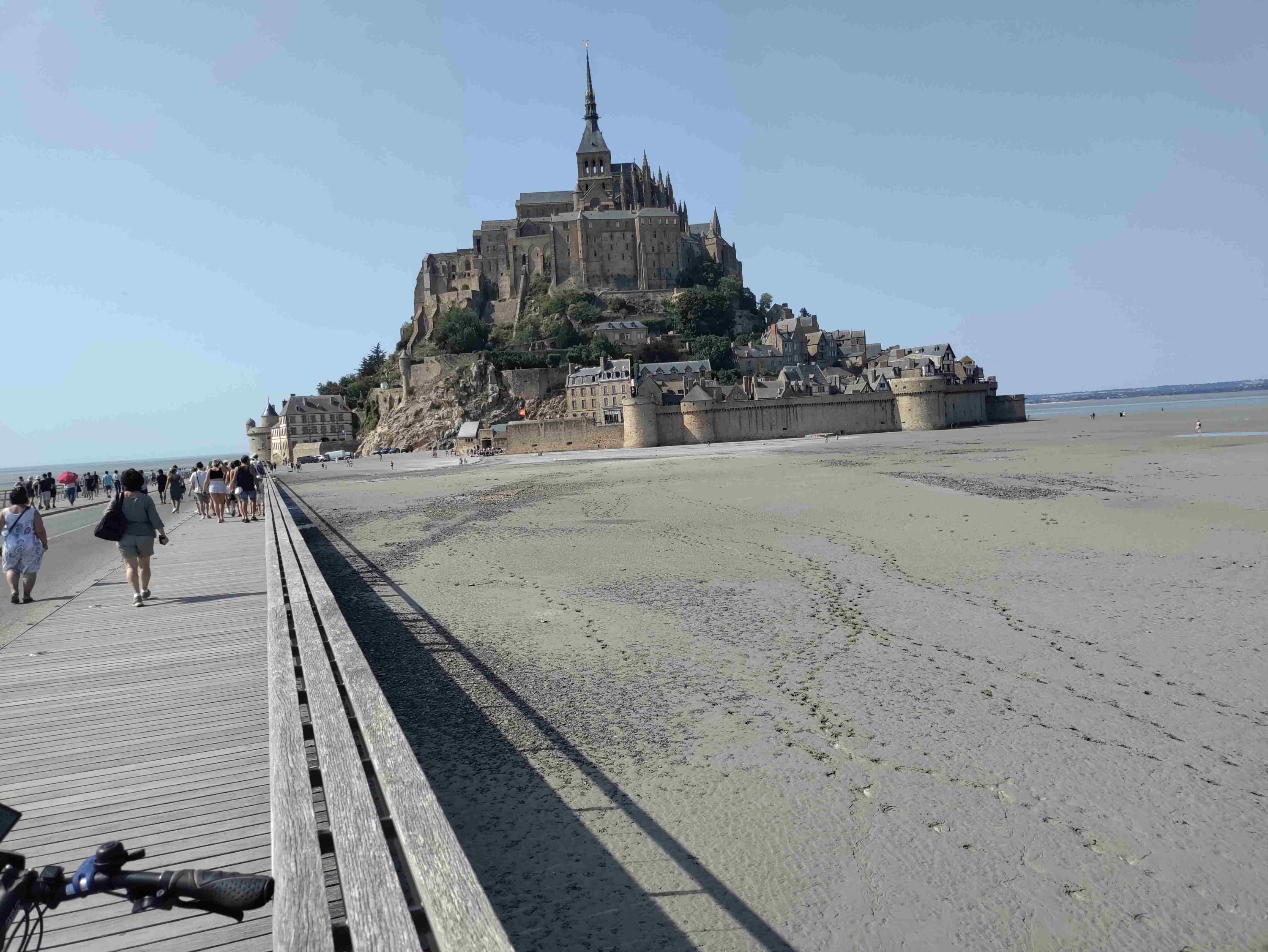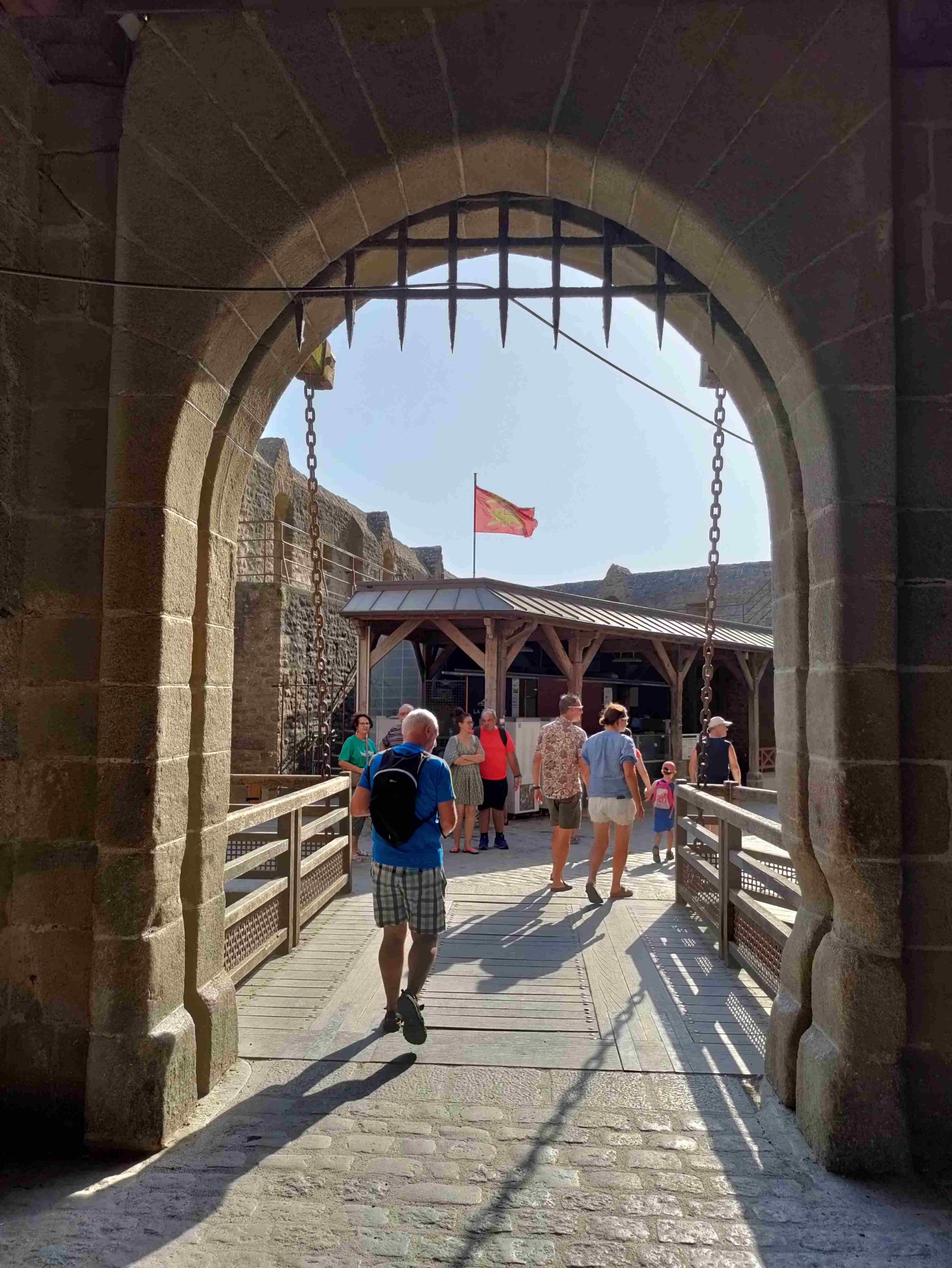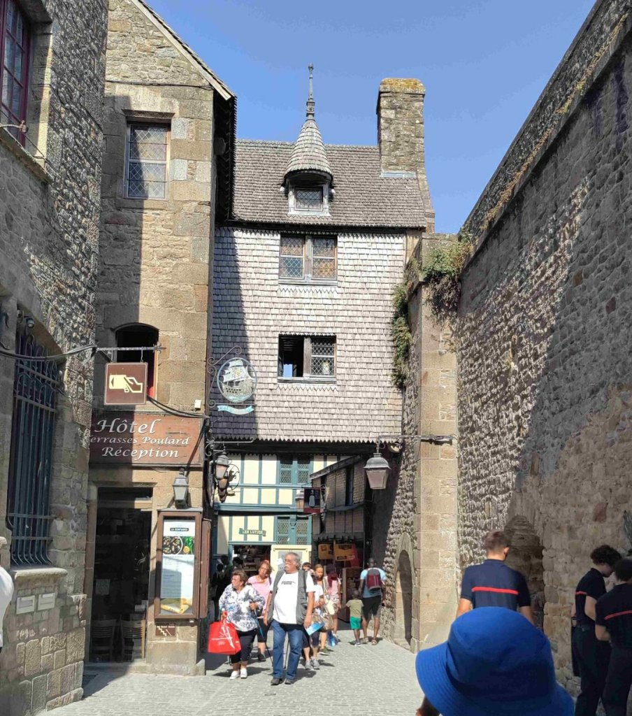 We cross over the causeway that looks like a low bridge. The tide is out and the Mont stands high in a sea of mud flats. We park our cycles and helmets at the base and as soon as we walk through the arch we realise how busy it is especially on the lower levels. It reminds me of Hogsmead in Harry Potter with its narrow winding streets and old buildings. Everything has between 50&100% added to its price even water.