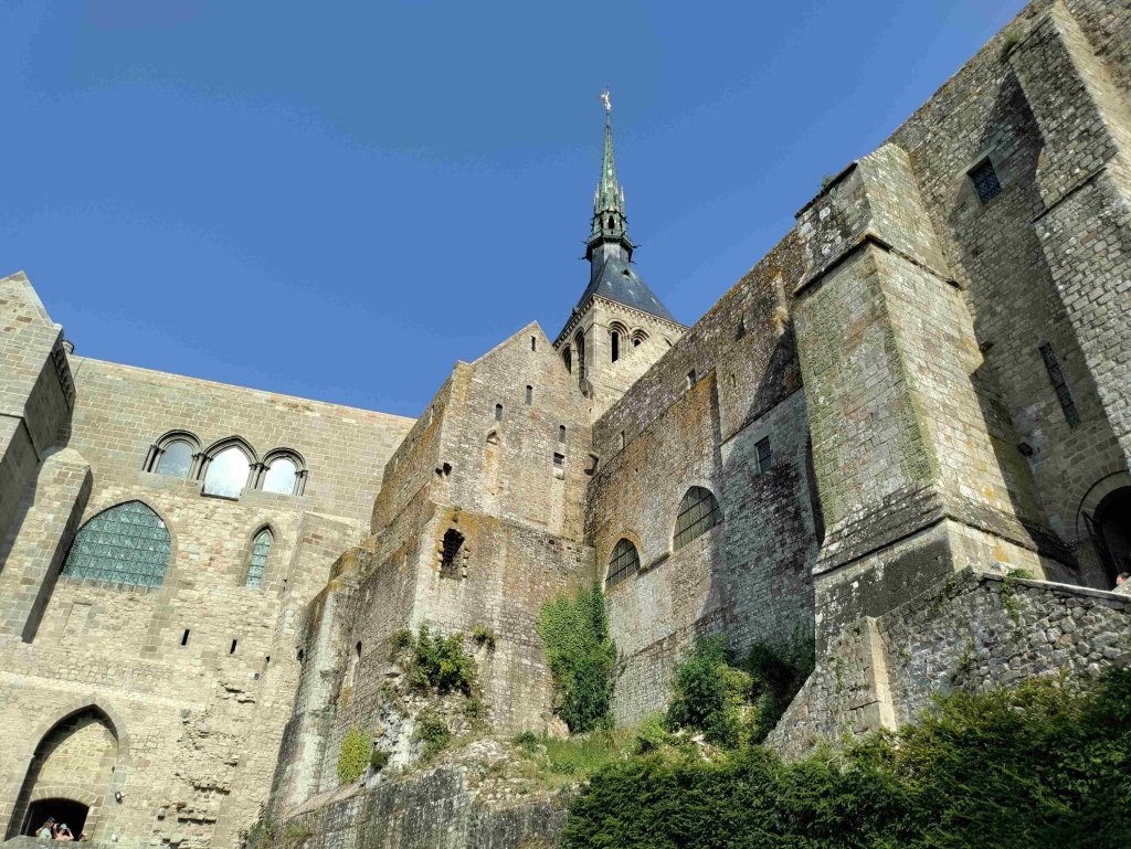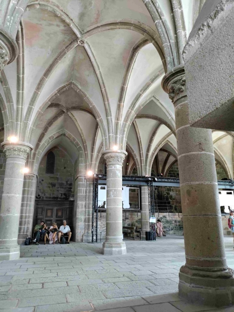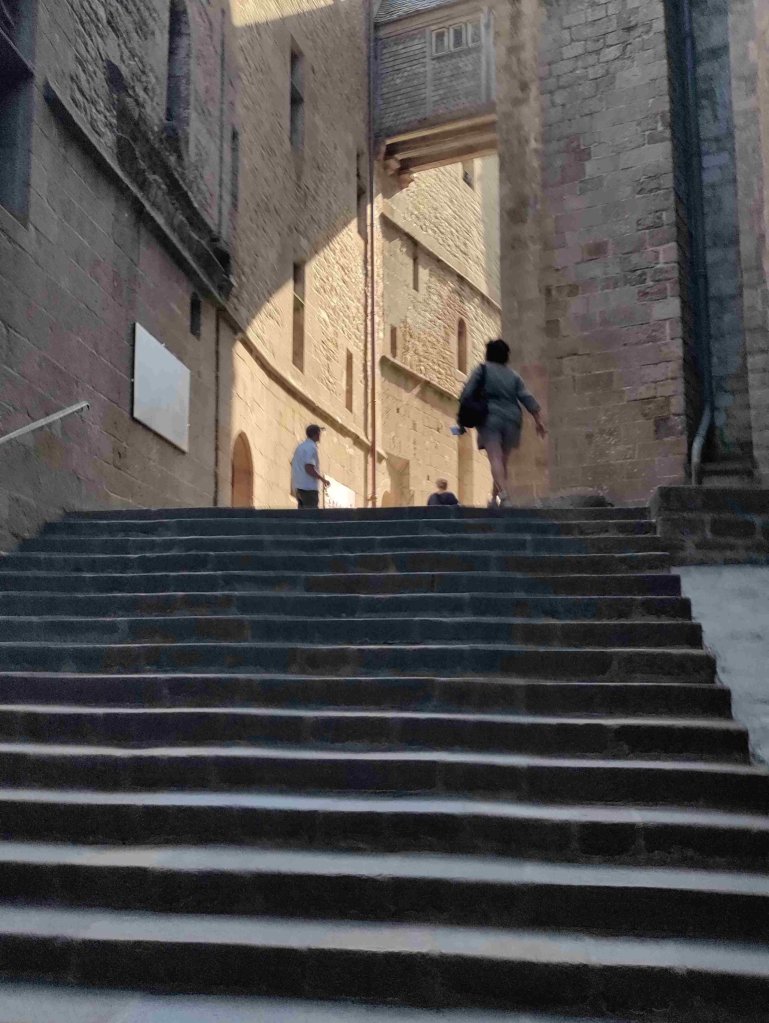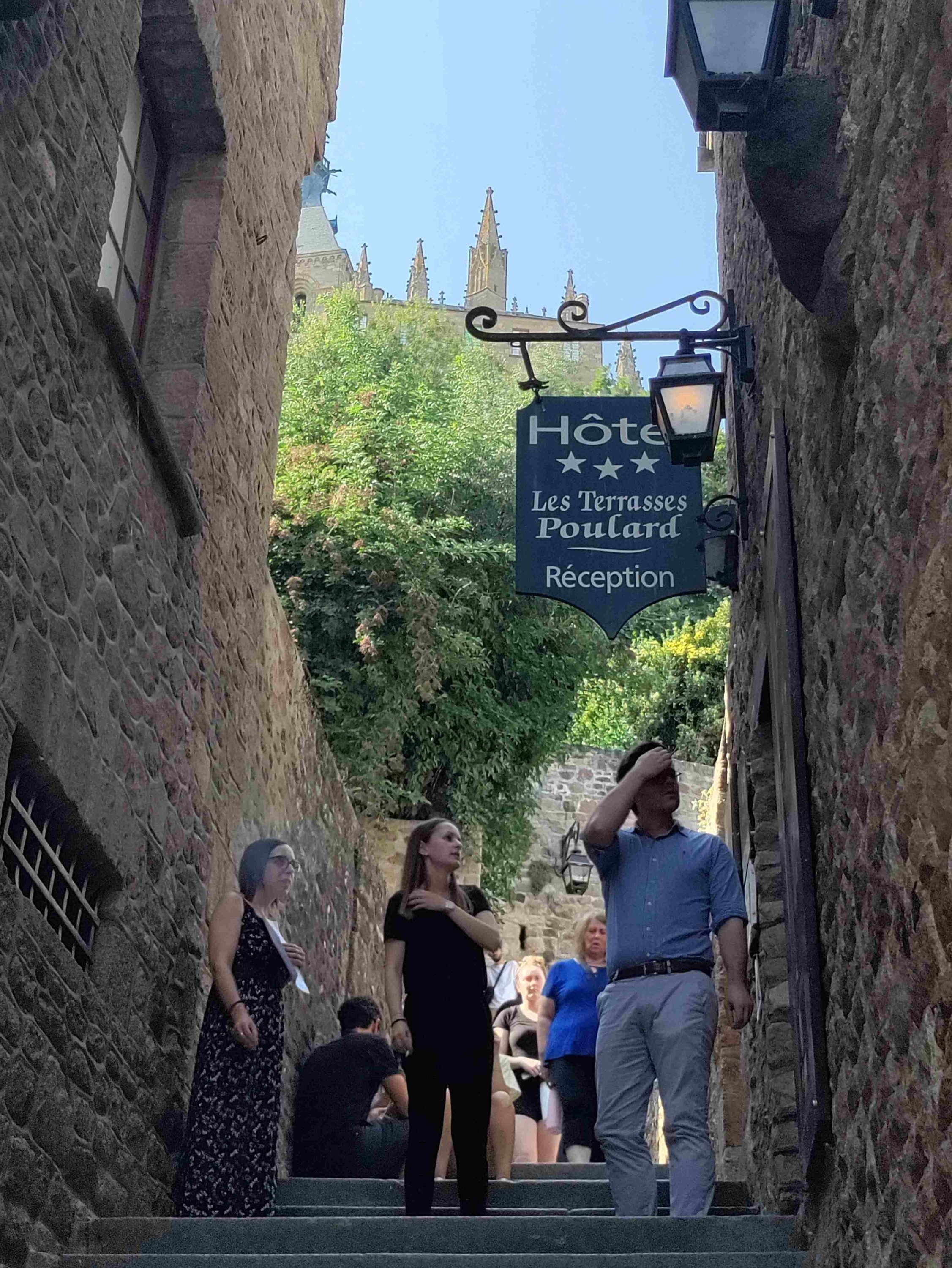 Then it’s on and upwards towards the base of the Abbey. And then there are lots and lots of steps and more steps to the abbey chapel which is the highest point of the tour and the top of the Mont. Luckily the steps are almost all in the shade. We enjoy a walk through the various levels down through the Abbey with fantastic views from a terrace and eventually we are back where we began.