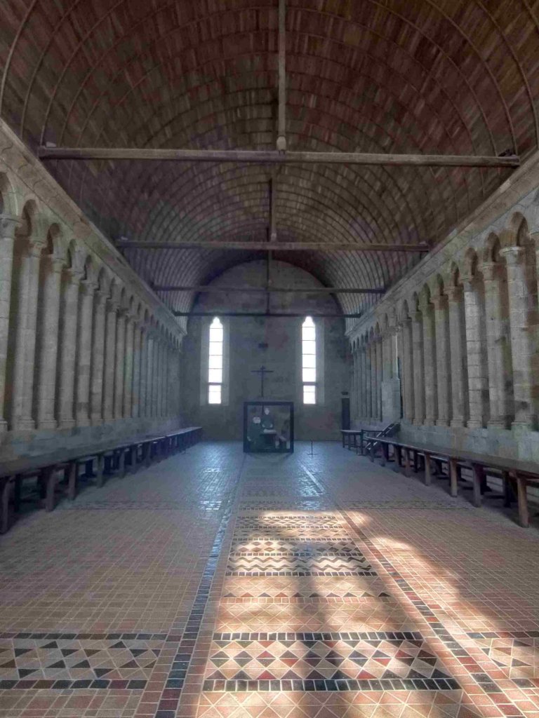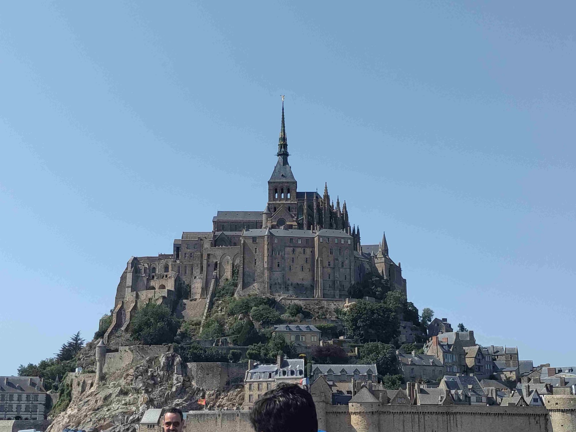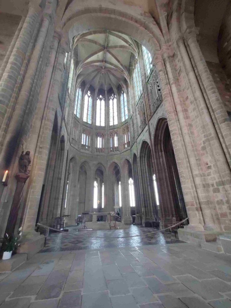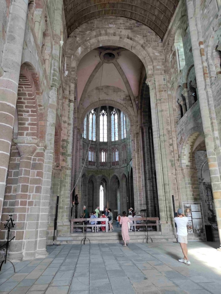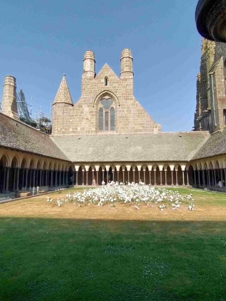 Then it’s on and upwards towards the base of the Abbey. And then there are lots and lots of steps and more steps to the abbey chapel which is the highest point of the tour and the top of the Mont. Luckily the steps are almost all in the shade. We enjoy a walk through the various levels down through the Abbey with fantastic views from a terrace and eventually we are back where we began.
