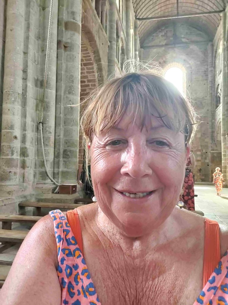 We basically walk upwards towards the Abbey through winding streets. I need a moment and a sit down at one point feeling very hot,sweaty and red faced after the cycle ride. Our next stop is a church, an opportunity for a seat and a cooler space.