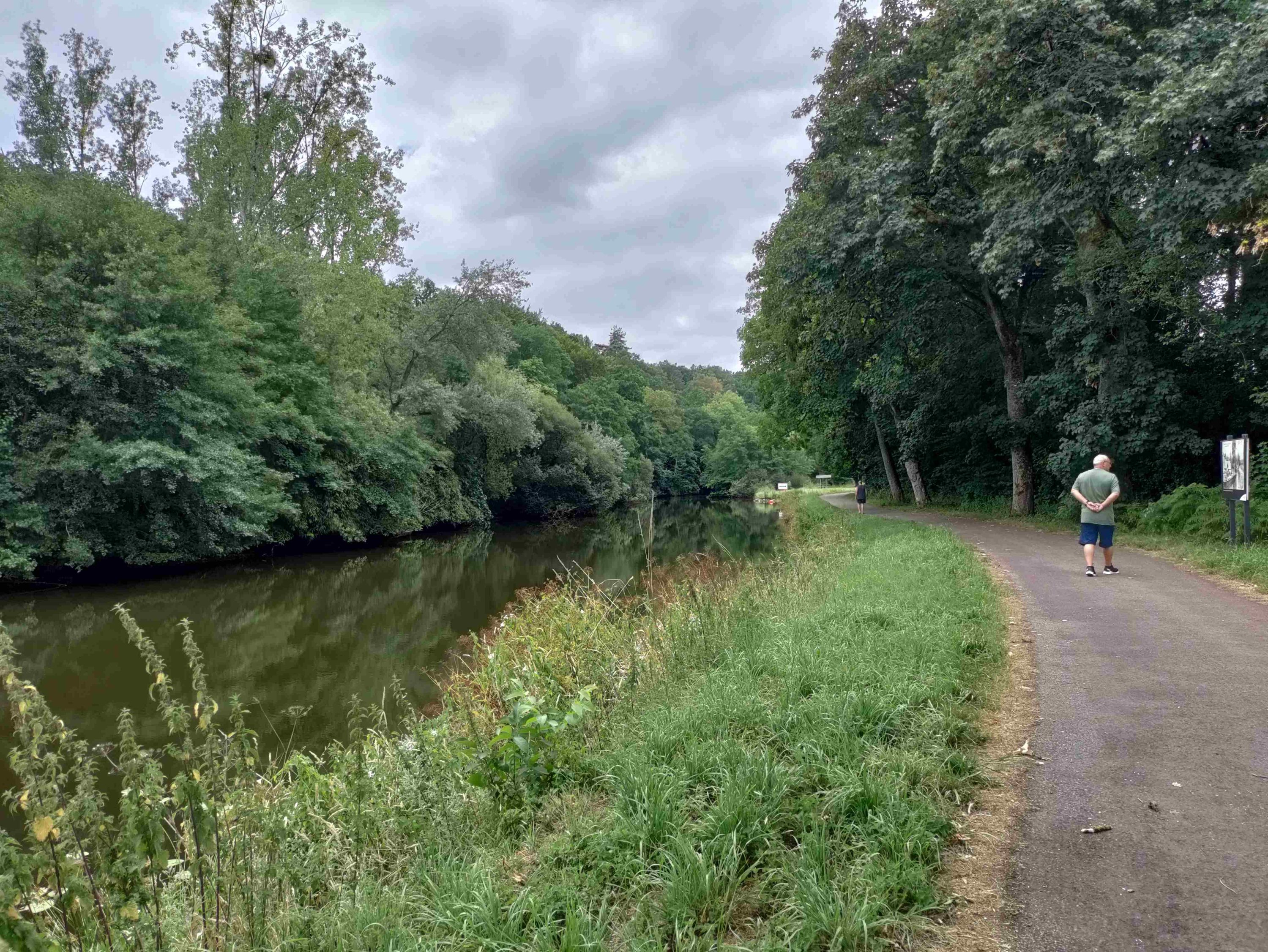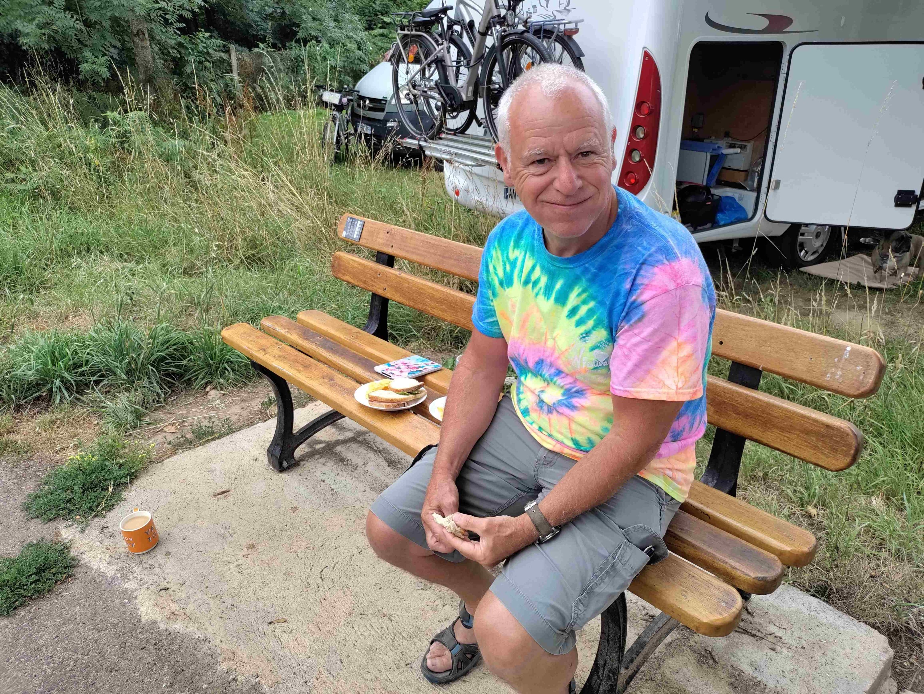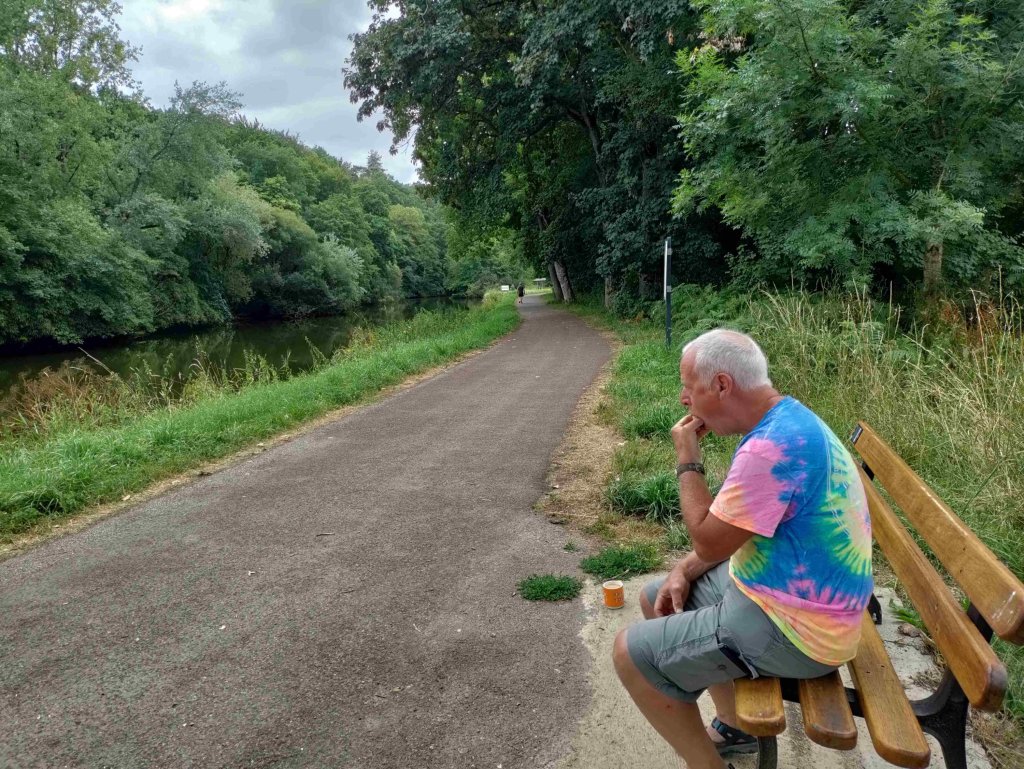 Once settled we have lunch on a bench on the canal just by our van and watch the world go by including a boat and a couple of canoes. Everyone passing says Bonjour and most Bon Appetit too.