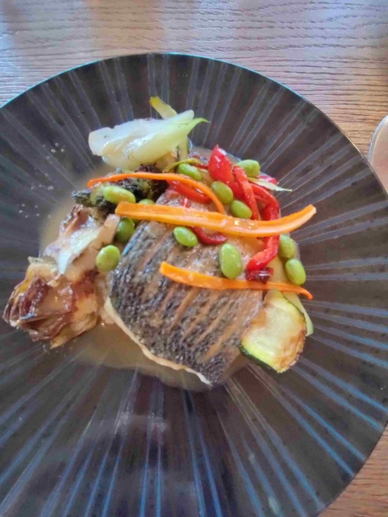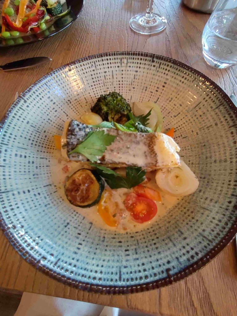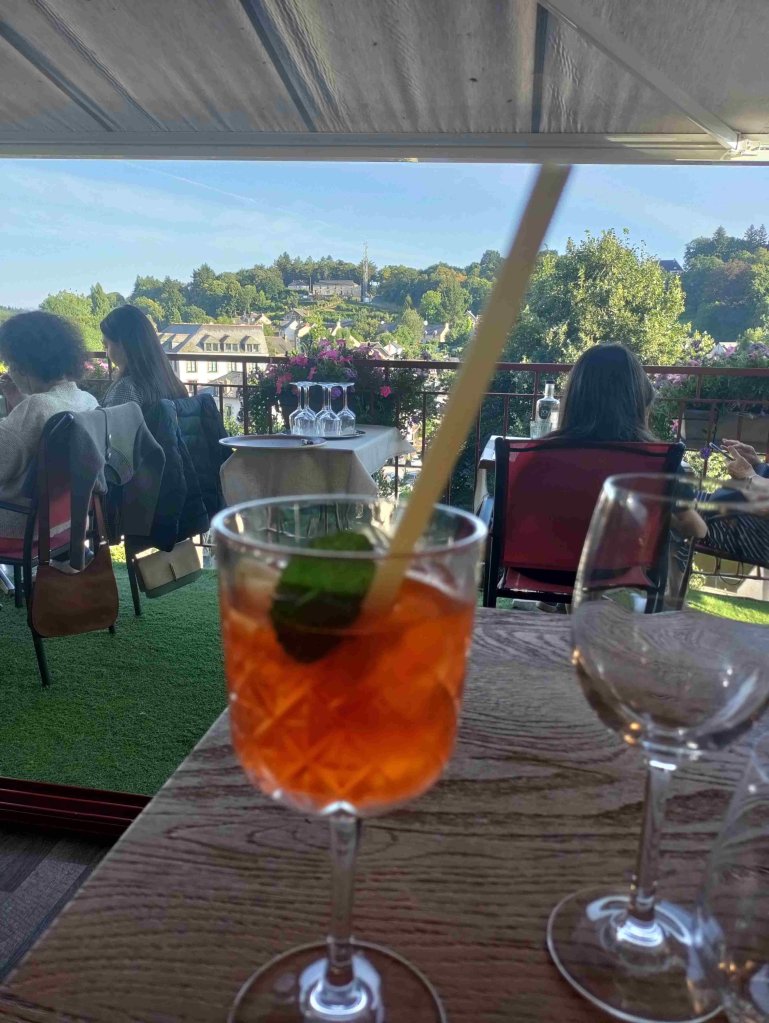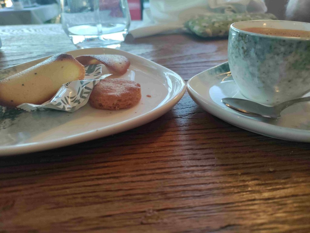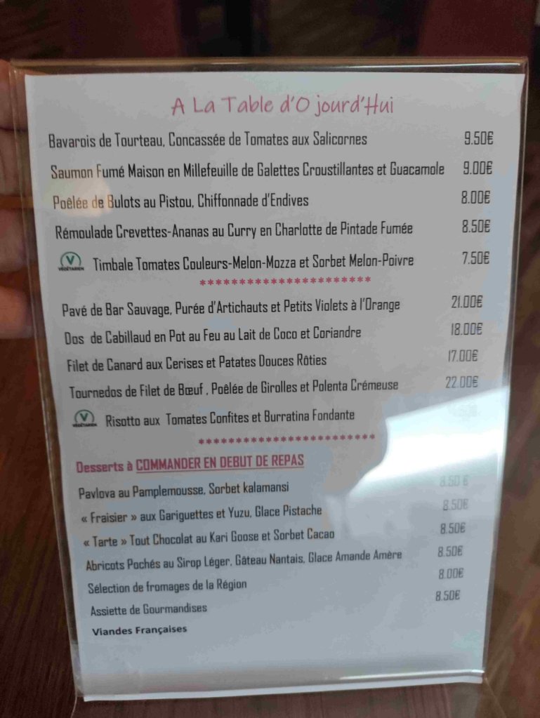 Tonight will hopefully be a treat as we are eating out at a highly recommended local restaurant La Table d’Or. It does not disappoint. The food is wonderful, I enjoy Wild Bass and T has Cod both served with all sorts of yummy bits and sauce. A proper treat served in a restaurant with a great view and I discovered Chablis too! The coffee was to die for apparently.