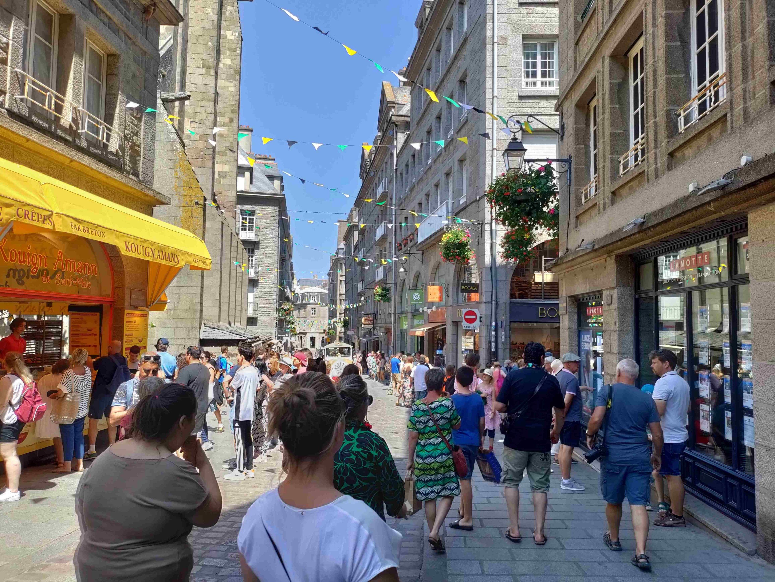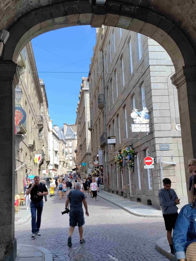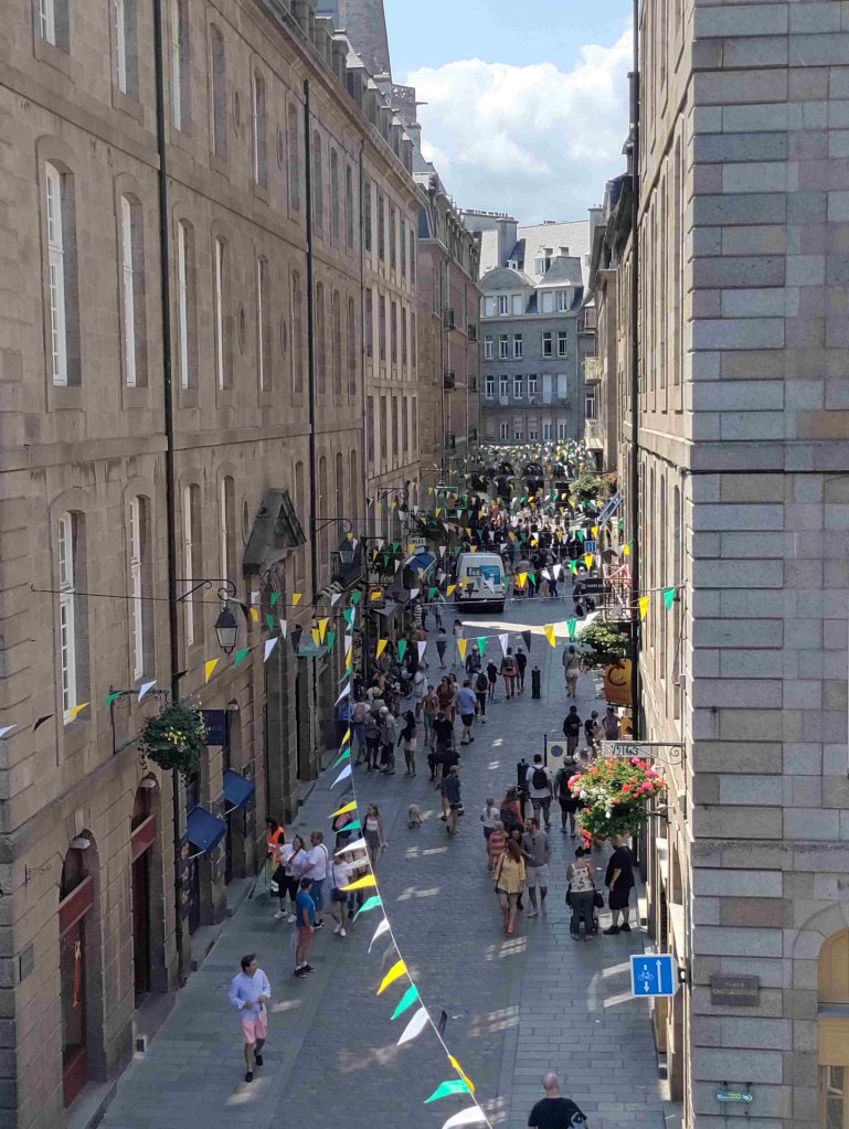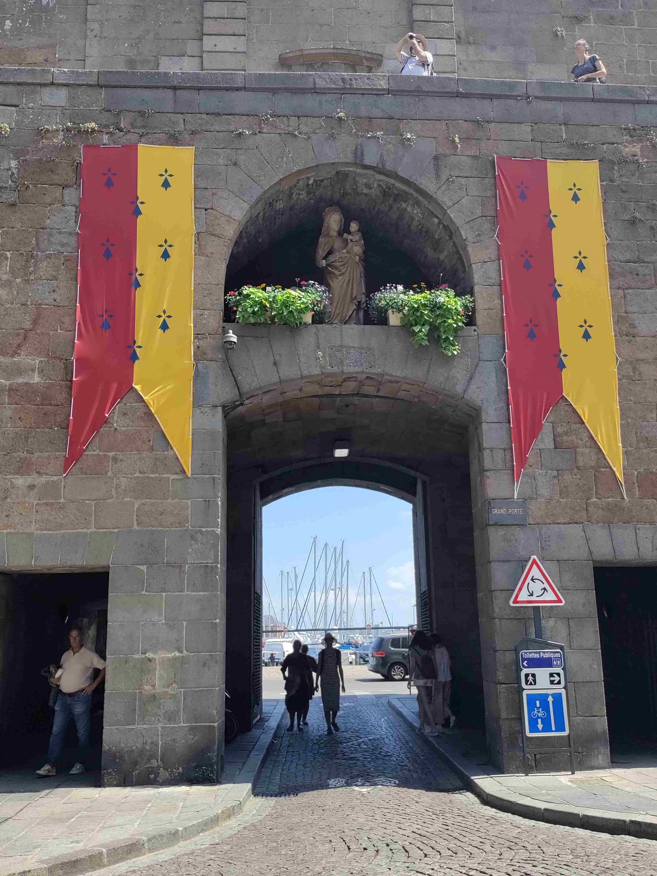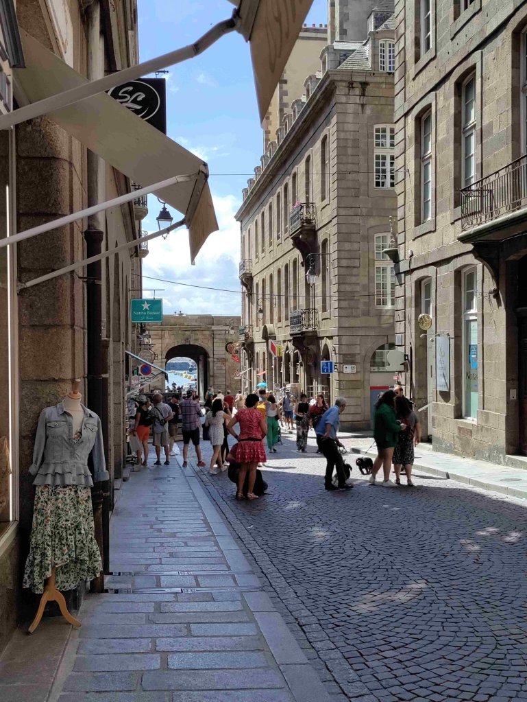 The walls surrounding the old city are now visible. This was once the haven of corsairs, basically pirates approved by the king. The city was badly bombed in WWII but restored after the war. It’s a pretty place with narrow cobbled streets and flowers and bunting everywhere.