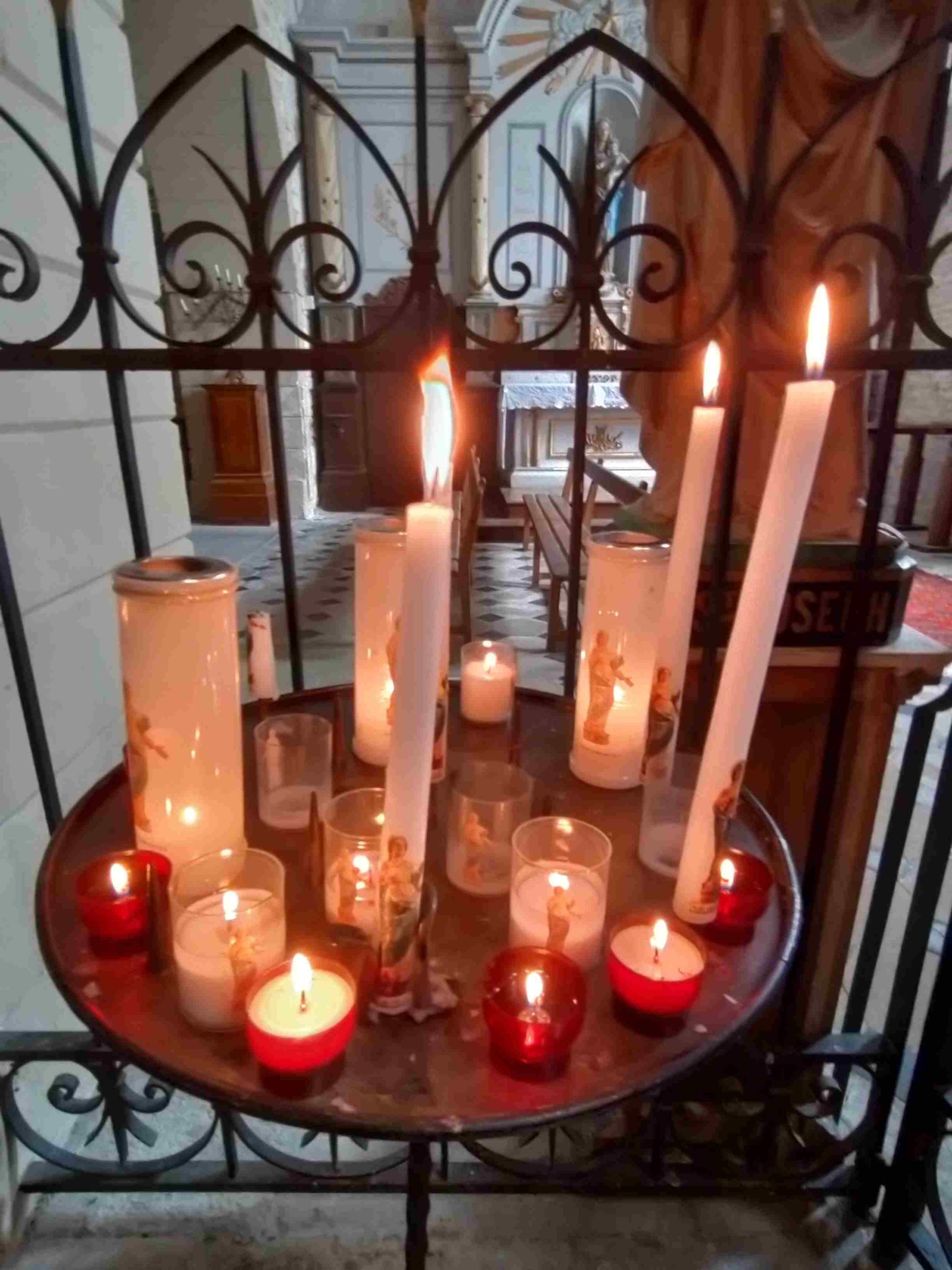 Straight out again into Chateau d’Oléron town through another citadel gate. Looking for the tourist information we come across a church. Very dark and dower inside but we light a candle and have a wander.