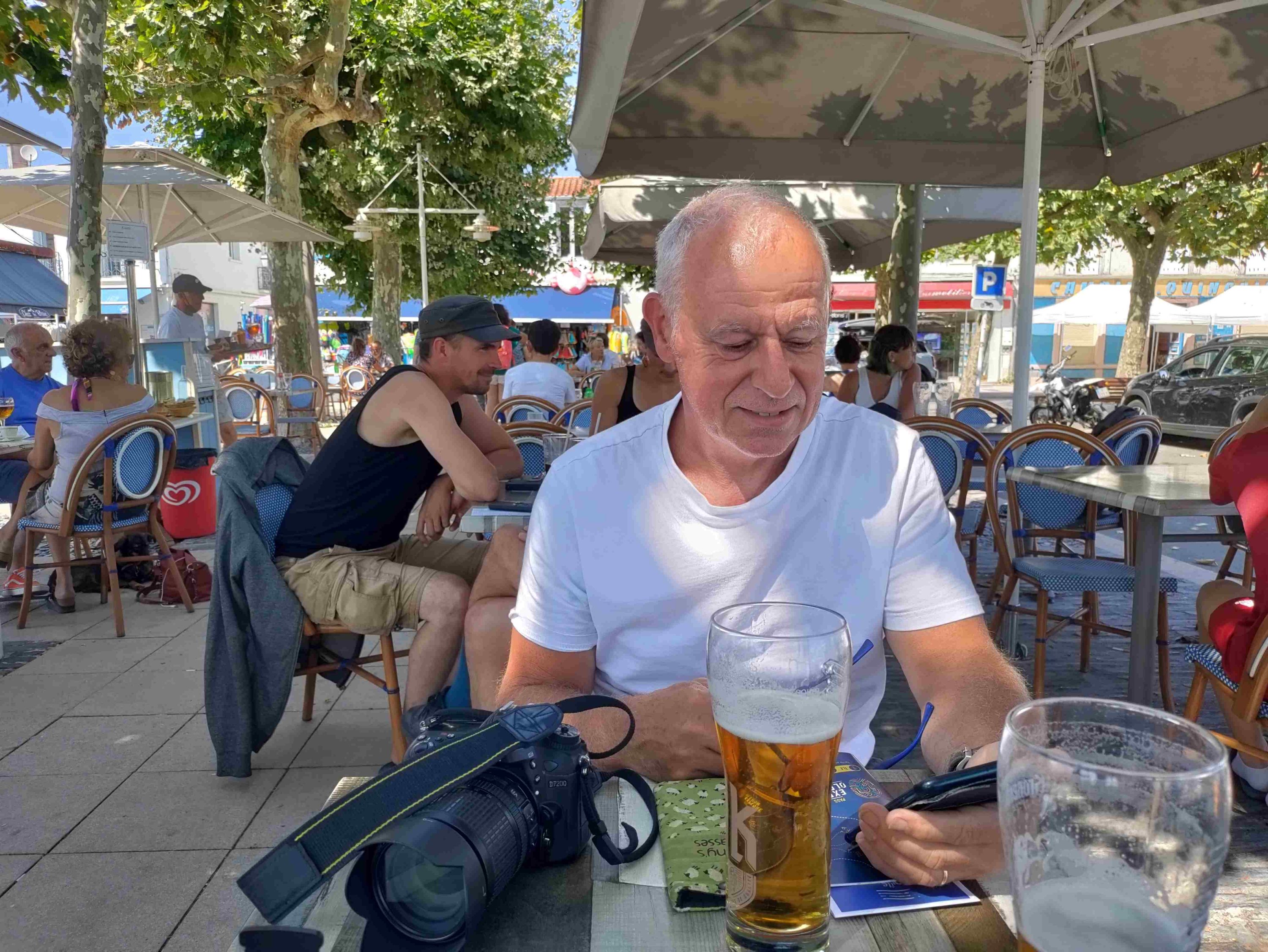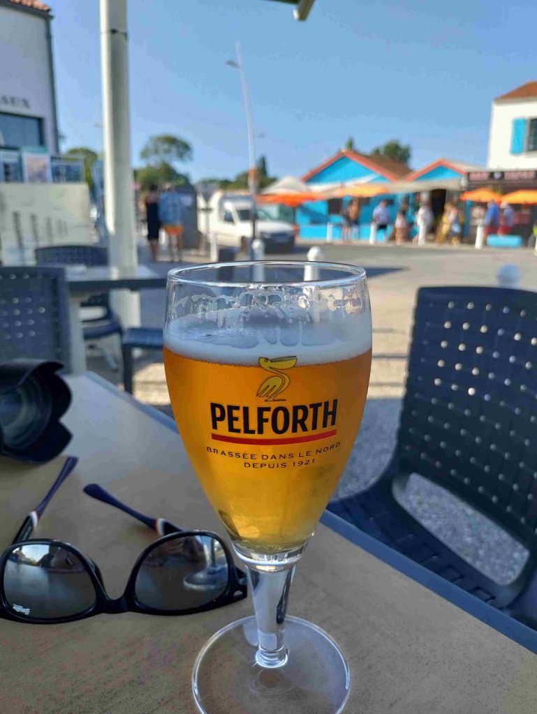 Treat ourselves to a lovely painted oyster shell as a Christmas decoration. It’s currently set up to sit on a shelf rather than hang so we go and find a cold beer whilst adjustments are made. Pelforth this time also good.