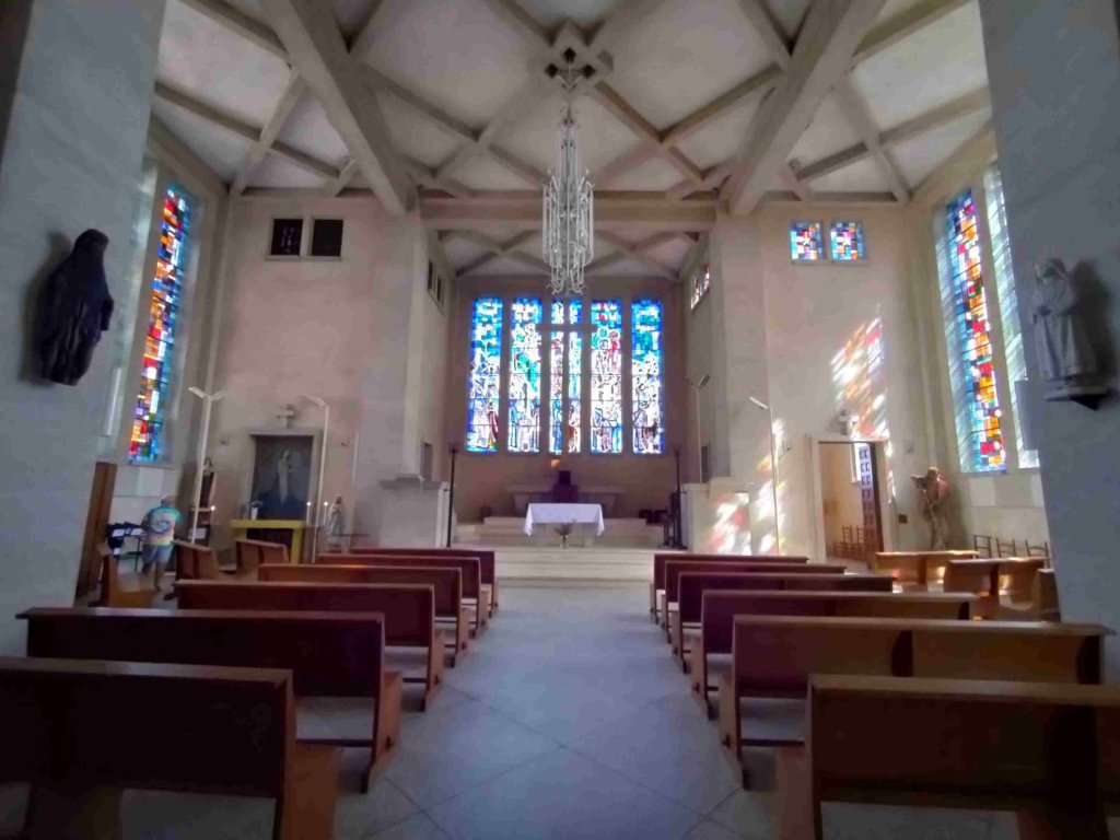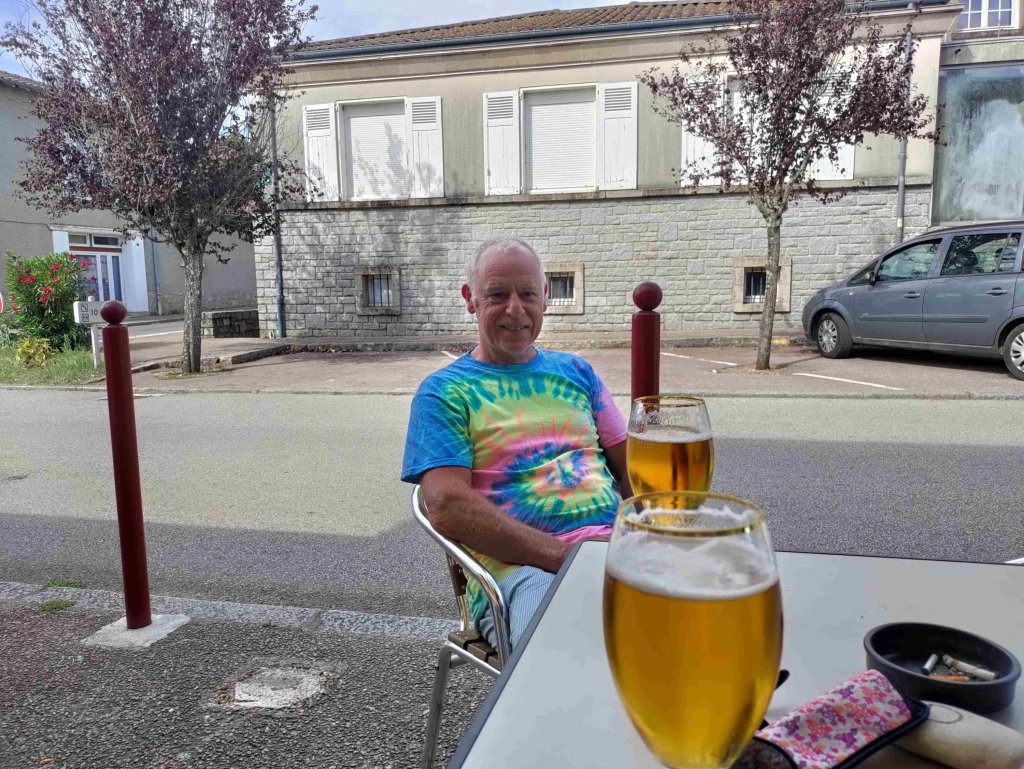 We walk back into the new village, rebuilt alongside the original after the war. A quick visit to the church and then onto the main street where we buy bread and have a beer.