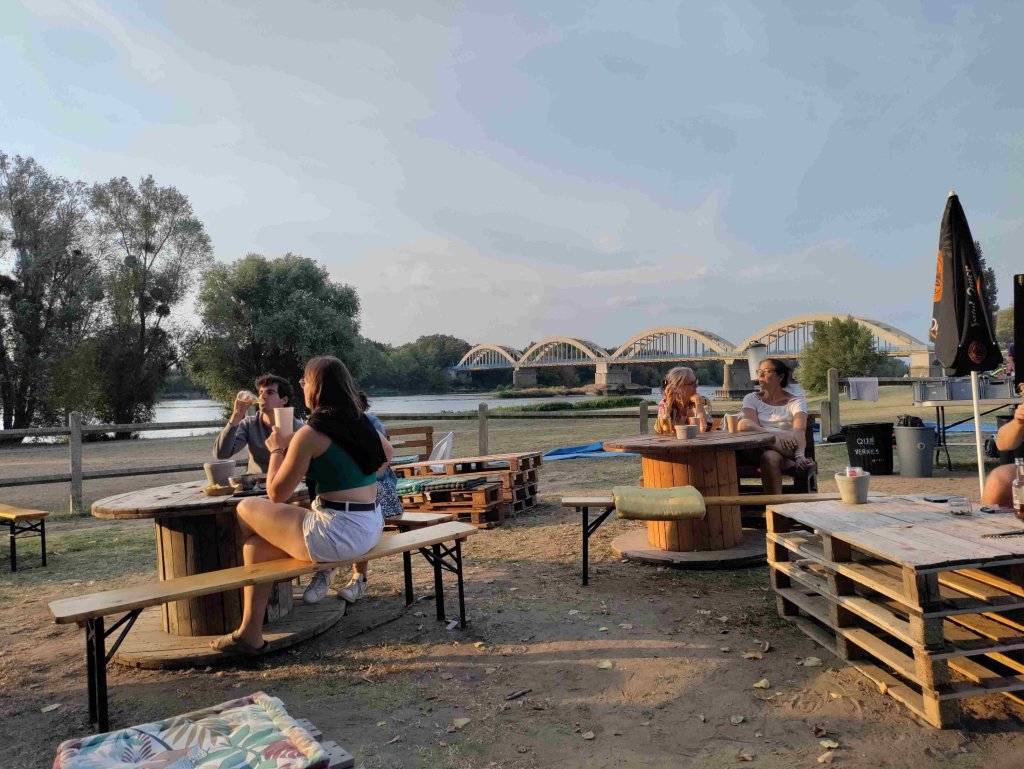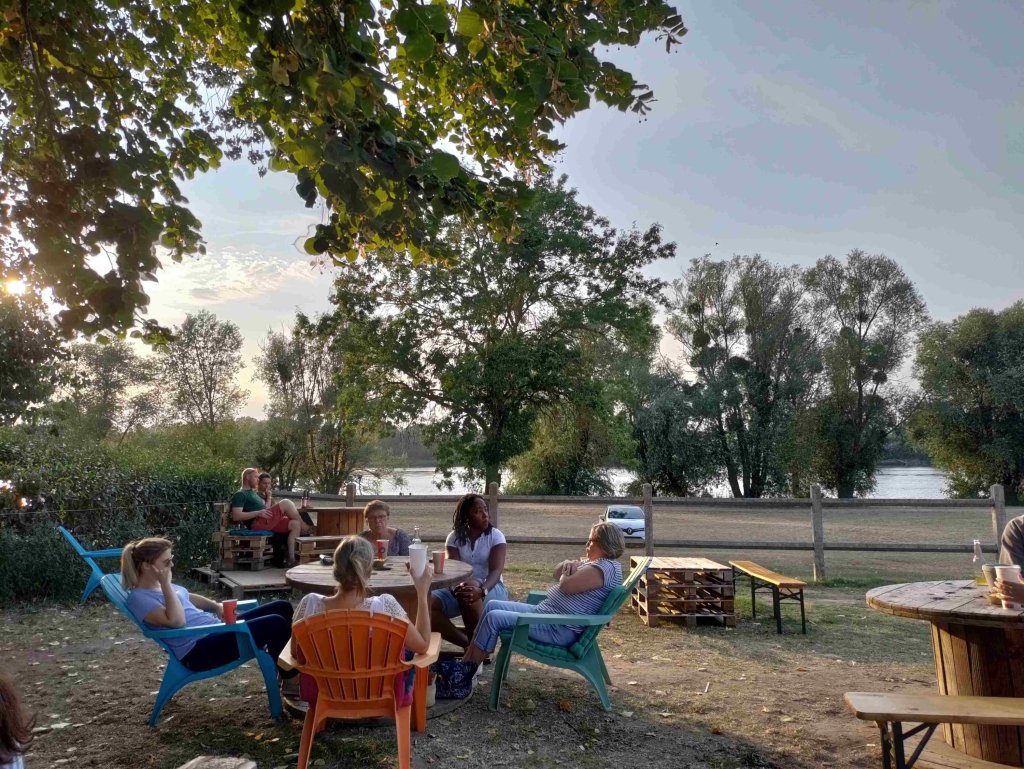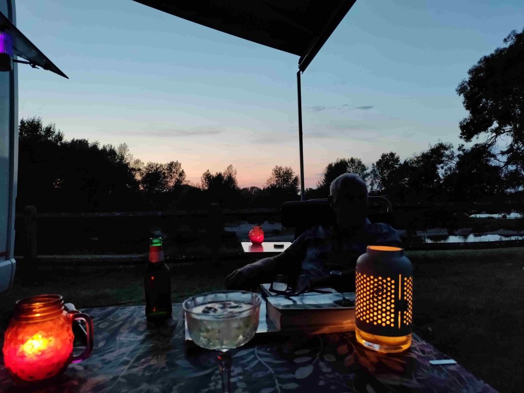 We rouse ourselves to walk to the campsite bar after eating. It’s a lovely evening now. Warm but not too hot. The pression beer Jupiler is finished so we make do with bottled beer.