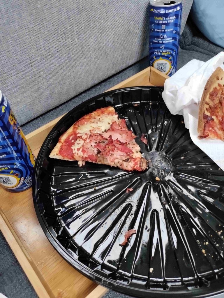 We find our room on level 7 and our seats. We end up having a whole row of six seats to ourselves as the room is only about 20% full. After a cuppa the lights are turned off about 11:30pm and then the snoring starts. There’s a guy on the floor that basically snores loudly most of the night. We can stretch out across three seats each but in the end I sit up to sleep. Drop off eventually about 2pm. Lights on again at 5:45am so Brittany Ferries can sell us all breakfast.