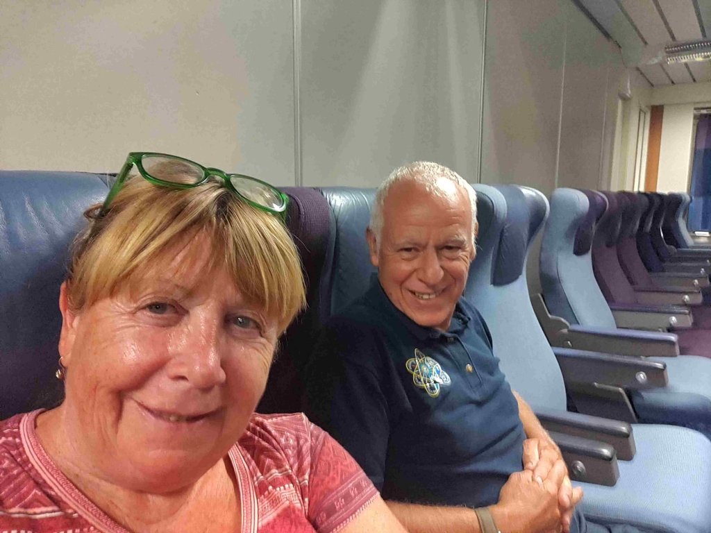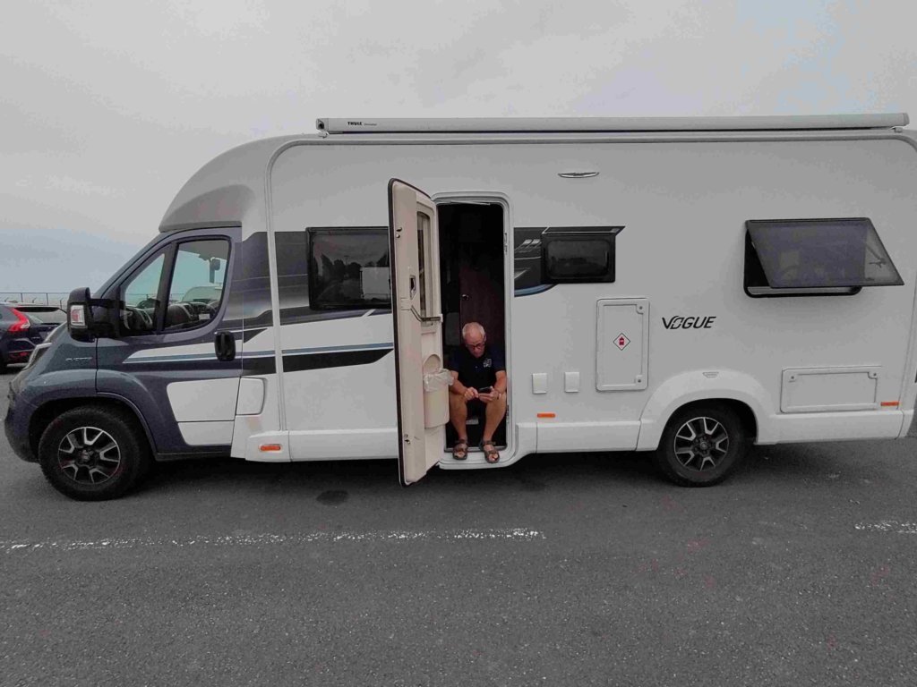 The caravans and motorhomes are checked by security to ensure no-one is hiding in them. This is a first for us. Pizza for tea and a bit of kindle time and then it’s through passport control and into a second queue. About 10:30pm we are loaded onto the ferry.