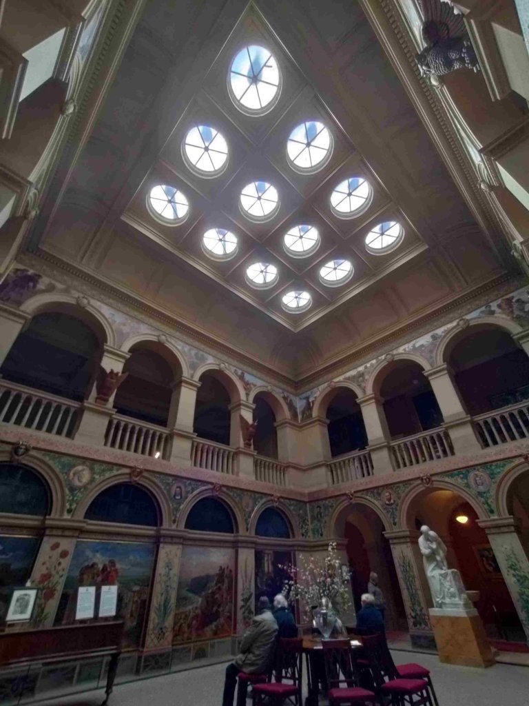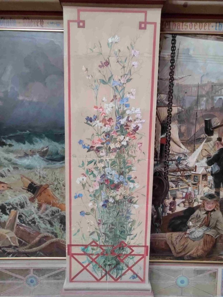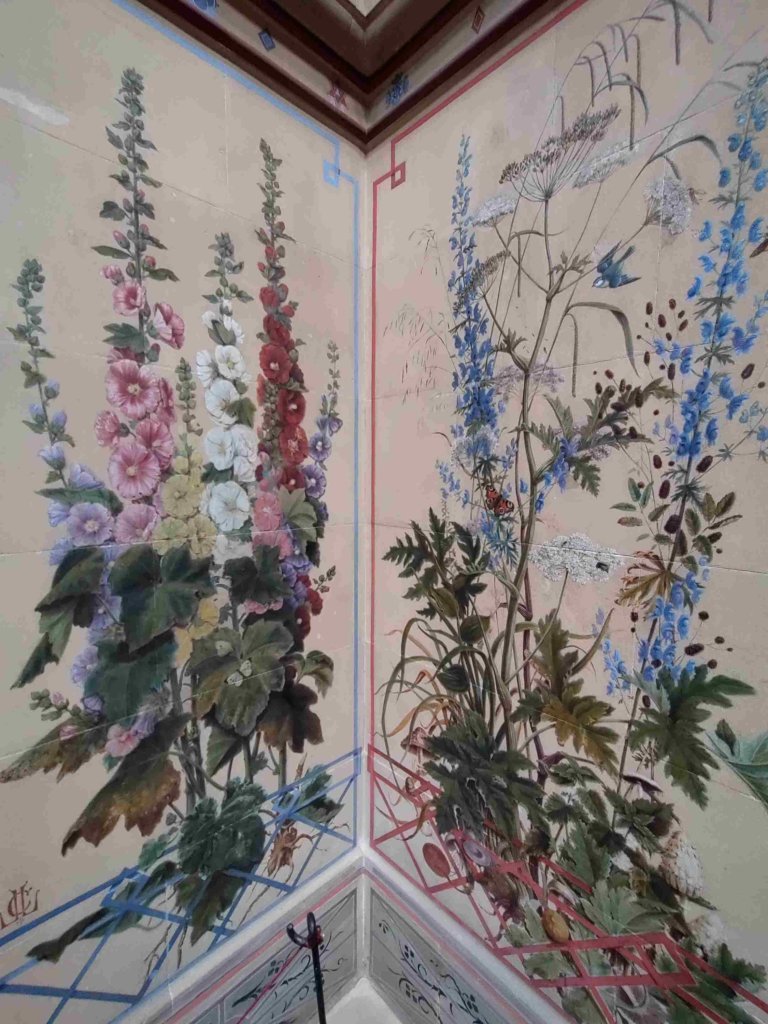 The atrium’s walls, the social hub of the house back in the day are covered in flowers and murals.