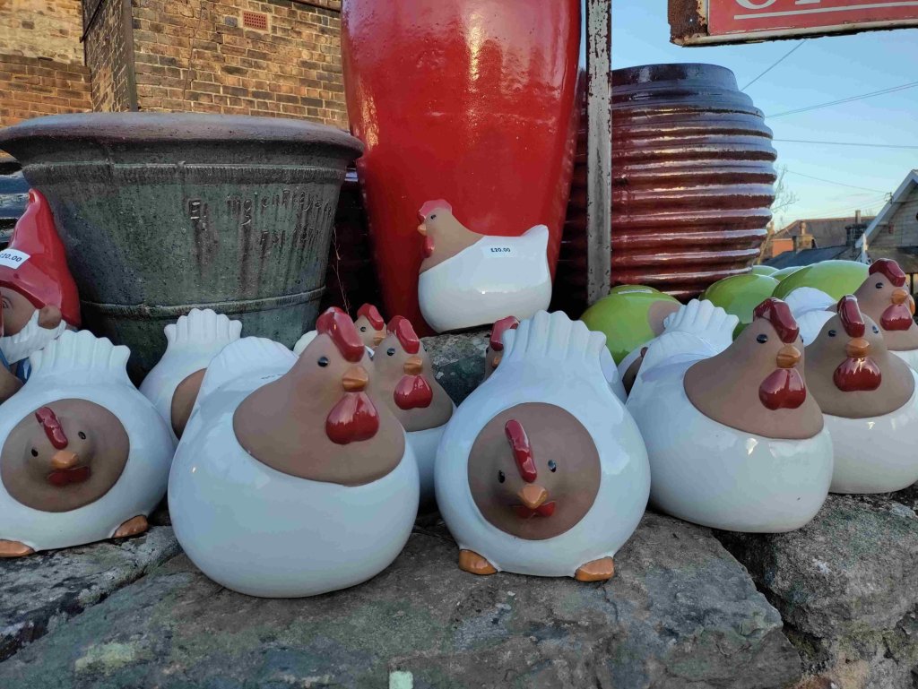 A welcome bit of lunch and a cuppa sitting outside in the sunny courtyard before buying a metal sculpture for our garden and our third and final fridge magnet.
