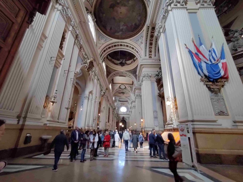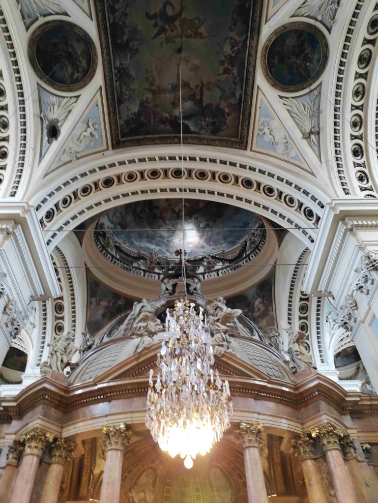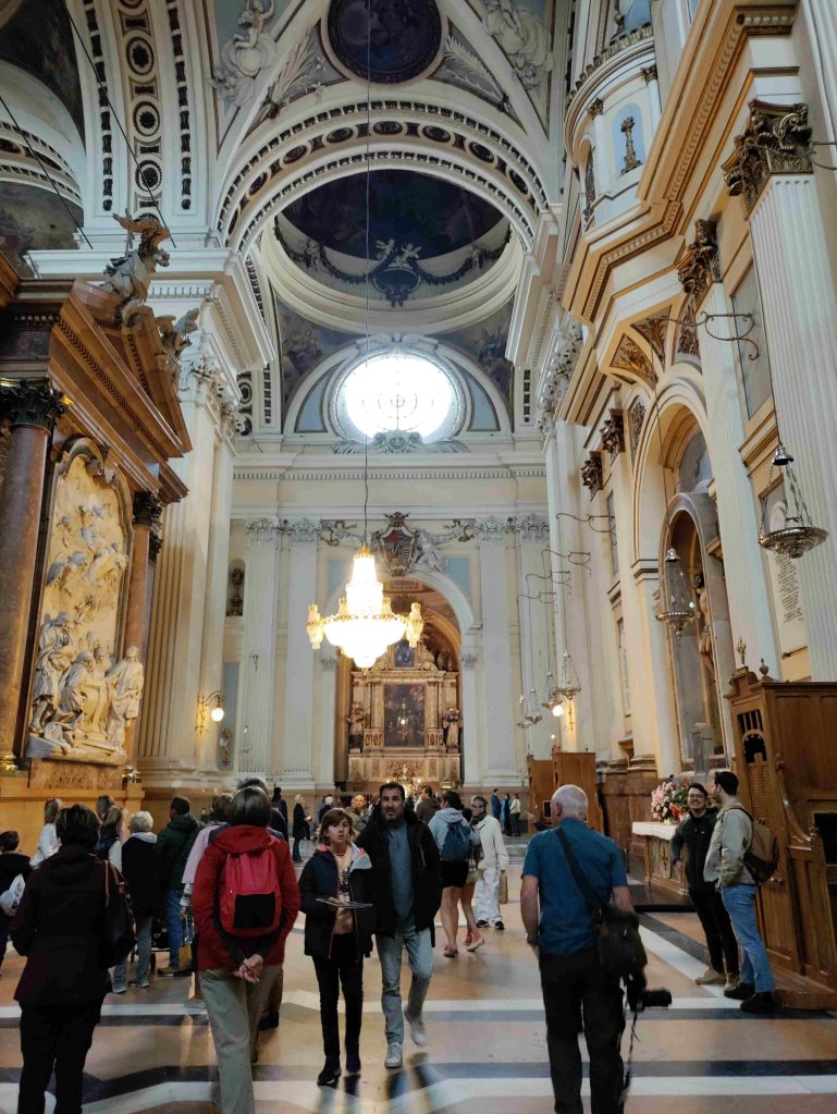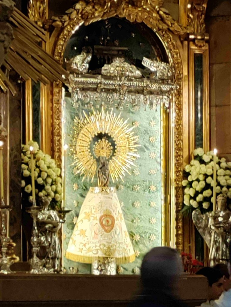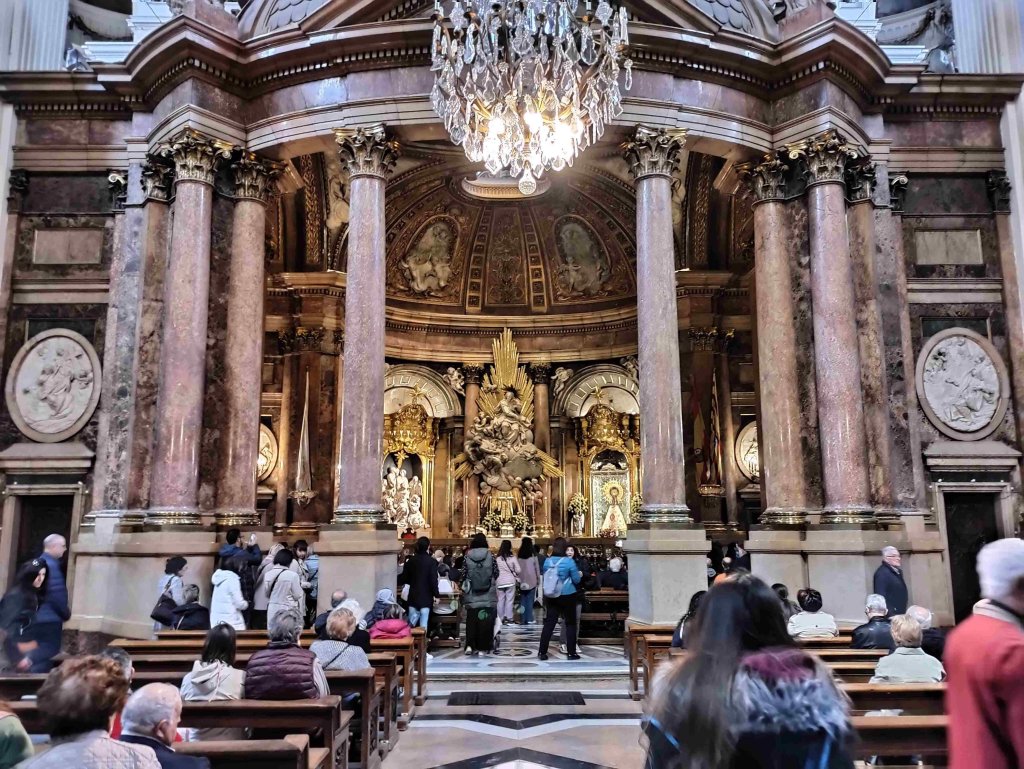 The Basílica de Nuestra Señora del Pilar is an enormous Baroque cathedral topped with colourful tiled small domes aka cupola. The architecture is amazing. Inside the basilica is ornate and opulent and very busy with two different services on the go.